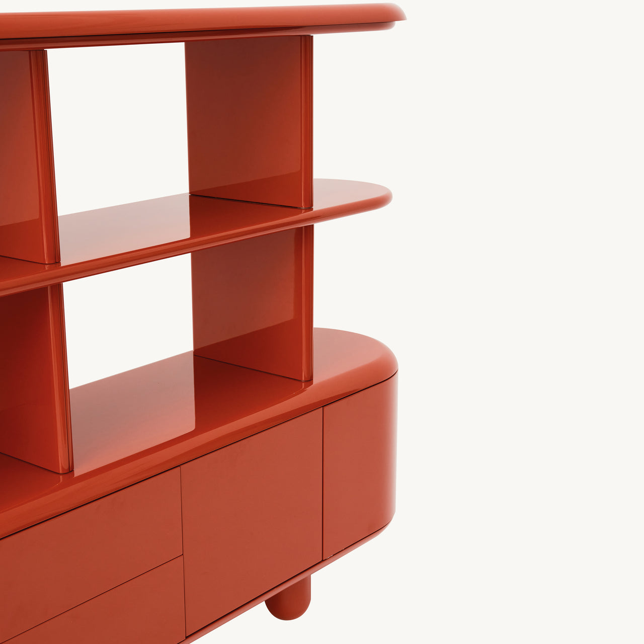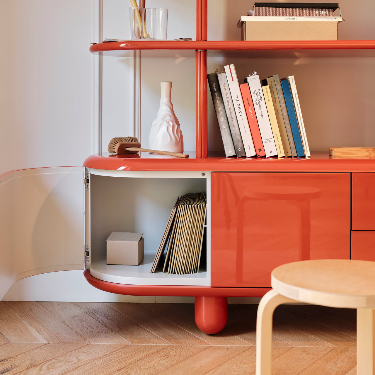 Playful wunderkind Jaime Halon adds a striking tall storage cabinet to his Explorer series, with open shelves atop a base unit that features both cabinets and drawers. A glossy lacquered finish heightens the curves of his organic design and contrasting matte colors on the interior surfaces add to the visual delight that comes straight from Hayon’s own cosmos.