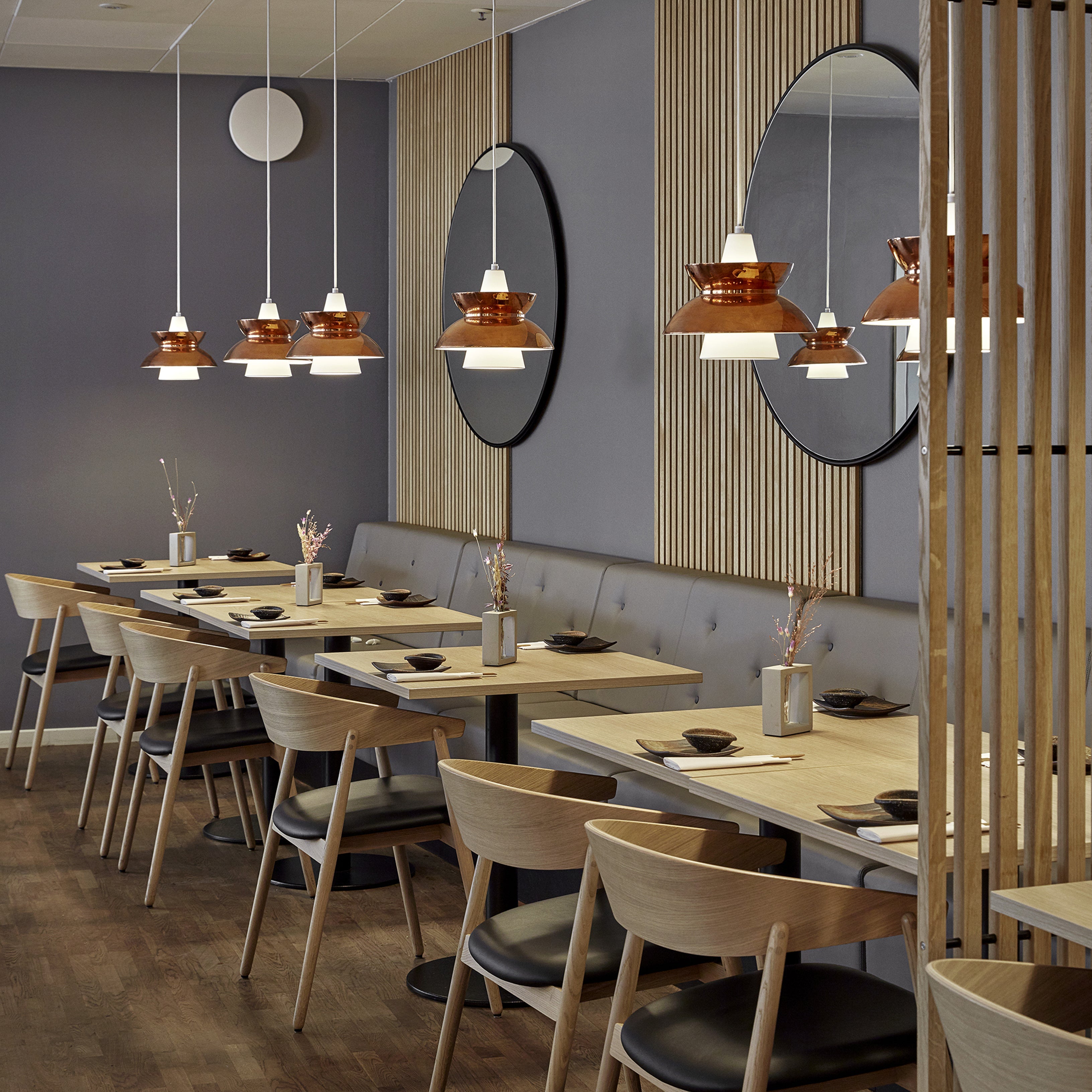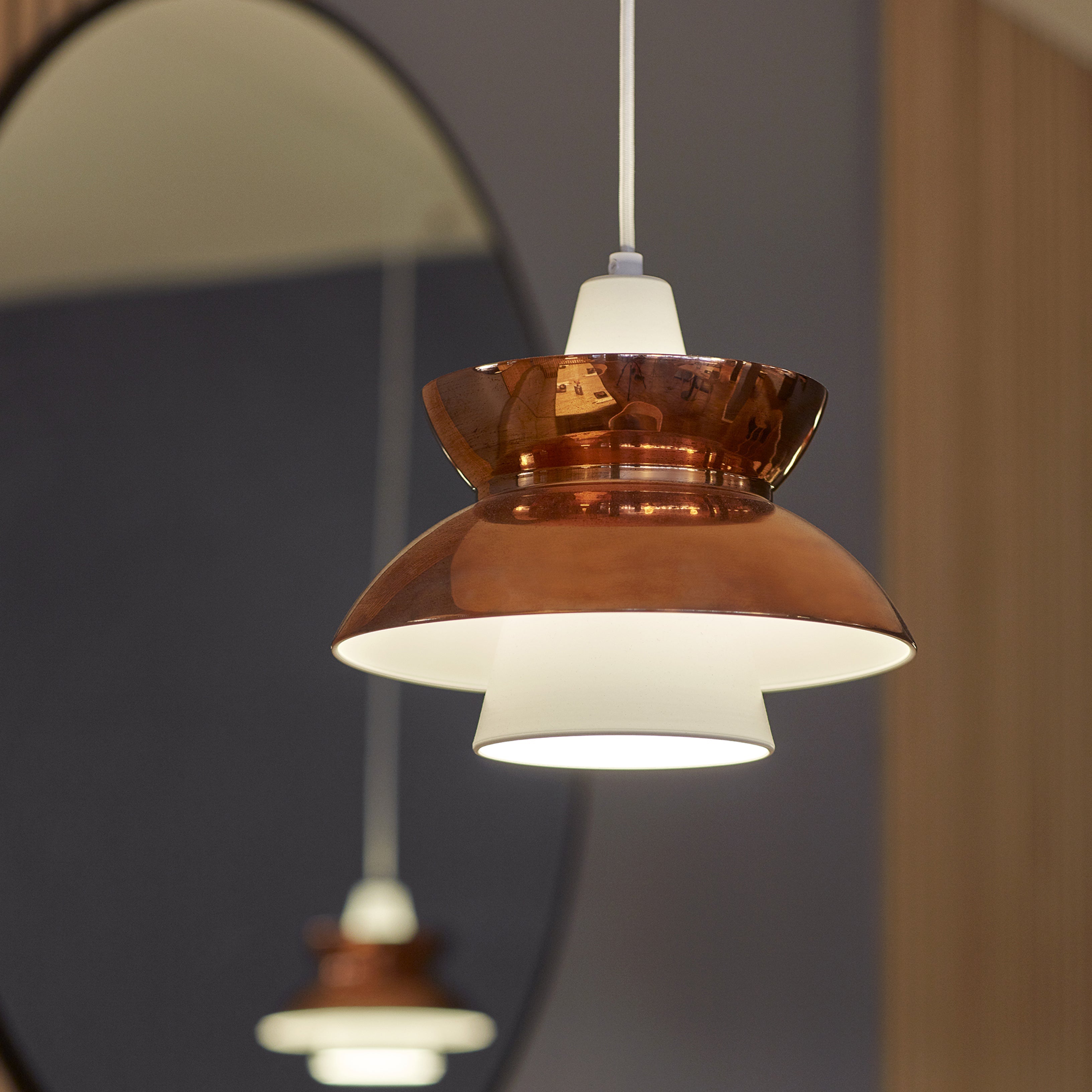 The Doo-Wop Pendant by Louis Poulsen, originally designed in the 1950s in collaboration with the Danish Navy Buildings Department, was widely used in naval canteens and offices due to its functional and versatile lighting properties. It was reintroduced in 2012 with updated colors and a brass version. The pendant is handcrafted using a spinning technique, with its distinctive inner and outer shades providing both direct downward and soft, diffused light. Available in various finishes, including brass, copper, stainless steel, and painted versions, it blends retro charm with modern aesthetics, making it a popular choice for both residential and commercial spaces.