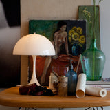 Originally designed in 1971, Panthella has since become recognized as one of Verner Panton's most significant designs and makes for a striking statement table lamp in the 400 version. The opal white form proves not only beautiful but also ingeniously functional, emitting a pleasantly diffused and glare-free light as the hemispherical top shade directs light downward, reflected by the trumpet shaped base.