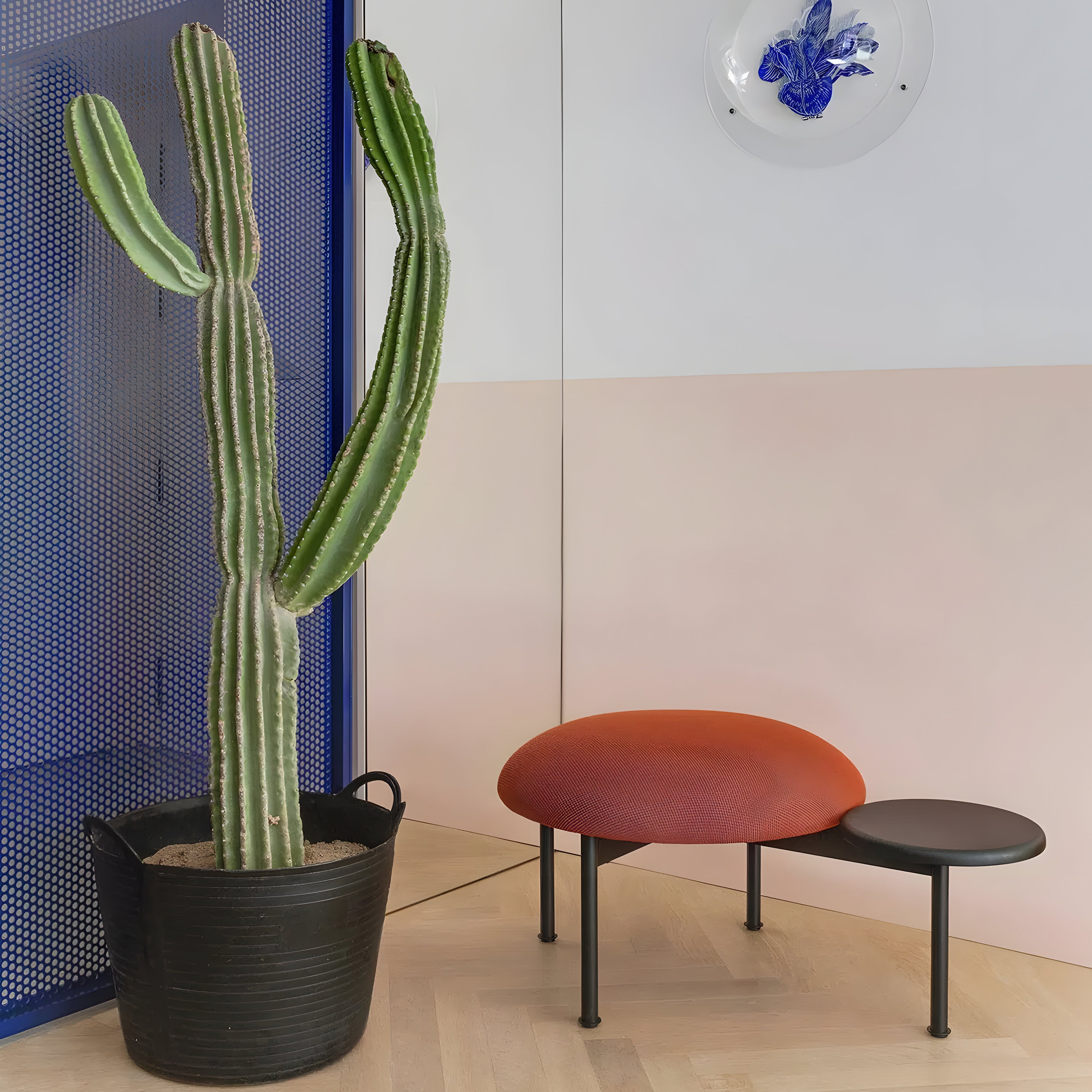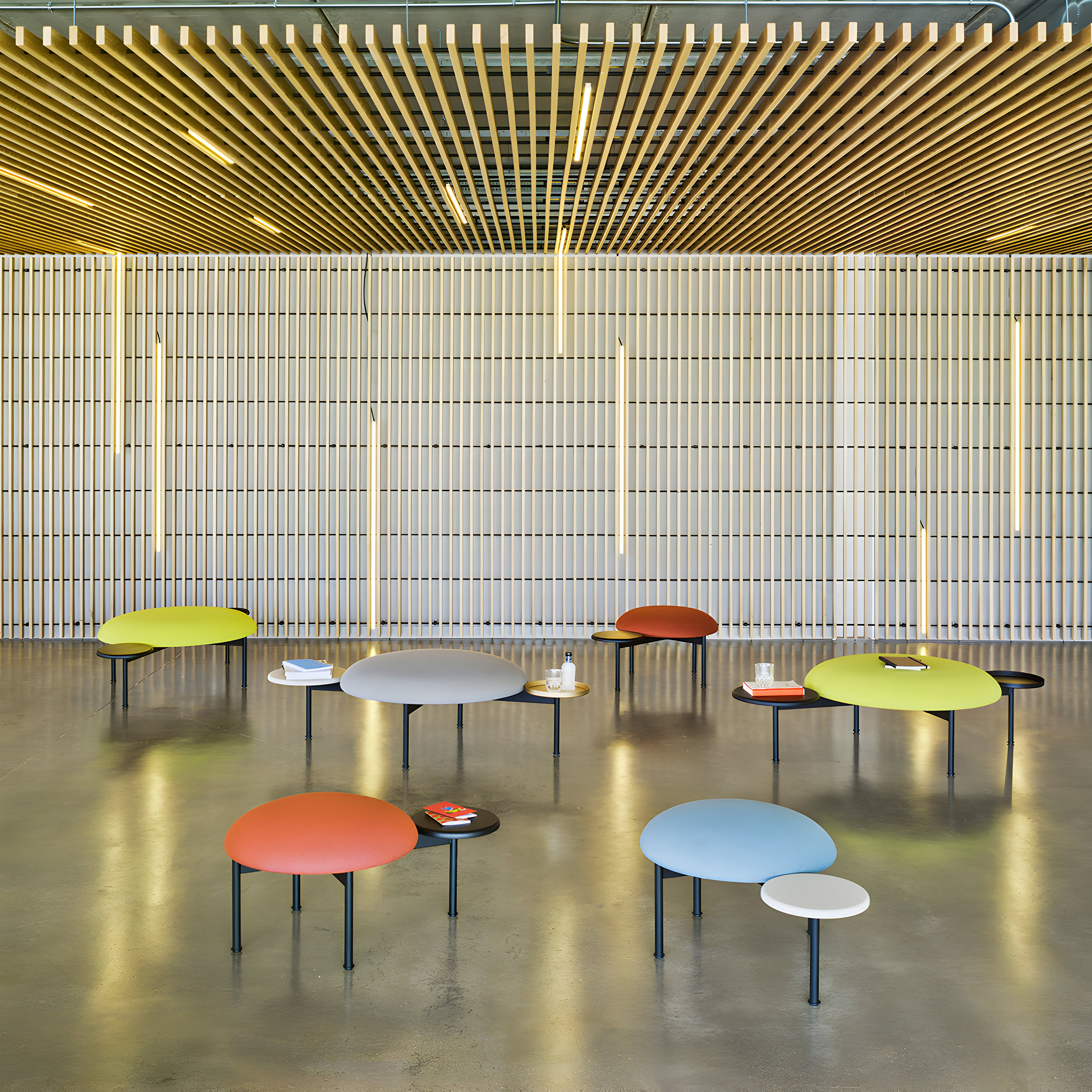 Inspired by the porthole designs of Milan's Turati subway station, the Meeting Point Pouf with Side Table combines seating and surface space in a single piece. It features a circular upholstered seat supported by slim steel legs with a textured black epoxy coating, creating a lightweight appearance. The integrated round tables are available in different sizes and finishes, including solid slatted ash wood and textured epoxy-coated steel in black or gold. Designed for use in various settings, from private spaces to lobbies and breakout areas, it offers a practical and distinctive solution.
