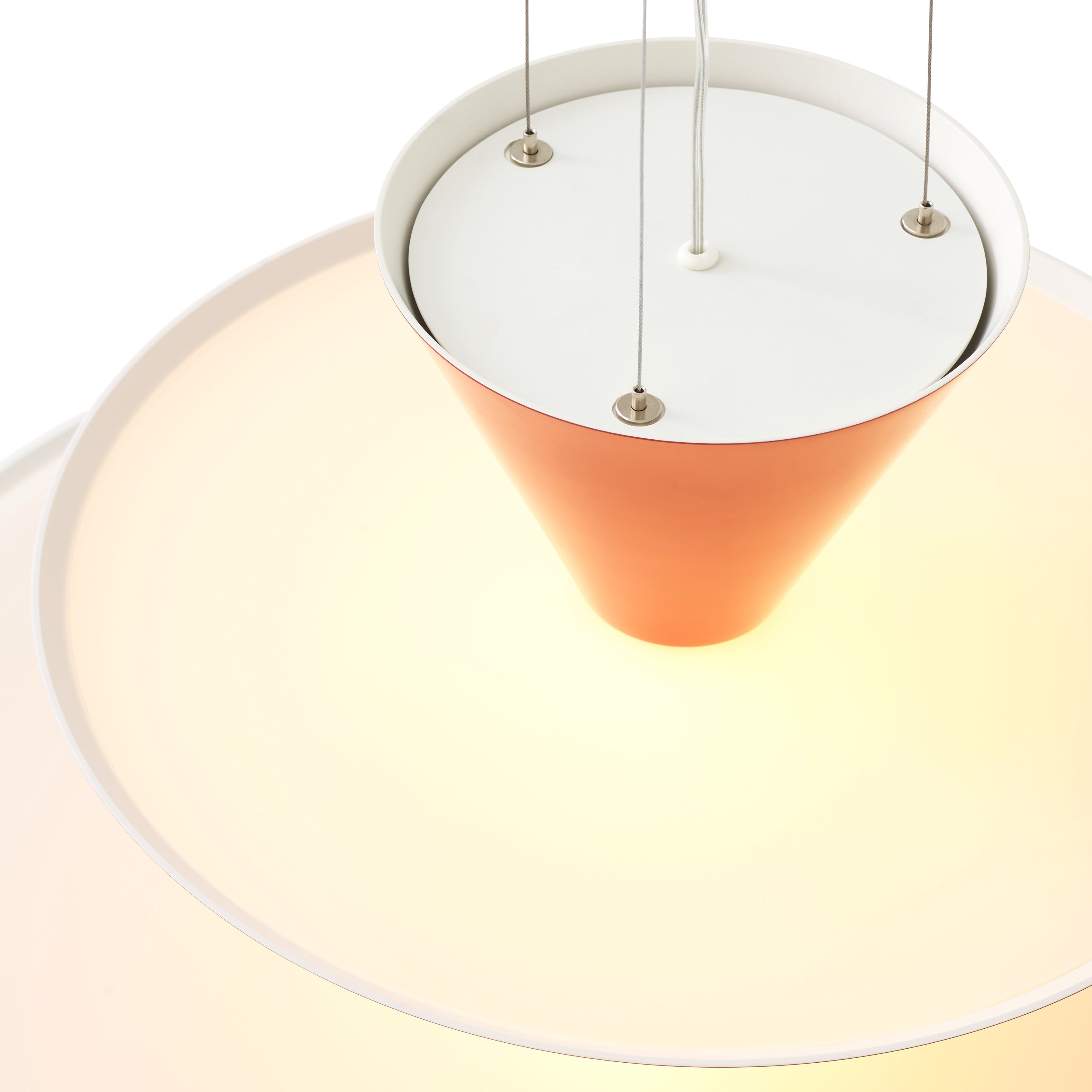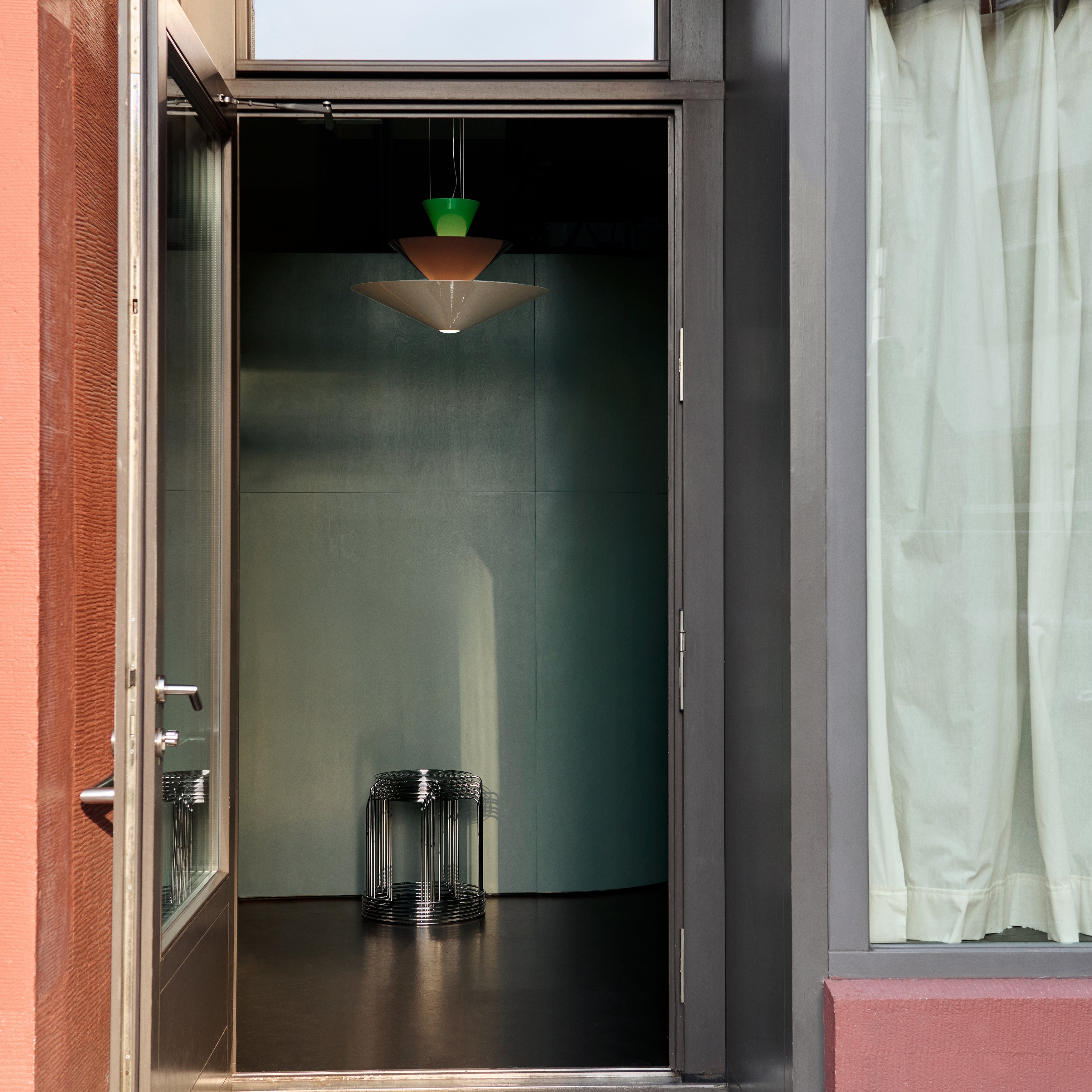This chandelier features bold tiers of spun-aluminium cones that emit both upward and downward LED light. Available in two sizes (LN14 and LN15), it comes in two color combinations. The design draws inspiration from the traditions of Murano glass and references the geometric forms found in Gio Ponti’s Murano chandeliers. It includes fully integrated, dimmable LEDs with a warm 2600 K color temperature.
