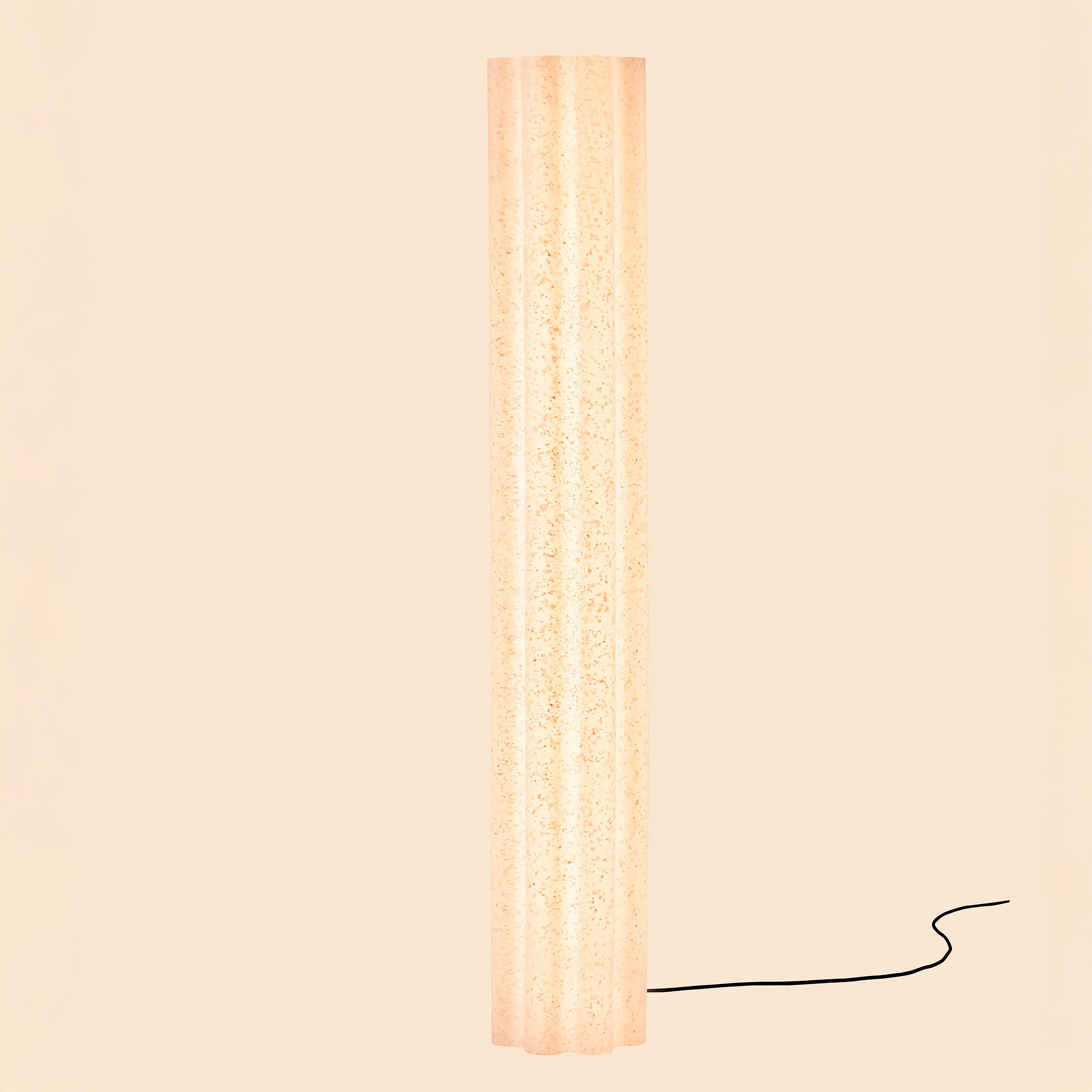 The Lucerama Floor Lamp features an undulating shade made from recycled polyethylene, diffusing light along its entire height to create a soft, ambient glow. Its tubular frame floats within the structure, emphasizing its suspended, sculptural form. Designed by Cappello, a Politecnico di Milano graduate known for combining traditional techniques with contemporary forms, the lamp embodies Miniforms' focus on sustainability and innovation. Its distinctive flower-shaped outline and White Moon finish provide a refined lighting solution for residential and hospitality settings.