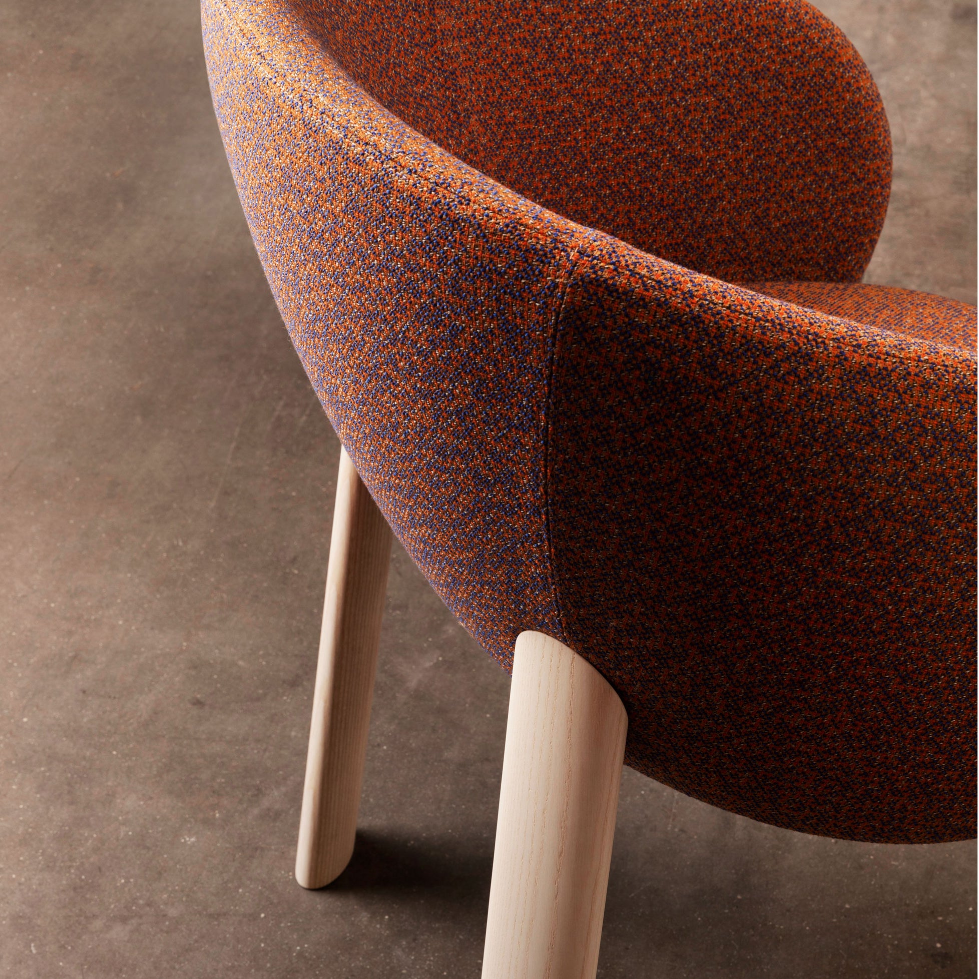 Smoothly splayed legs in a choice of wood finishes add a tactile note to Nebula, with a swirl of cloudlike presence that inspired its celestial name. From design E-ggs, the armchairs invitingly encompassing contours feature upholstery in a range of premium textiles over its comfortably plumped polyurethane shell.
