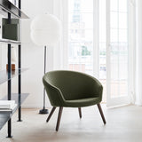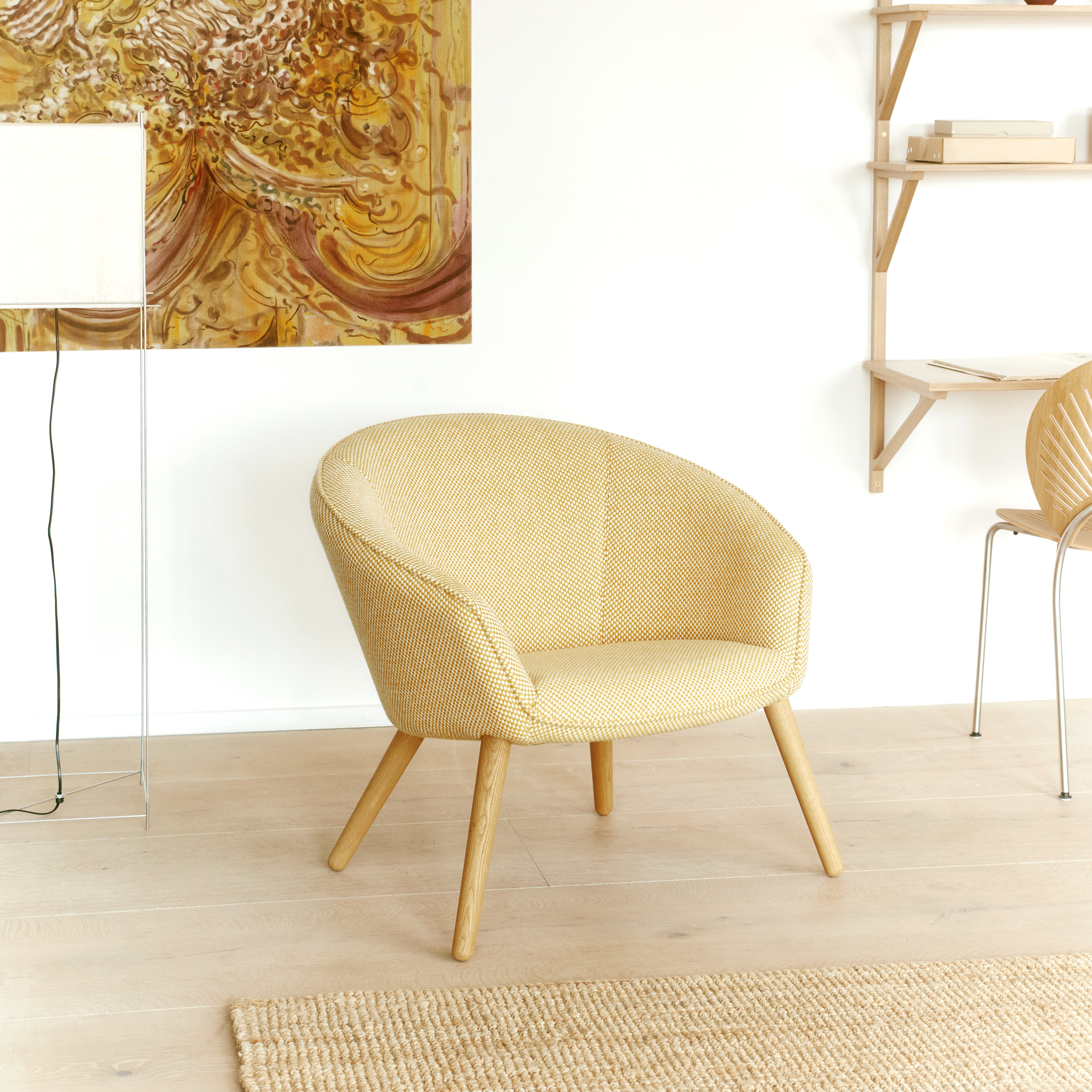 Designed by Nanna Ditzel and Jørgen Ditzel in 1953, this modern take on the traditional easy chair is amply proportioned for comfort with the slightly curved back extending to its armrests. A looker from any angle, the seating features a sculptural, organic silhouette balanced by splayed wooden legs as a playful touch. The high-pressured PUR-foam shell is enforced with a steel frame and upholstered in a choice of exclusive fabrics and the chair has achieved Greenguard Gold Certification.