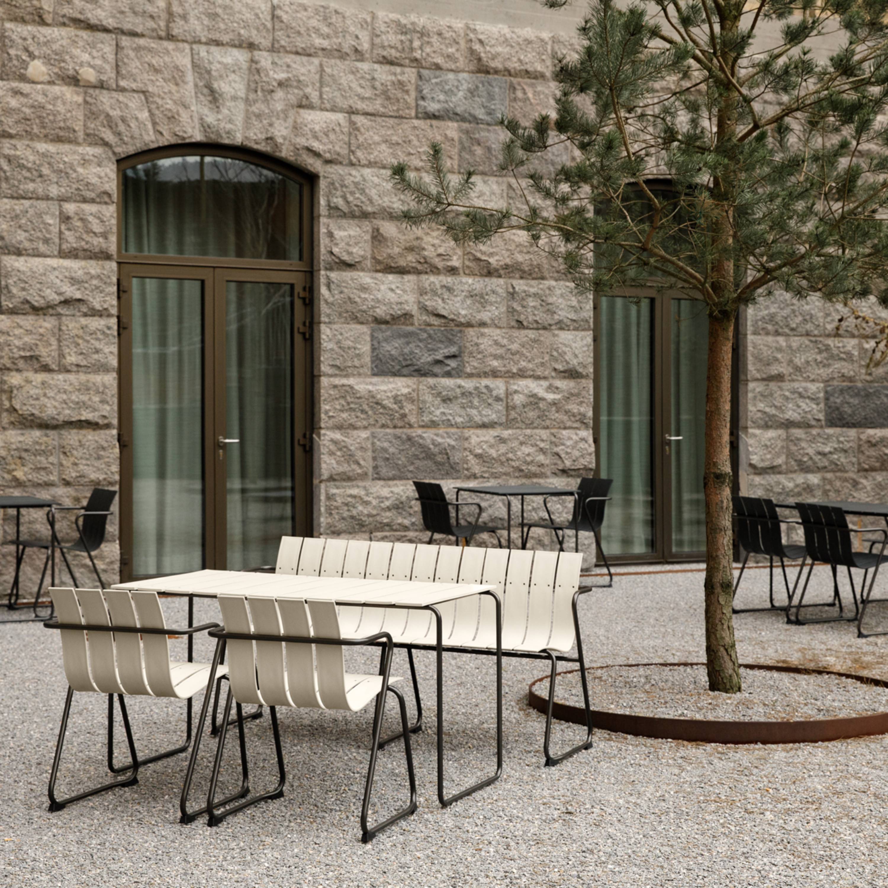 An inviting expanse of comfortably curved slats characterizes Mater’s newly sustainable take on an outdoor classic. With Ocean Bench, Jørgen and Nanna Ditzel’s 1955 bench is reissued in plastic waste from the seas (both fishing nets and hard plastic) that equals more than 7 pounds of detritus. Durably conceived for both private and public use, the steel-tube frame with supportive armrests comes finished in gunmetal.