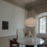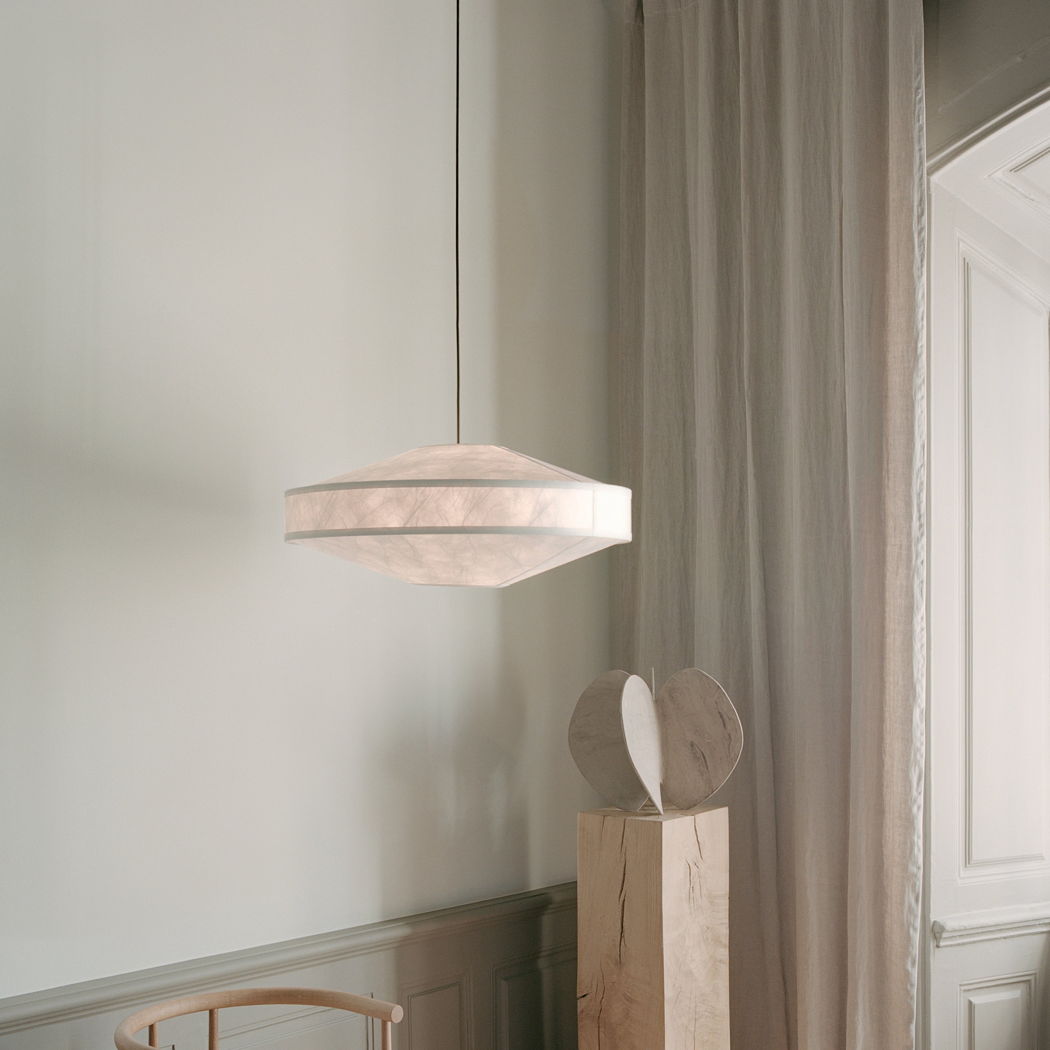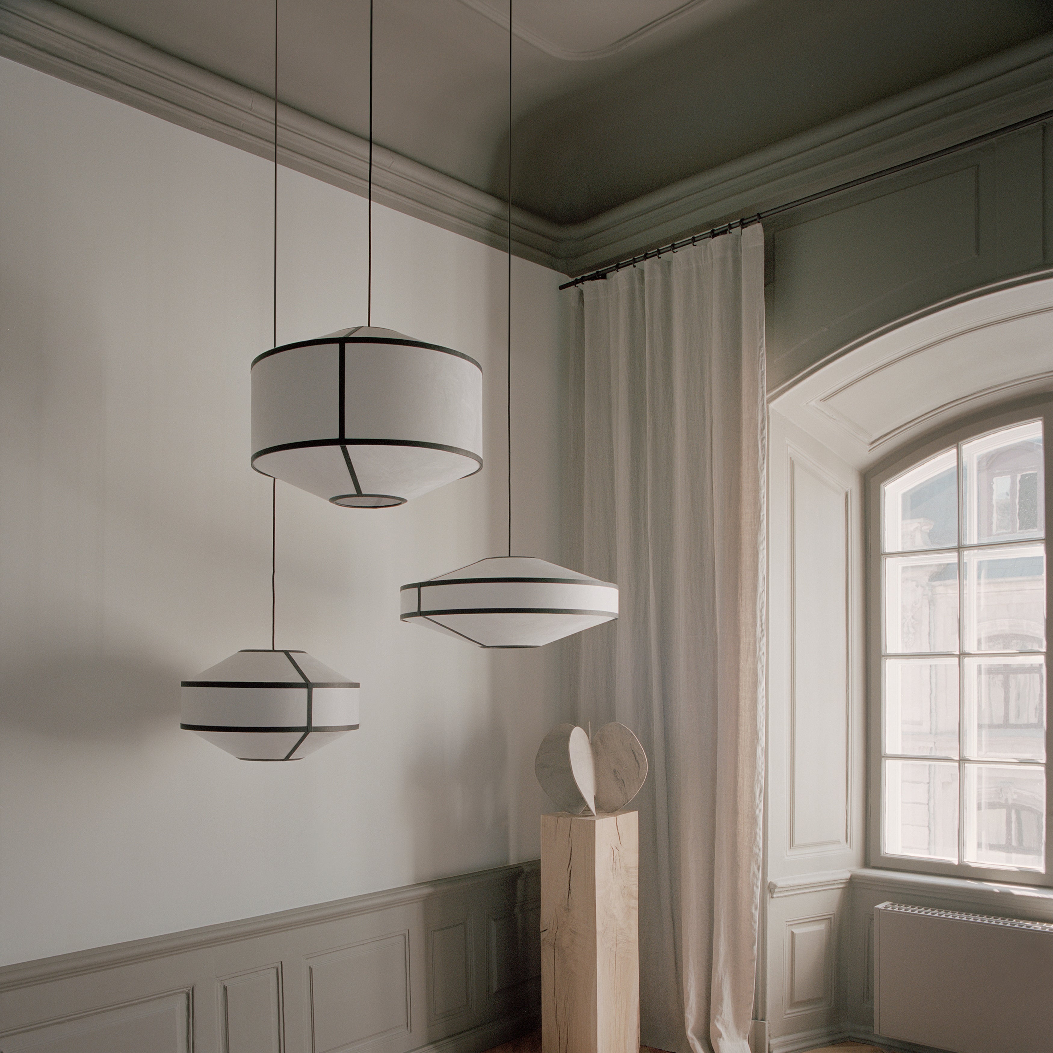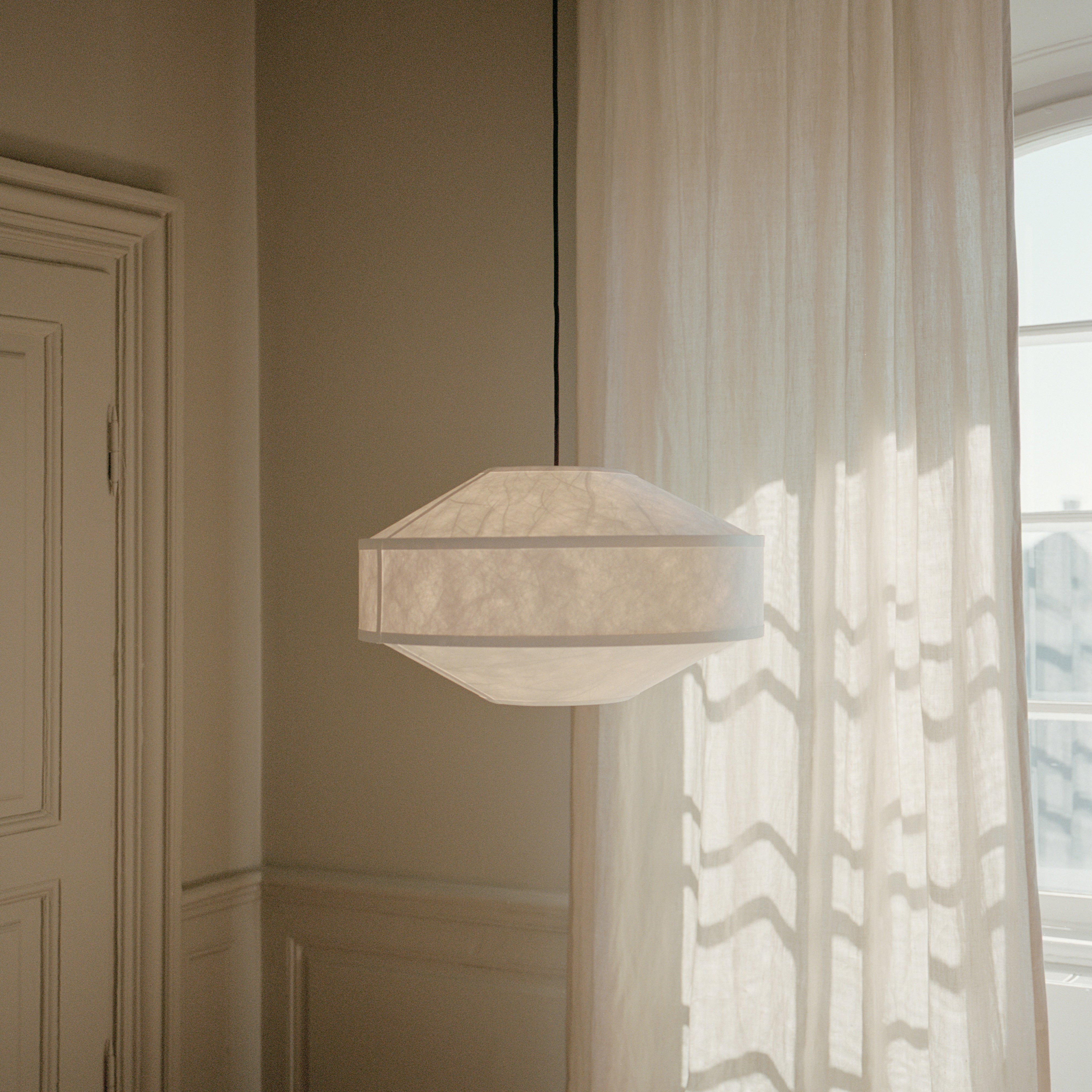 The Pendant Lamp features a geometric design made from folded Tyvek sheets, giving it a sculptural character. The translucent material softly diffuses light, creating a warm and inviting glow. Available in 3 sizes and 2 color options, white and white with black accents. Designed by a Swiss-based studio, Pante & Tourron, celebrated for its innovative use of materials and technology.