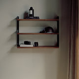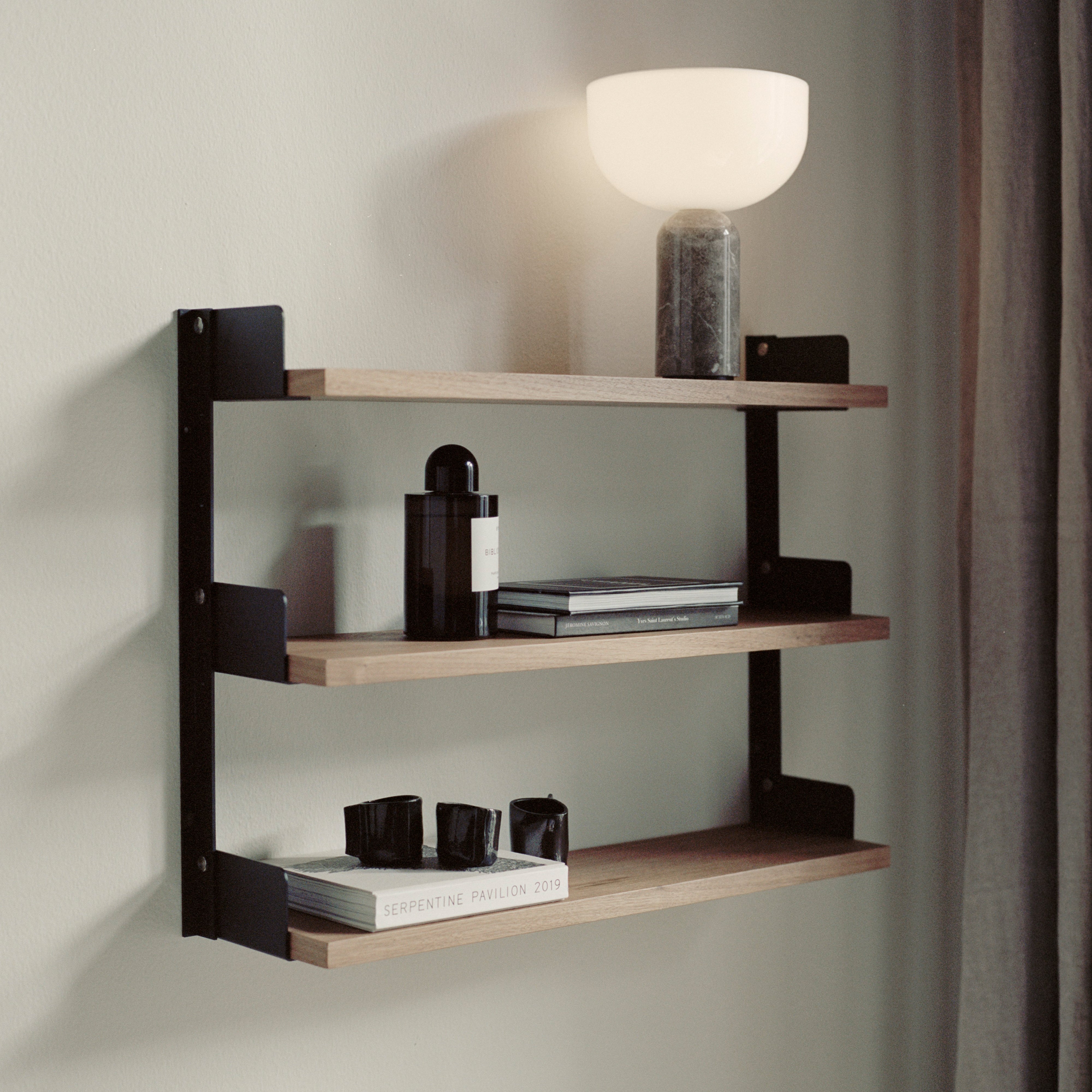 Tea Shelf can be used anywhere in the home for storage and display of small items, kitted out with extended side supports to keep belongings in place. Creative director Knut Bendik Humlevik offers this 3-shelf variation on New Works’ eponymous system, with discretely incorporated steel wall supports paired with shelves in a lacquered white finish or a range of woodgrain veneers and set off by flat knurled screws in stainless steel.