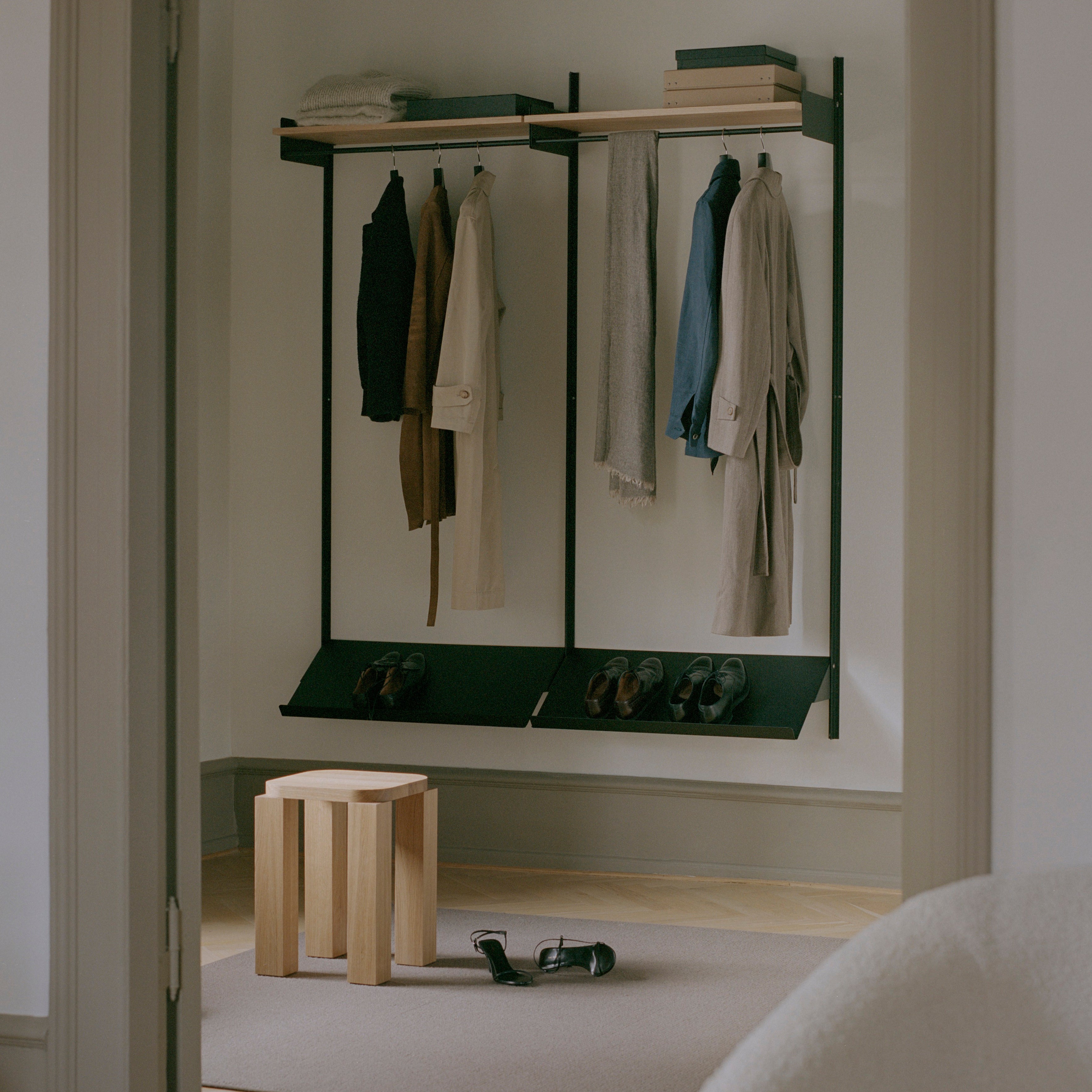 For the entry, dressing area or bedroom, Wardrobe Shelf brings a refined appearance to an otherwise practical furnishing with a combined upper shelf and hanger unit and a choice of shoe shelves below in a single or double width configuration. New Works’ signature wall series by designer Knut Bendik Humlevik features trim steel mounting bars and clean-lined shelves in a lacquered white finish or woodgrain veneer, neatly assembled with flat knurled screws in stainless steel.