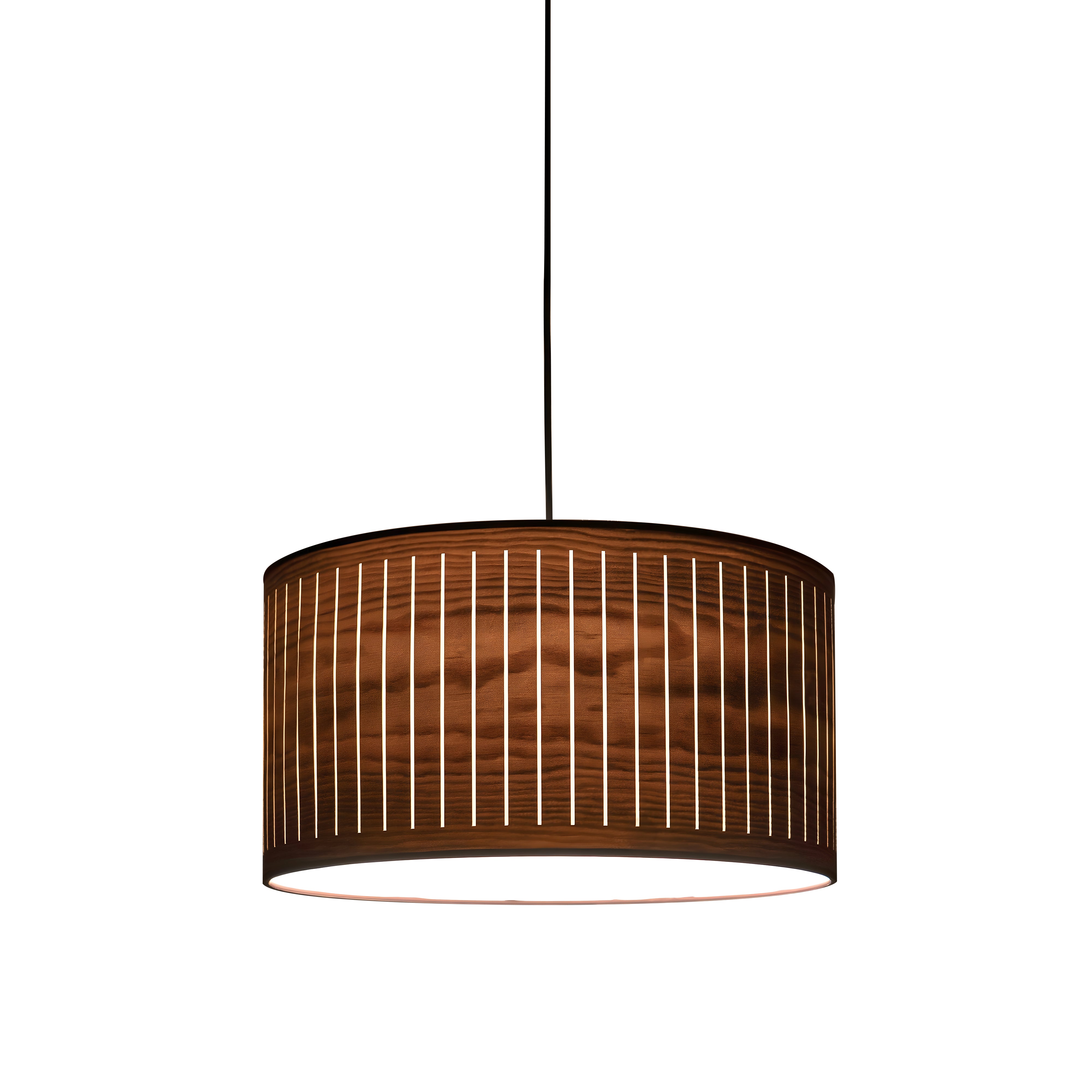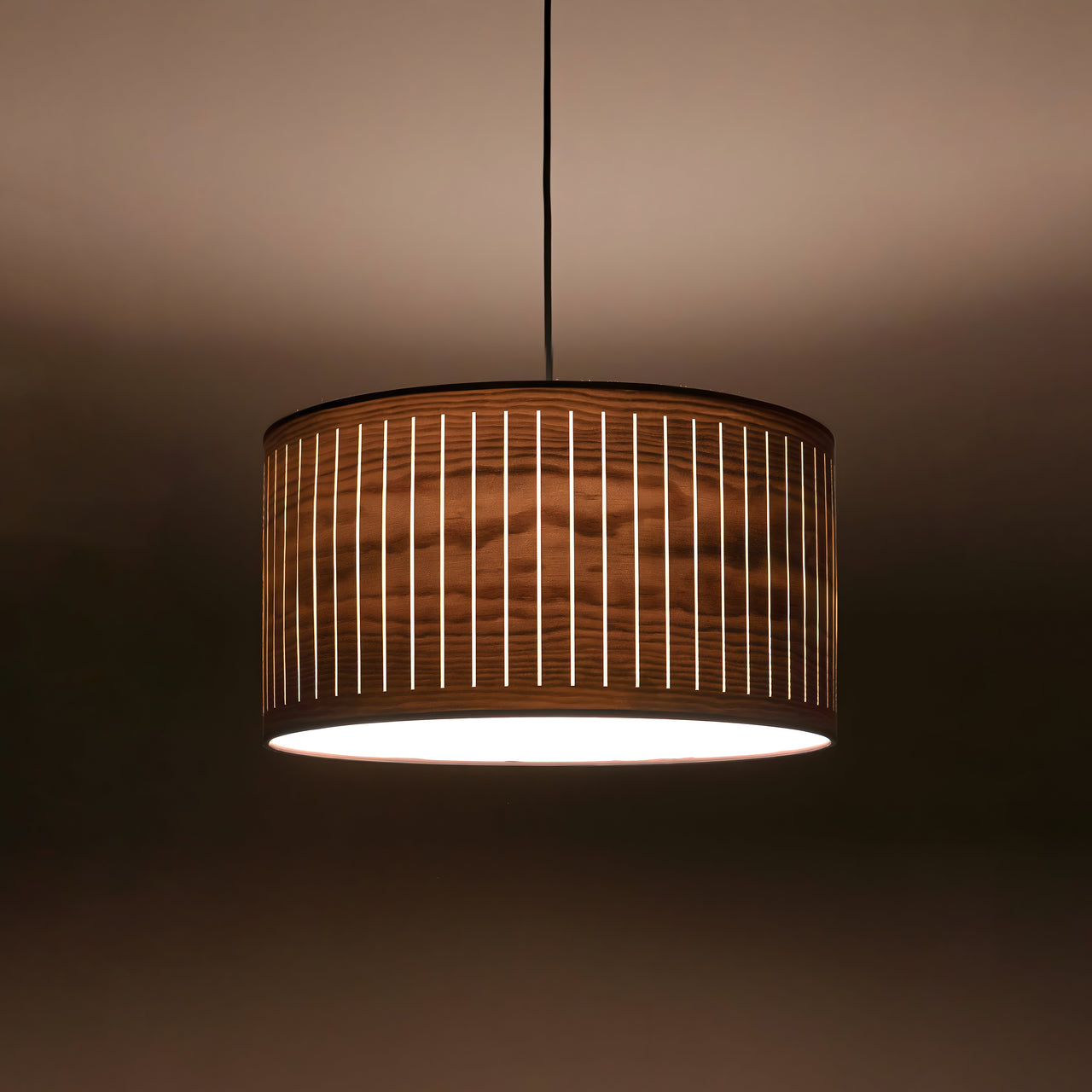 A veil of diffused light filters through slender walnut slats, casting a warm, autumnal glow. The Autumn Pendant blends natural wood tones with precise craftsmanship to form a softly sculptural presence.