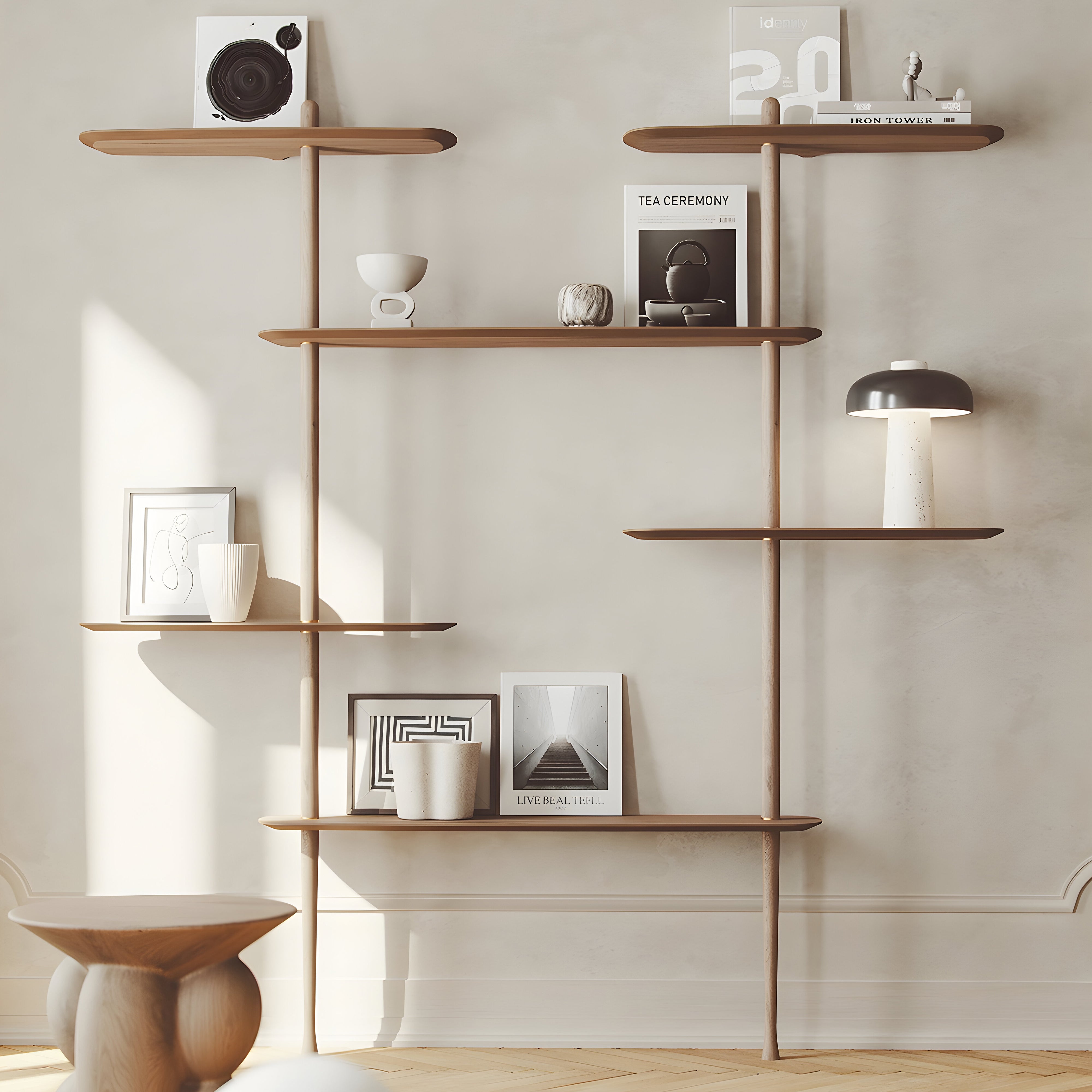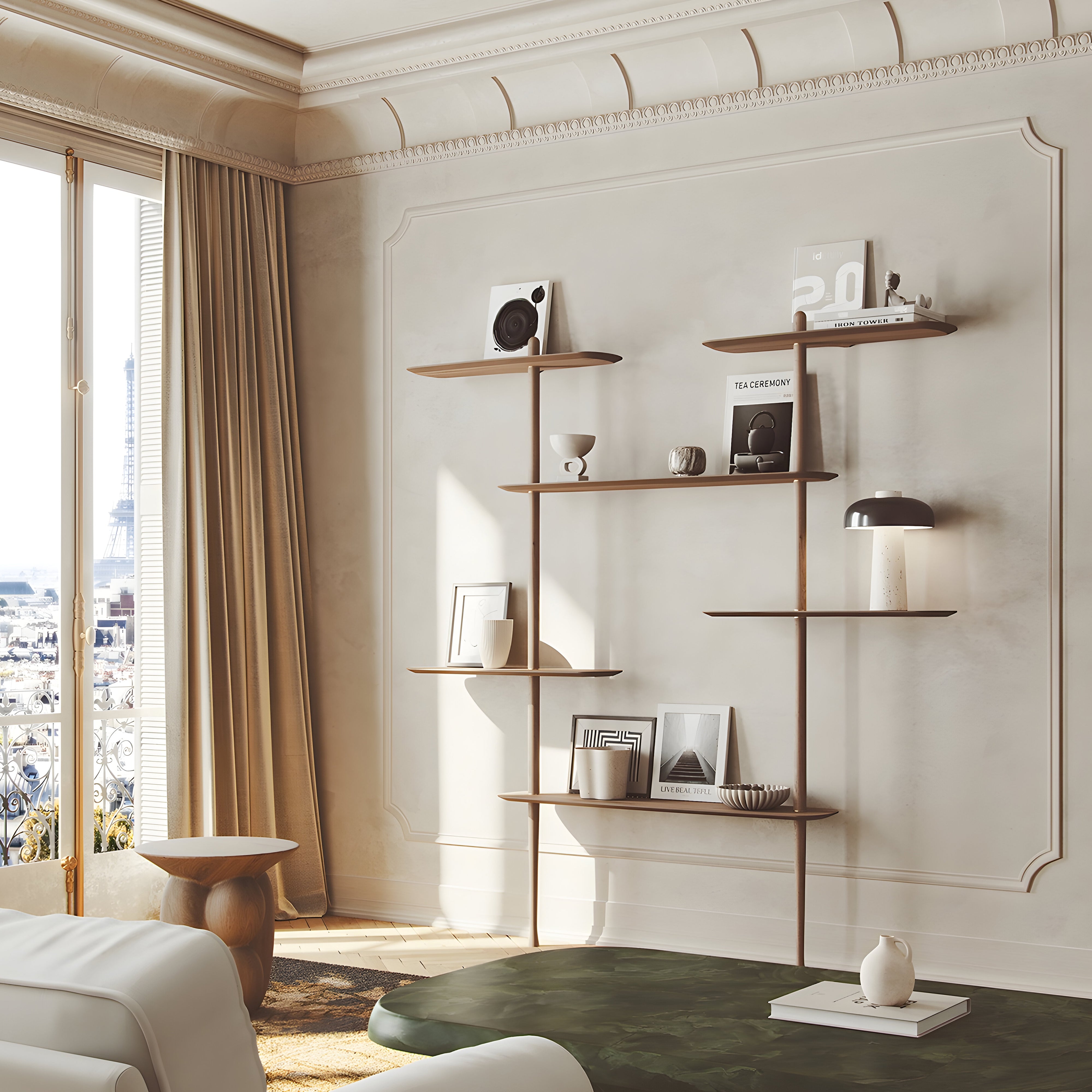 A composition of solid walnut uprights and slim veneer shelves forms a distinctive, handcrafted shelving system. Built in Barcelona, its modular design allows for customized arrangements by mixing black-lacquered MDF and walnut or black ash veneer shelves along brass-accented rods.