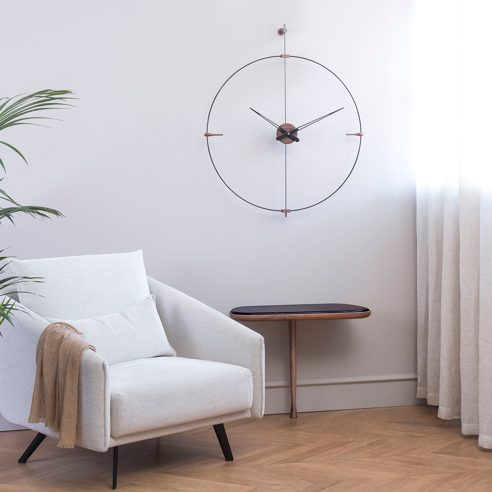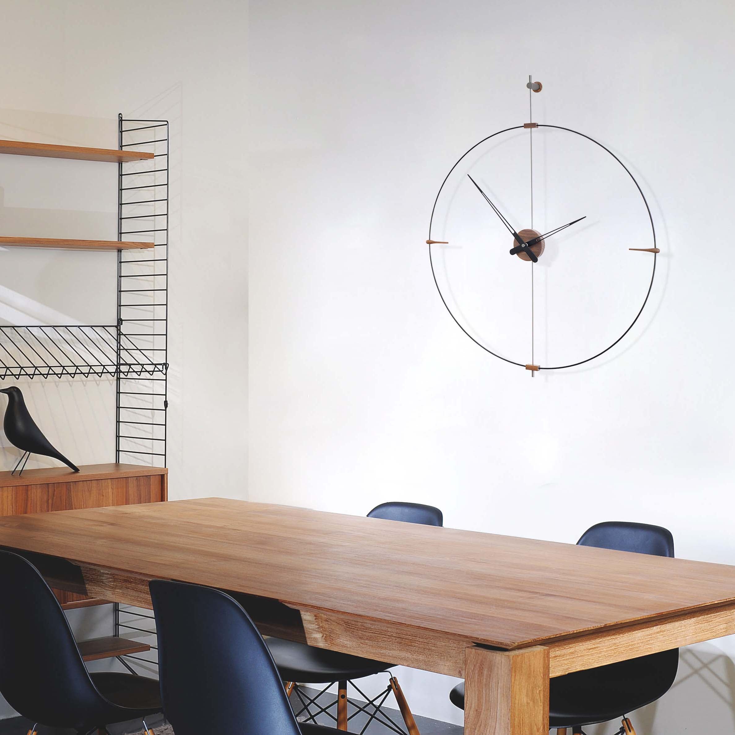 Bilbao's suspended ring enhances a minimalist vibe via Nomon’s crisp styling in a choice of black or white with needle hands to match or contrast — or choose an accent of gorgeous genuine walnut. Available in regular and mini versions, the handcrafted wall clock's metal support and center box come in complementary chrome or brass finishes. Battery-powered and made in Spain with a precision German quartz works, the statement clock is easily installed to elevate any space.