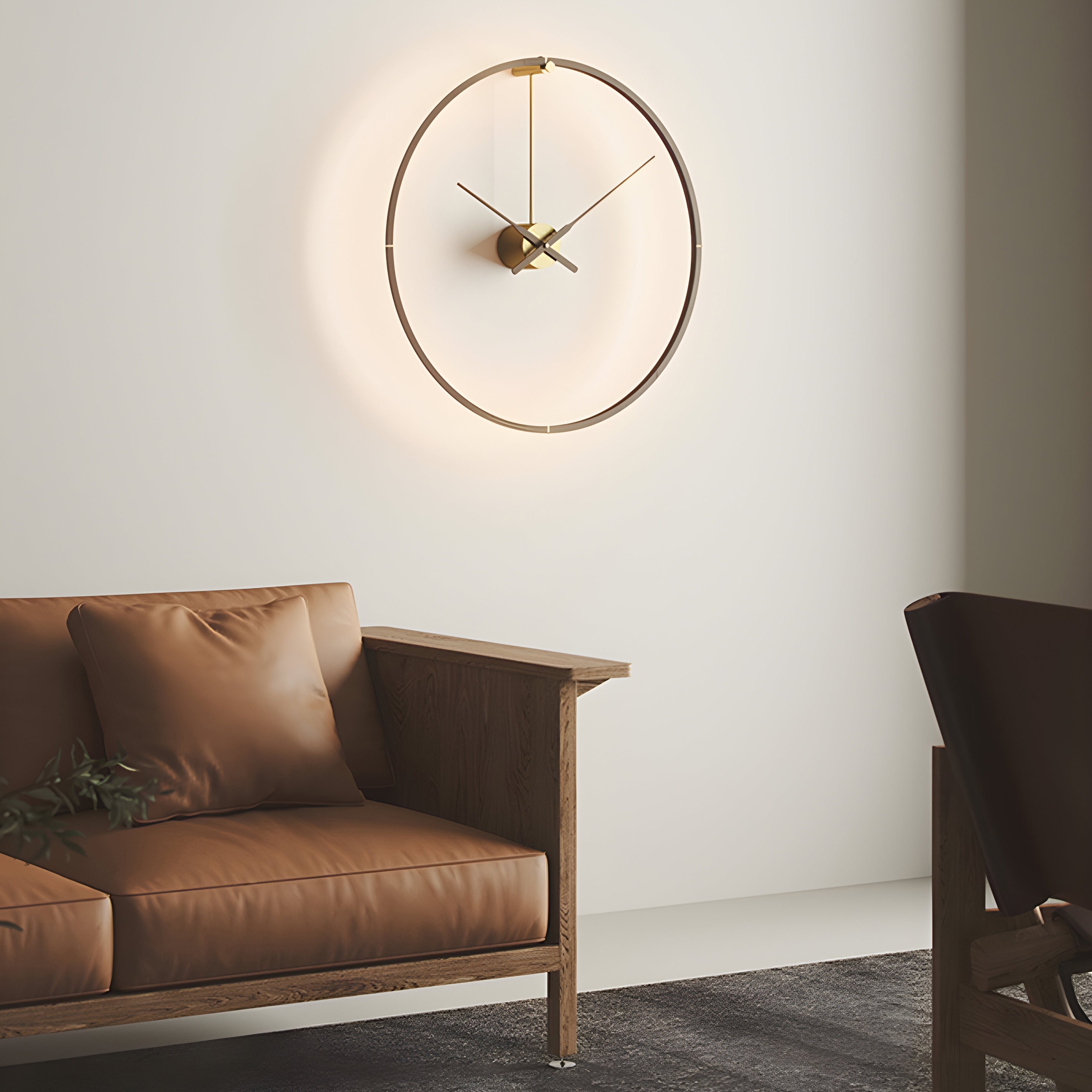 A soft, halo-like glow surrounds the clock face, doubling as a warm ambient light source. Handcrafted in Barcelona, it features anodized aluminum and polished brass components. An integrated 8 W LED (600 lm, 3000 K, CRI 90) provides consistent illumination, while a UTS German quartz mechanism ensures accurate timekeeping.