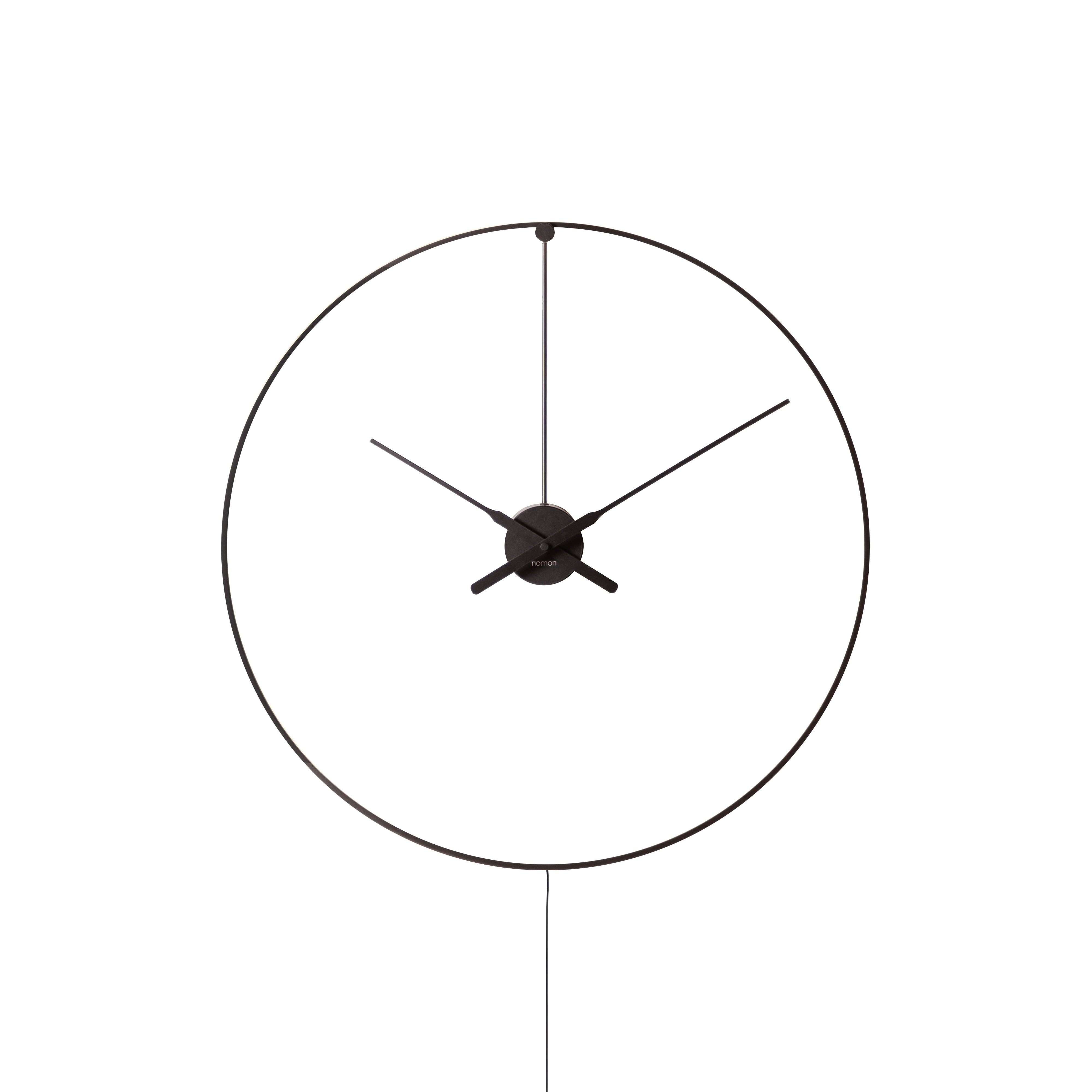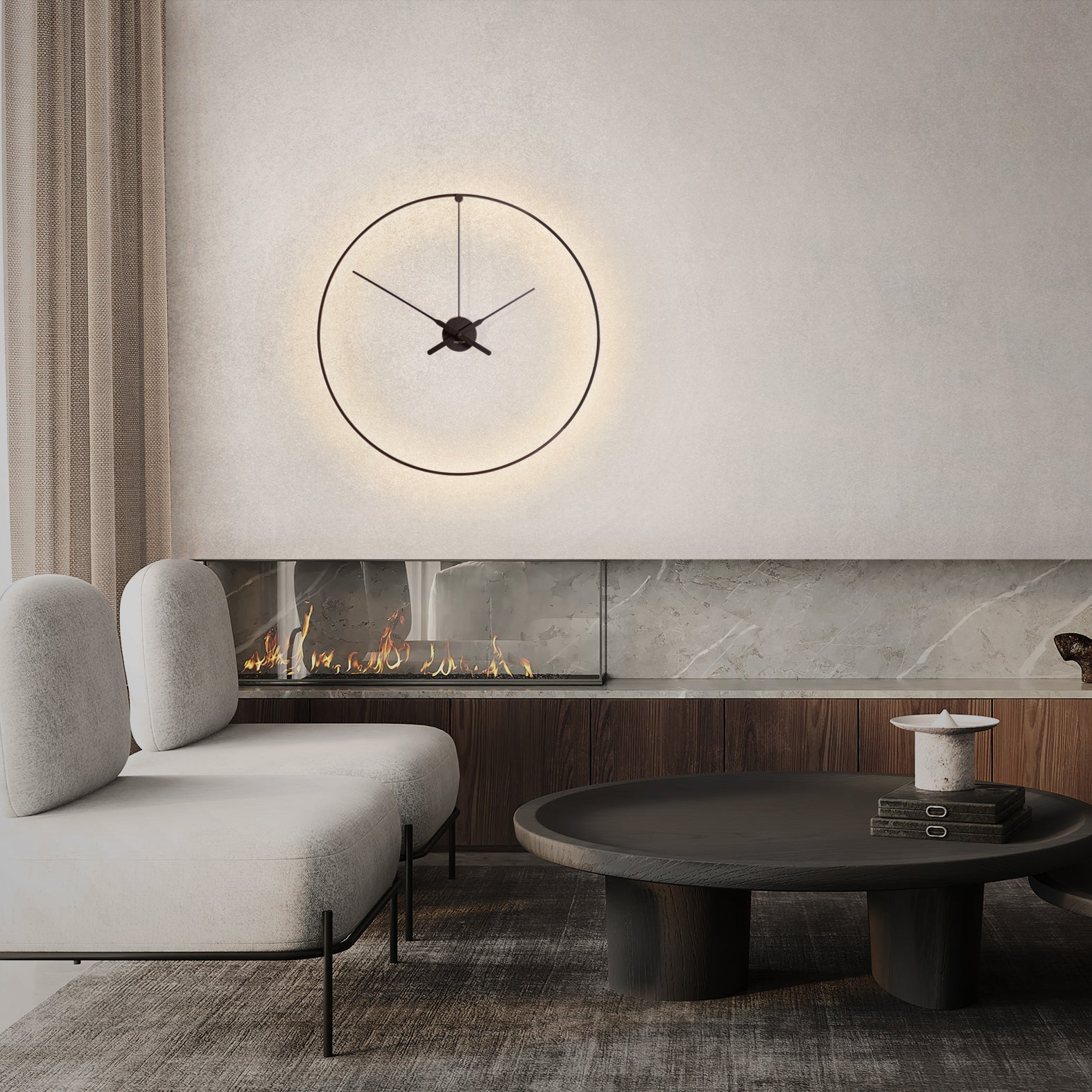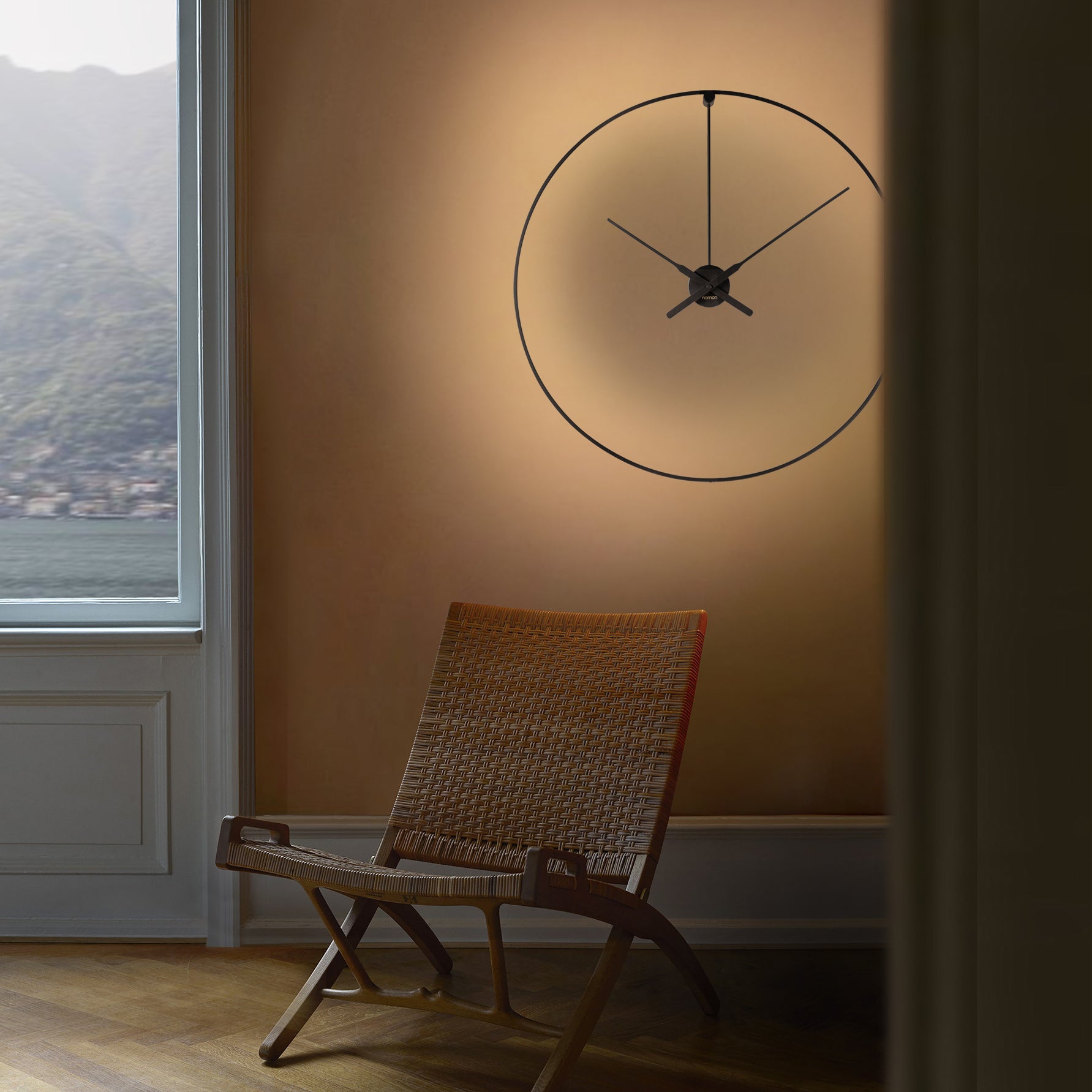 The Ombra Wall Clock integrates a sleek black anodized aluminum ring with an LED lighting system, casting a warm, ambient glow that enhances any space. Available in both plug-in and hardwired versions to accommodate various installation preferences.