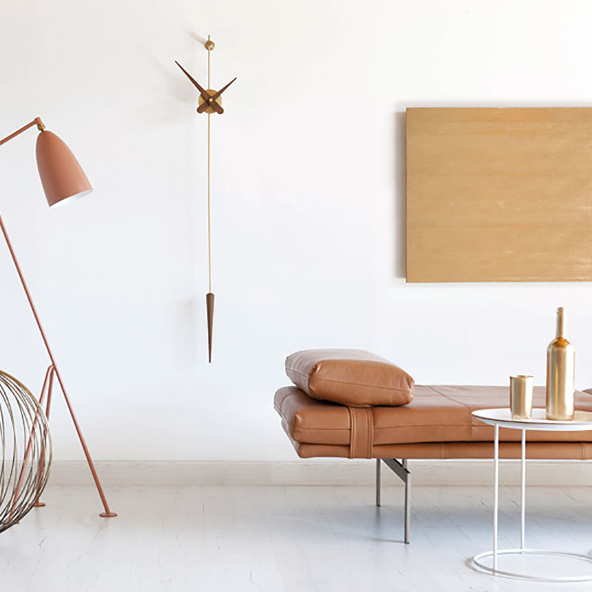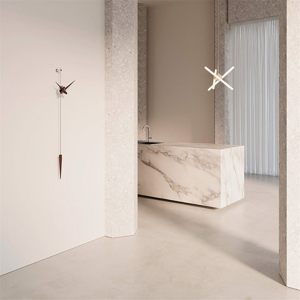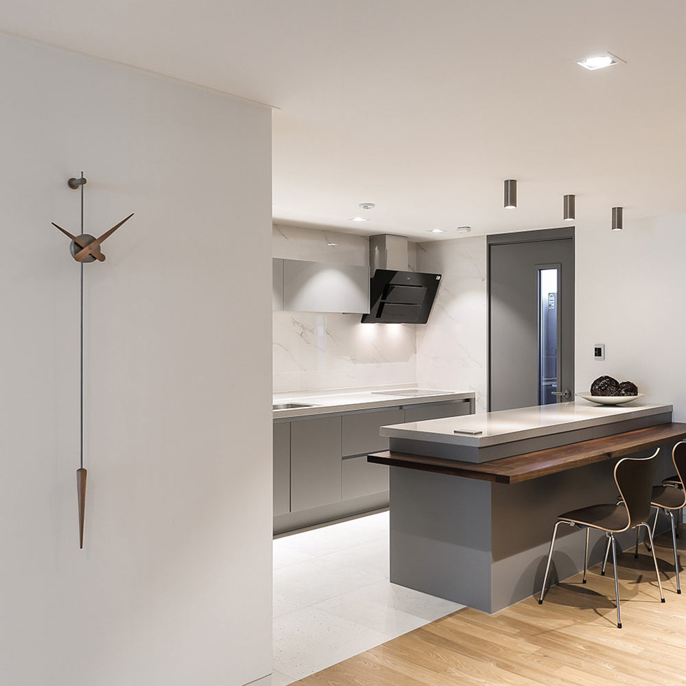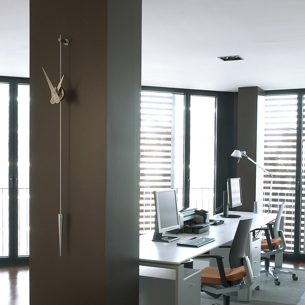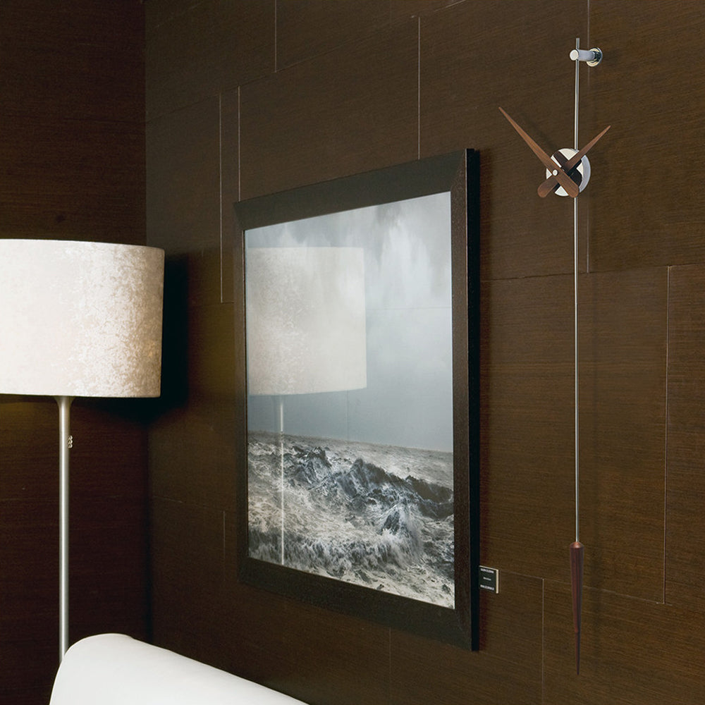 A design-worthy successor to the classic pendulum clock, Punto Y Coma provides a minimalist update with its sleek wall-mounted design. Featuring a central box in a choice of brass finishes — in chromed, polished or graphite variations — the slim needle hands and elongated pendulum lend an intriguing contrast in natural walnut or polished steel. Powered by precision German UTS works, the focal-point timepiece is easily installed and battery-powered without electrical connections.