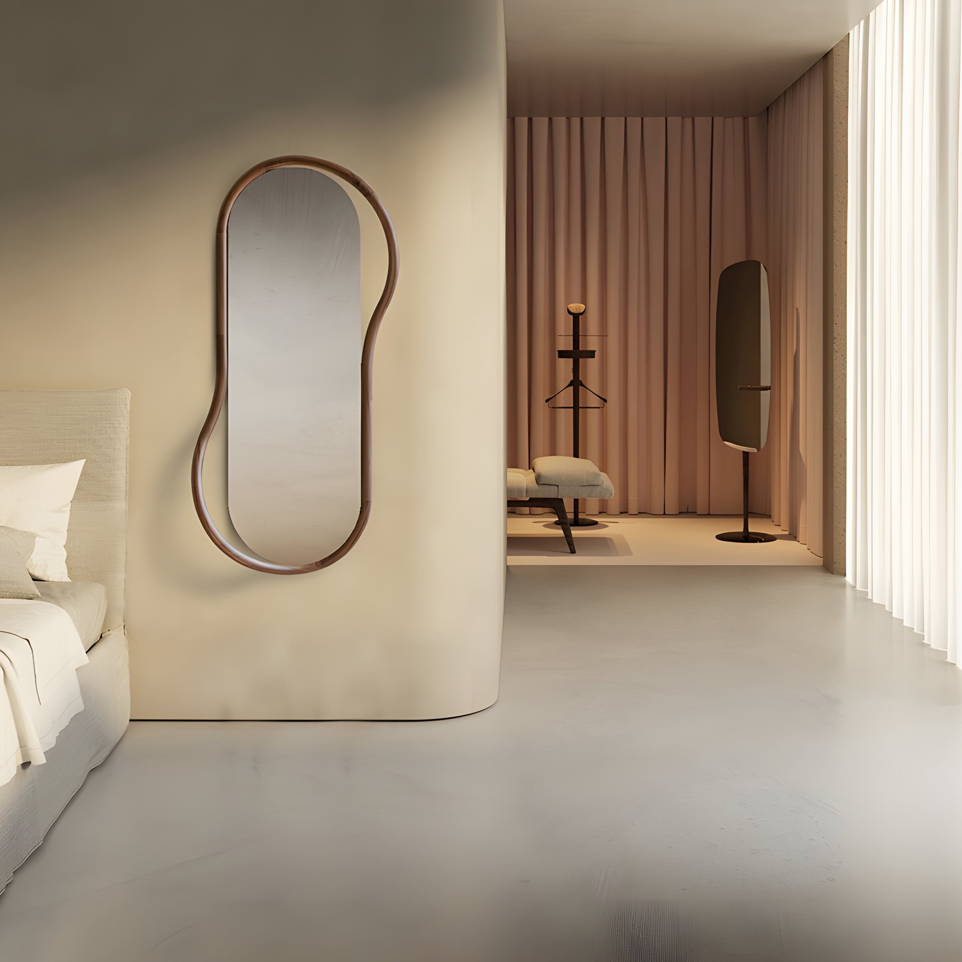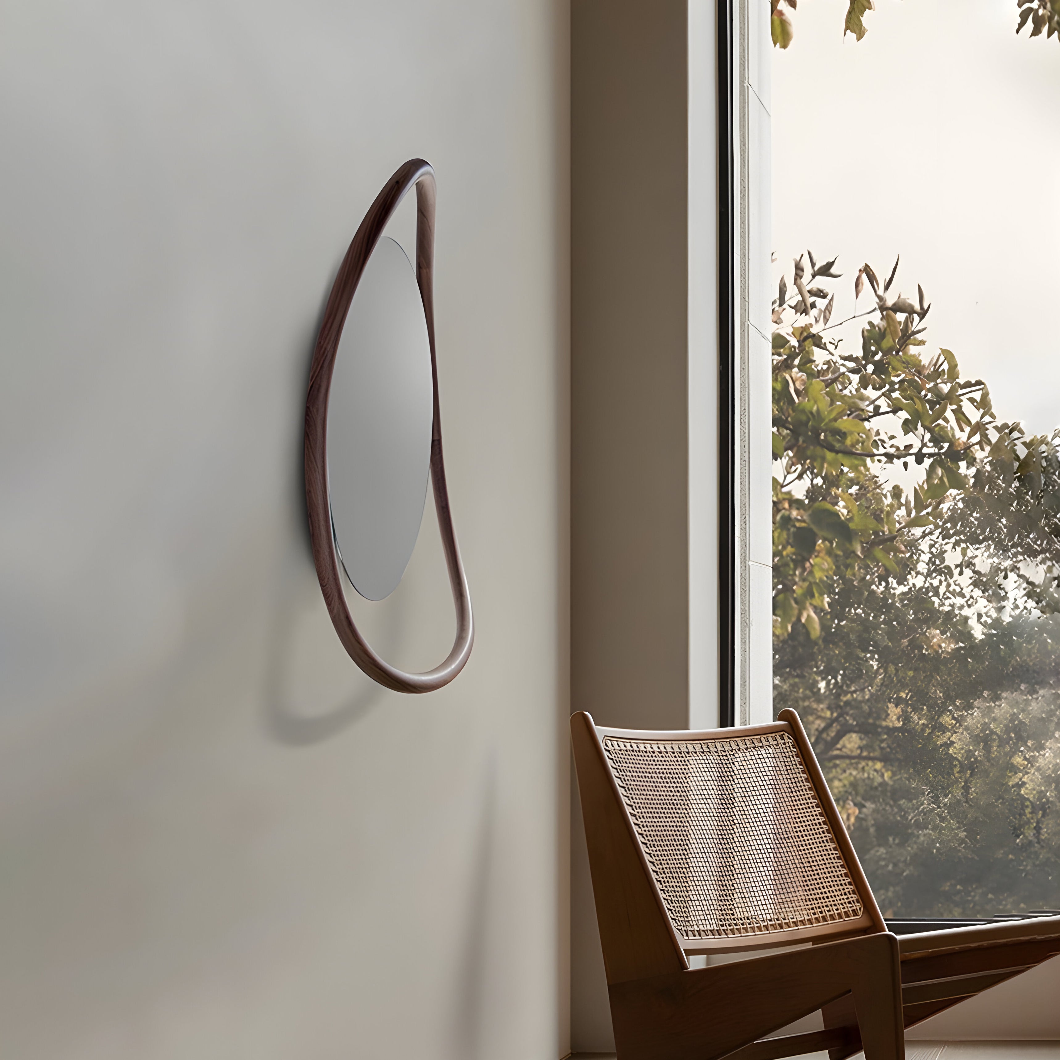 A sculptural walnut frame curves fluidly around the central mirror, adding both depth and visual interest. Hand-bent and polished in Barcelona from solid walnut, the Unut Mirror comes in two organic shapes—round or oval—each offering a quiet yet distinct presence. Named after the Egyptian goddess, it brings a subtle narrative to its refined craftsmanship.