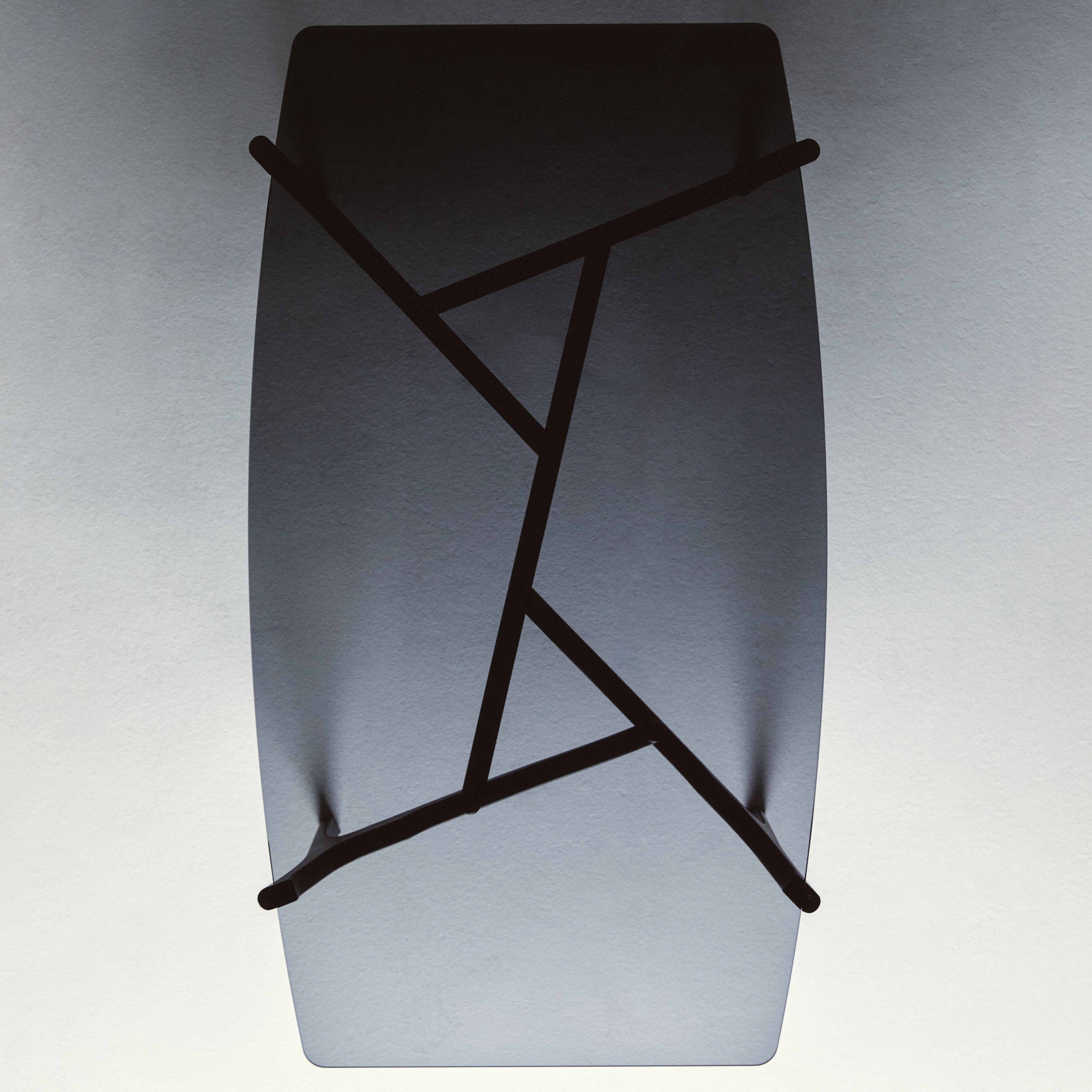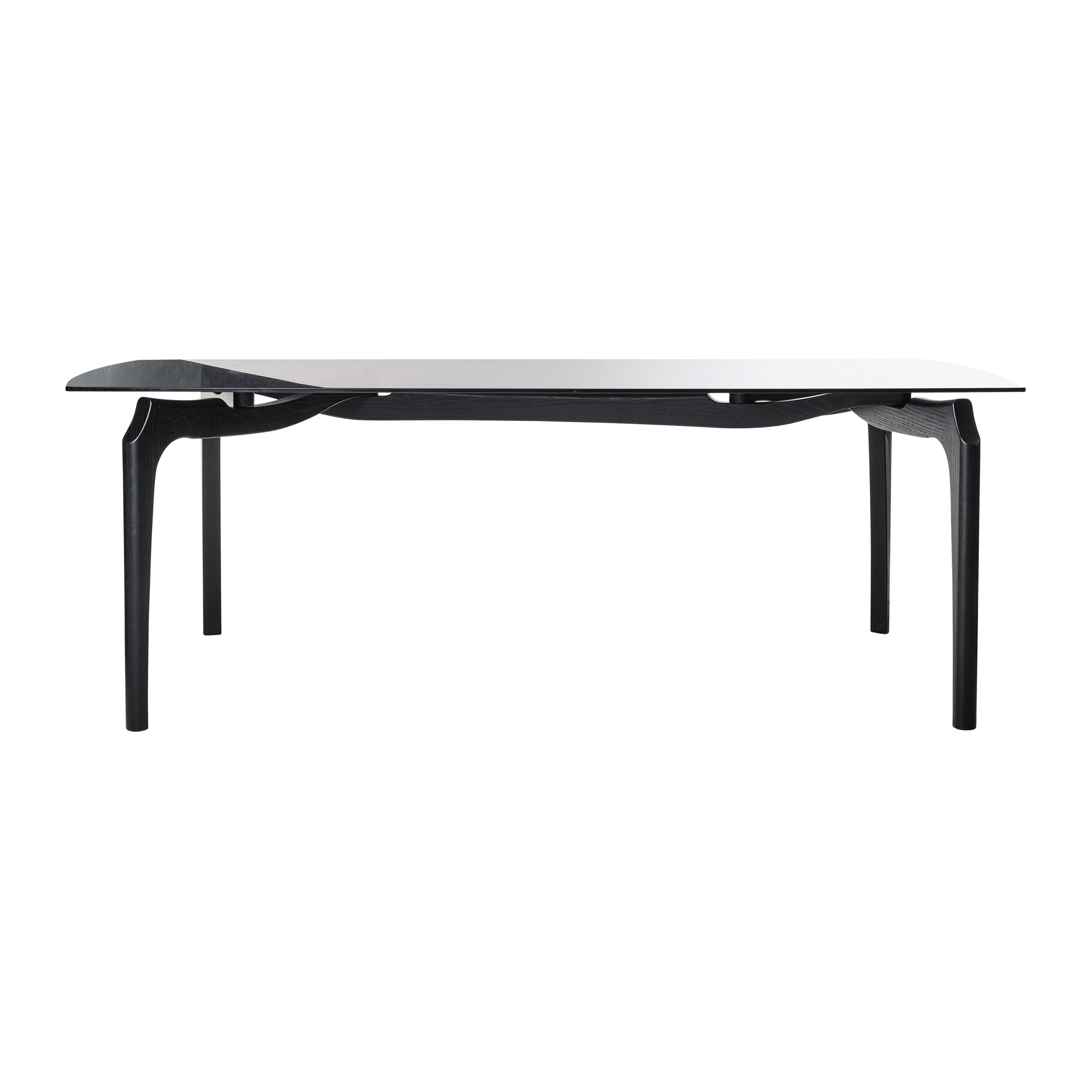 Suggested by the Surrealist architect Carlo Mollino, BD’s Carlinas range by Oscar Tousquets adds a dining table with a clear surface that exposes the biomorphic supporting structure. Twisting and triangulating, the black-painted ash timber upholds the tempered smoked-glass tabletop to mesmerizing effect.
