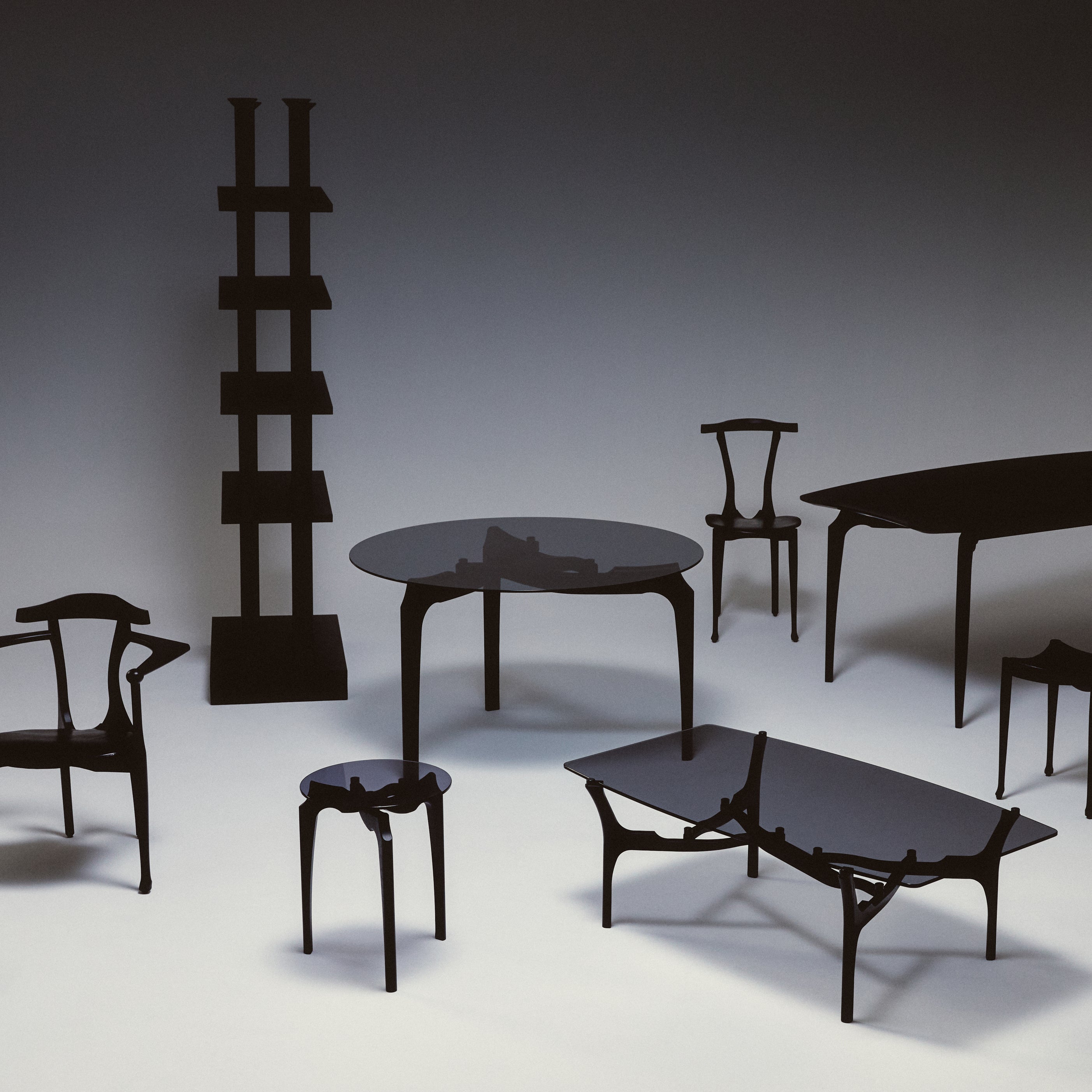 Verging on the surreal, designer designer Oscar Tusquets’ side table derives its graphic 3-legged structure from an abstraction of nature’s twisting tree branches, rendered in dark solid ash. Inspired by noted 20th century Italian architect Carlo Mollino’s similarly organic vision, the biomorphic wood legs triangulate at Carlino’s base, supporting the moodily tinted transparency of the smoked-glass tabletop.