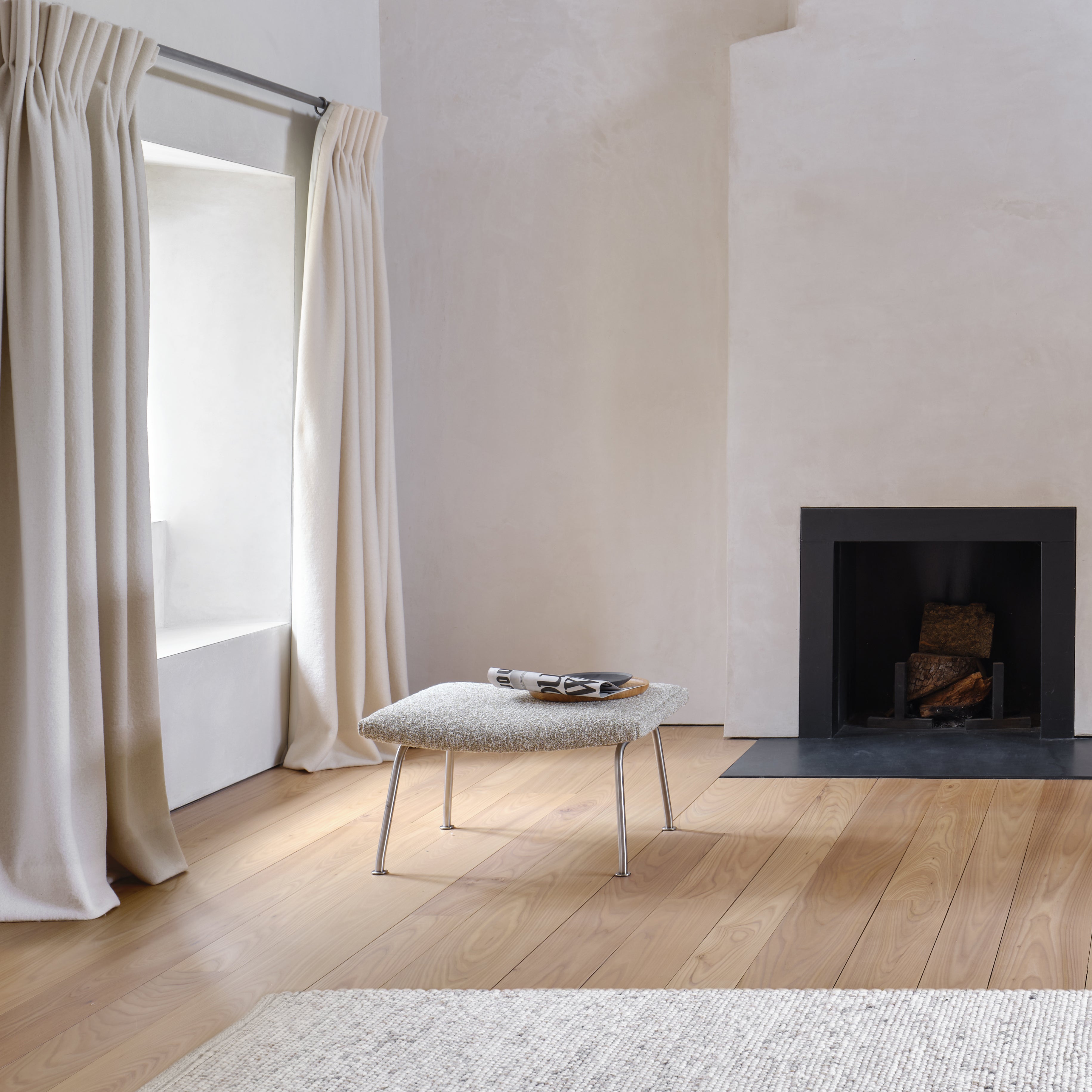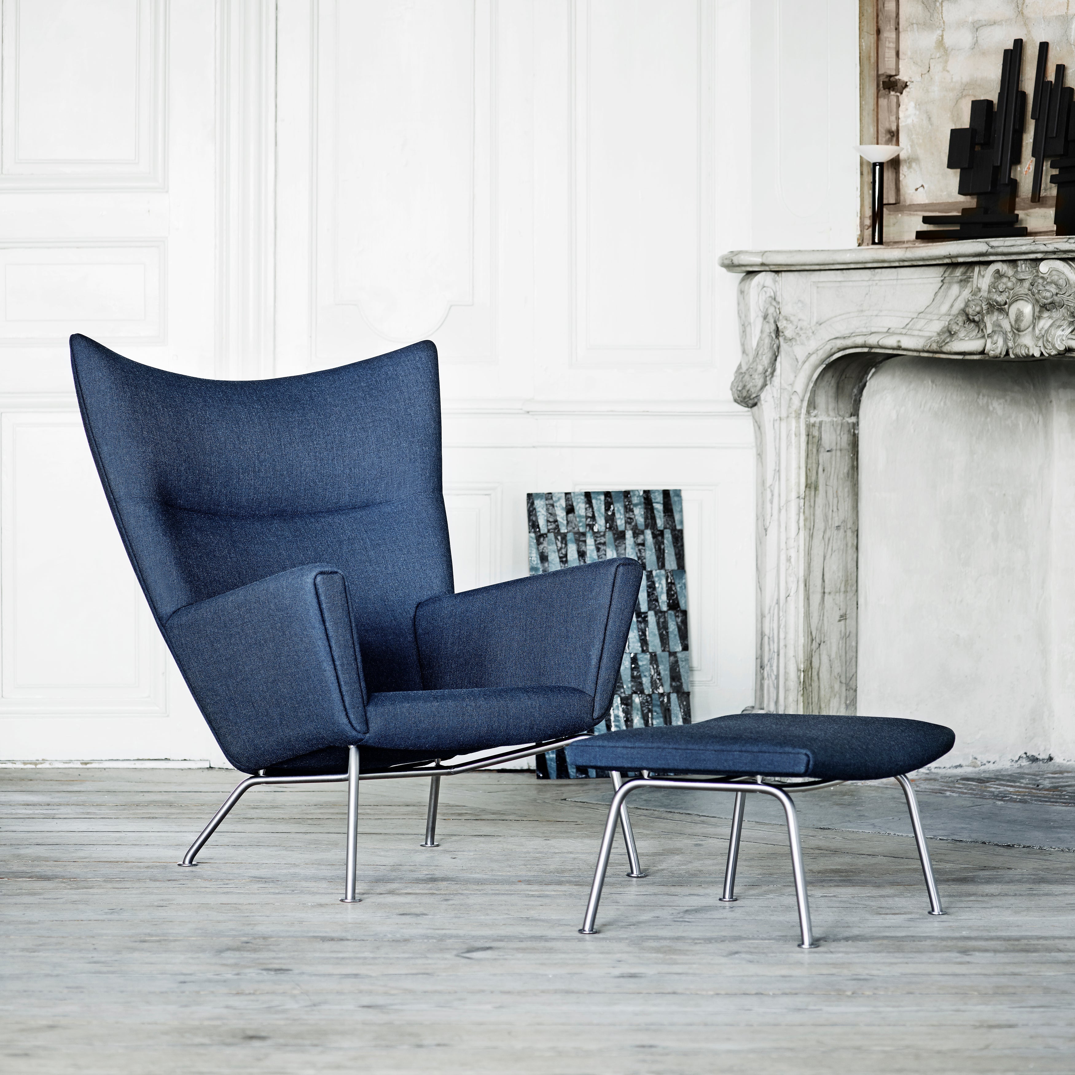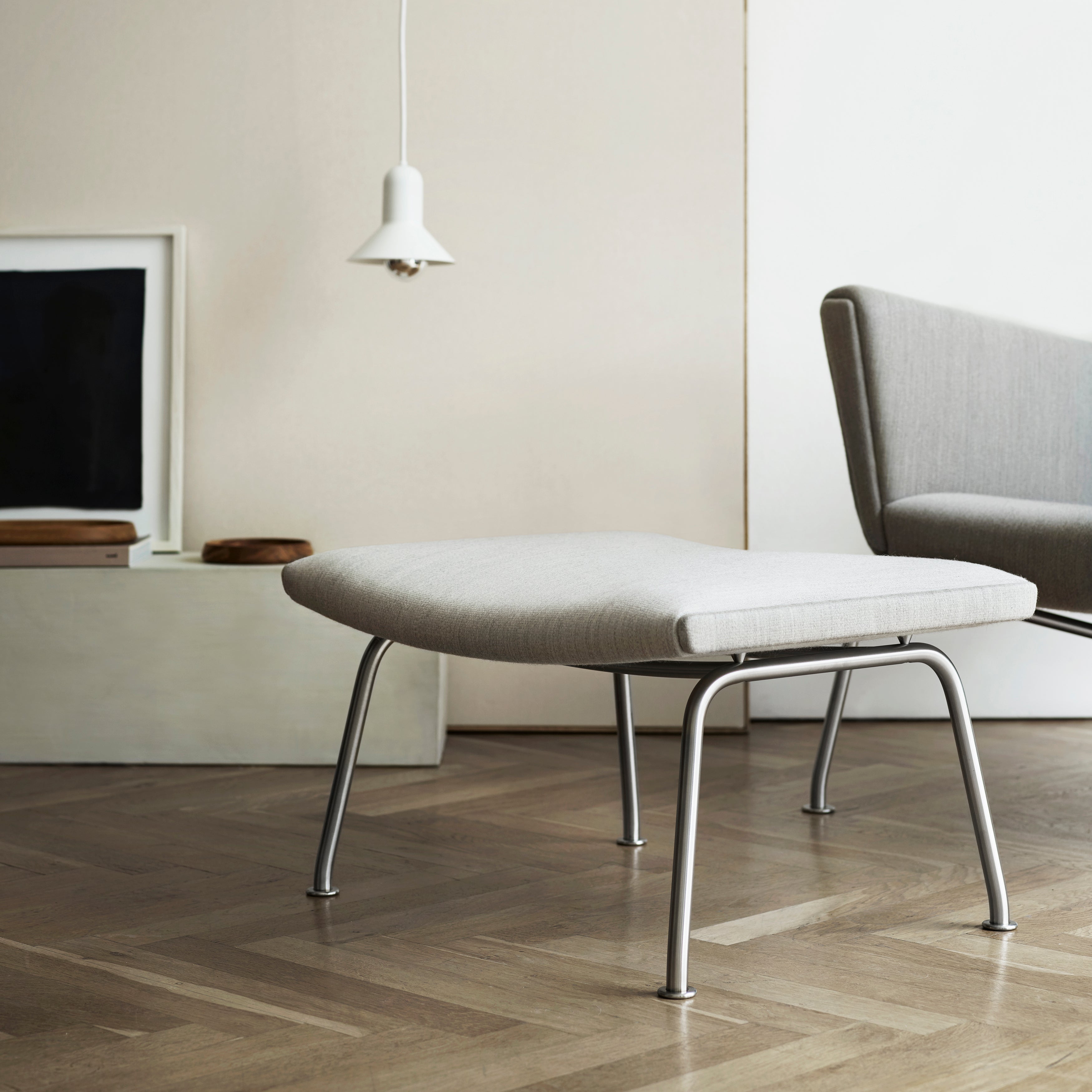 Hans J. Wegner designed this sleek footrest as an obvious match to his iconic CH445 Wing Chair and CH468 Oculus Chair (also at A+R). CH446 Footstool works equally well on its own or in groups, sturdily constructed with a solid beech frame and stainless steel legs that nonetheless impart a light appearance. Debuting in 1960 along with the iconic seating, it's available upholstered in either a fine fabric or leather selection from Danish maker Carl Hansen & Søn.