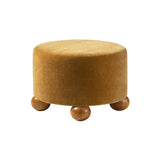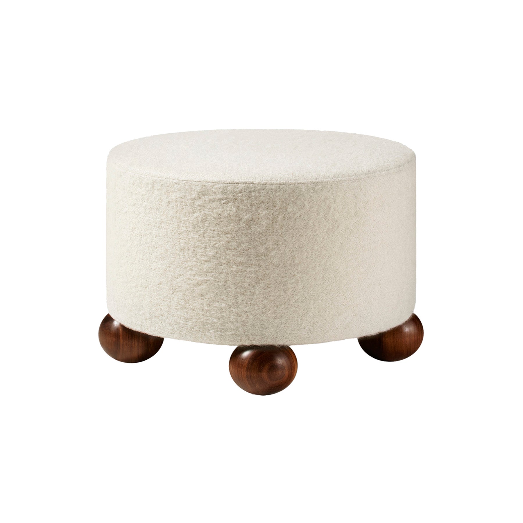 The Luupo Ottoman offers a versatile and stylish seating option with a round form resting on solid oak or walnut ball feet. It is upholstered in sheepskin or high-performance fabric. Constructed using traditional joinery methods, the frame is solid beech wood with foam cushioning. Its compact design makes it suitable as a footstool, side table, or extra seating.