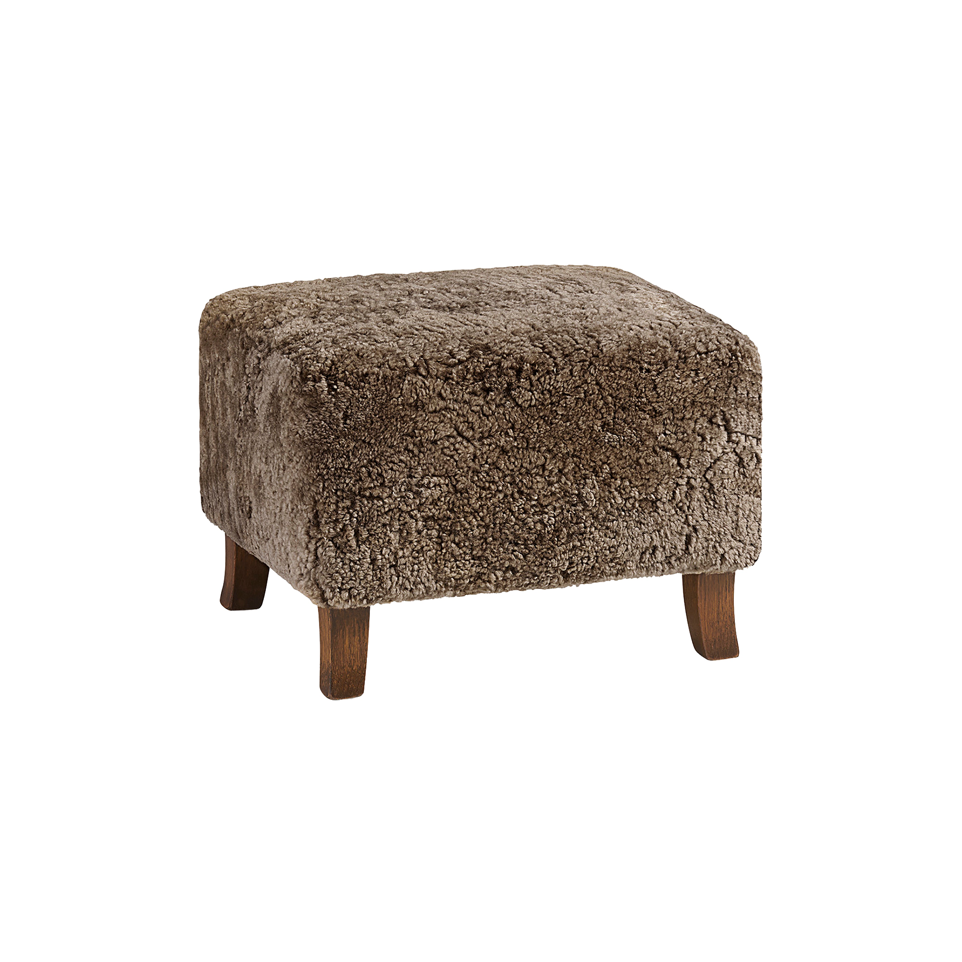The Ottoman showcases a flowing, organic silhouette characteristic of Danish Modern furniture. It is built with a solid beech wood frame and upholstered in luxurious materials like sheepskin, teddy mohair, and leather. It includes foam padding and linen webbing. Available in finishes oiled oak, fumed oak, and walnut.