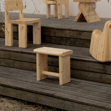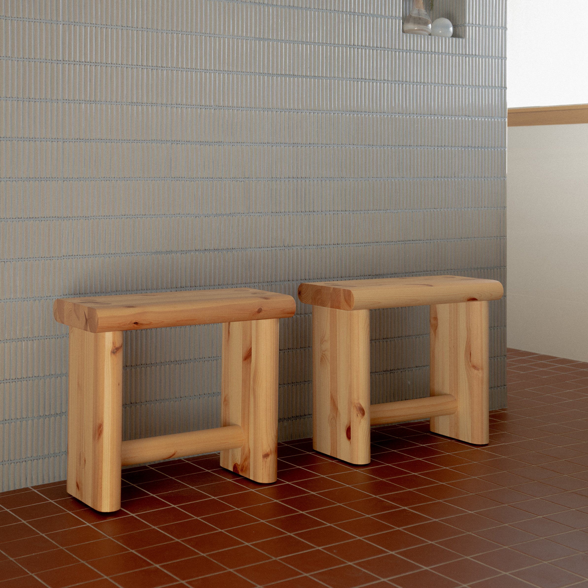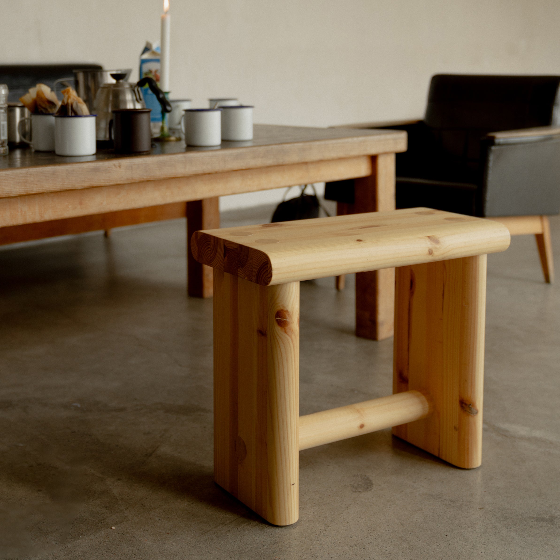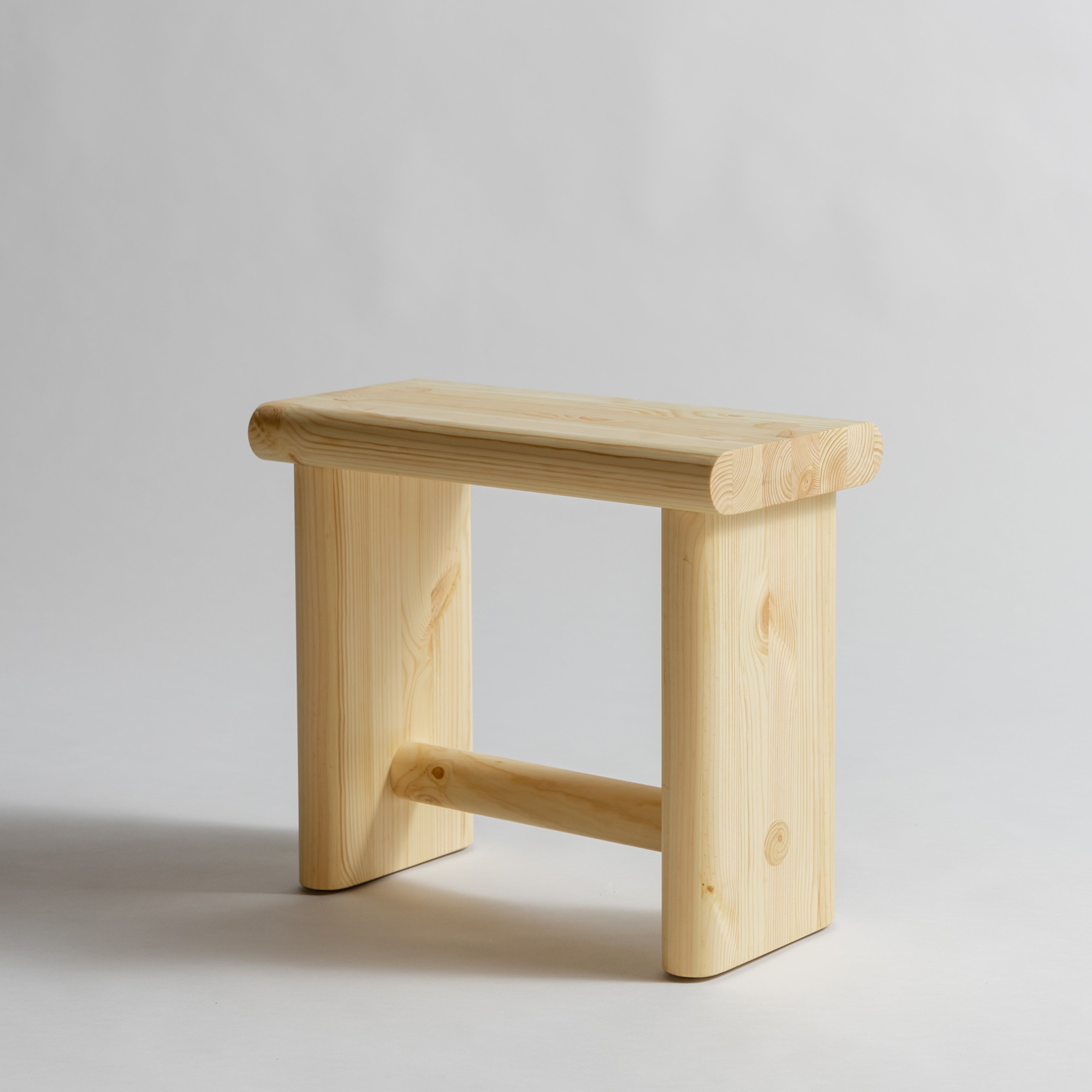 The Vaarnii 002 Ast Stool, designed by Dimitri Bähler, highlights the natural beauty of pine, with gently curved edges and prominent wood grain patterns. The stool is versatile, doubling as a side table, seat, or small bench. The name "Ast" refers to the German word for "branch," reflecting the visible knots in the wood. Over time, the pine will darken to a rich honey tone as it ages, giving it even more character.