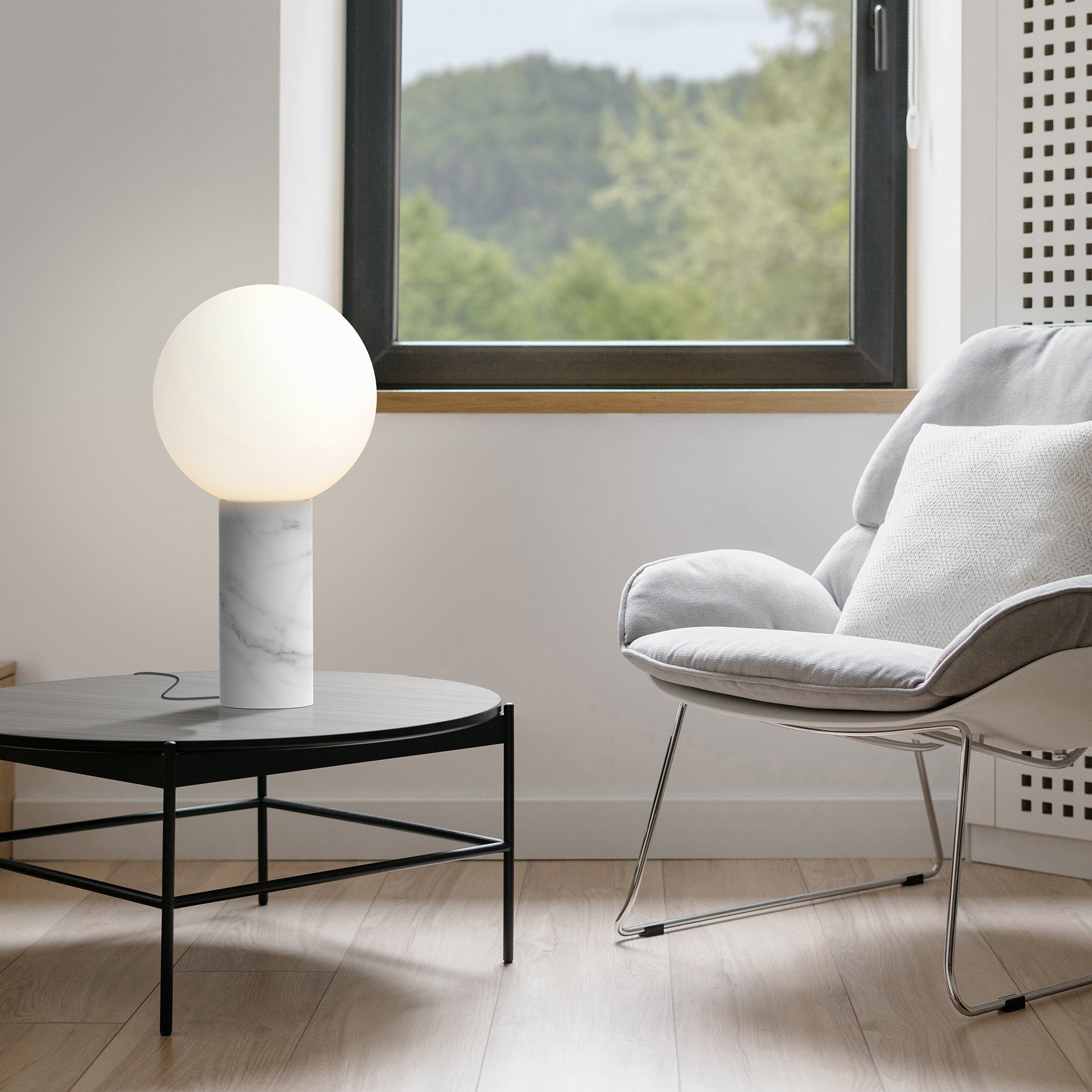 Chic and sculptural, Pilar features a stately column in luxurious marble topped with a substantial globe light in a refined play on an iconic silhouette. Offered with either a Carrara white and Marquina black marble base and frosted opal glass sphere, the geometric proportions bring out the character of its nuanced materials. With warm ambient illumination suitable for a range of spaces, Pablo's table lamp also features an inline full–range dimmer to select any desired light setting.