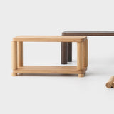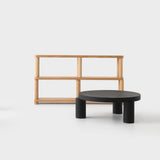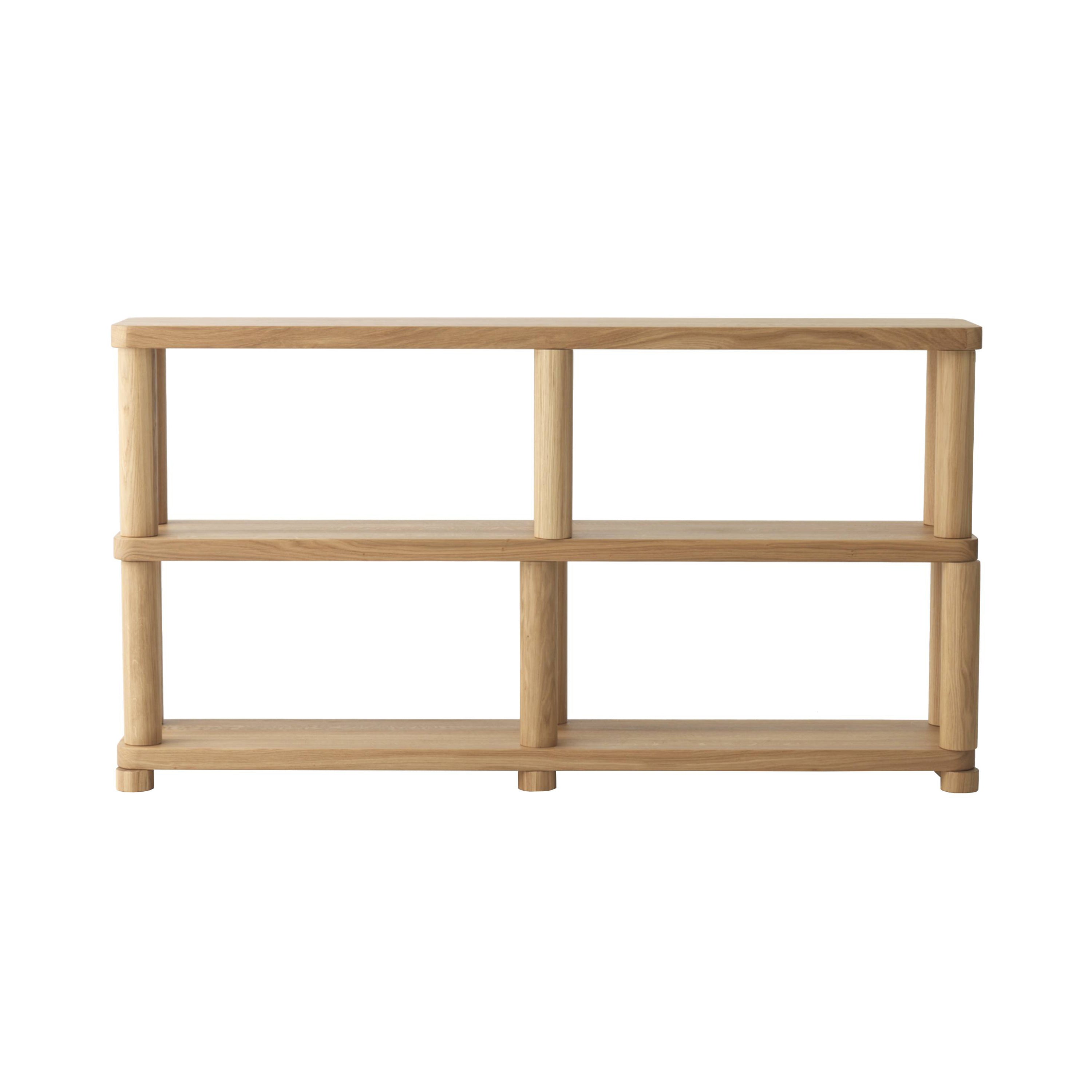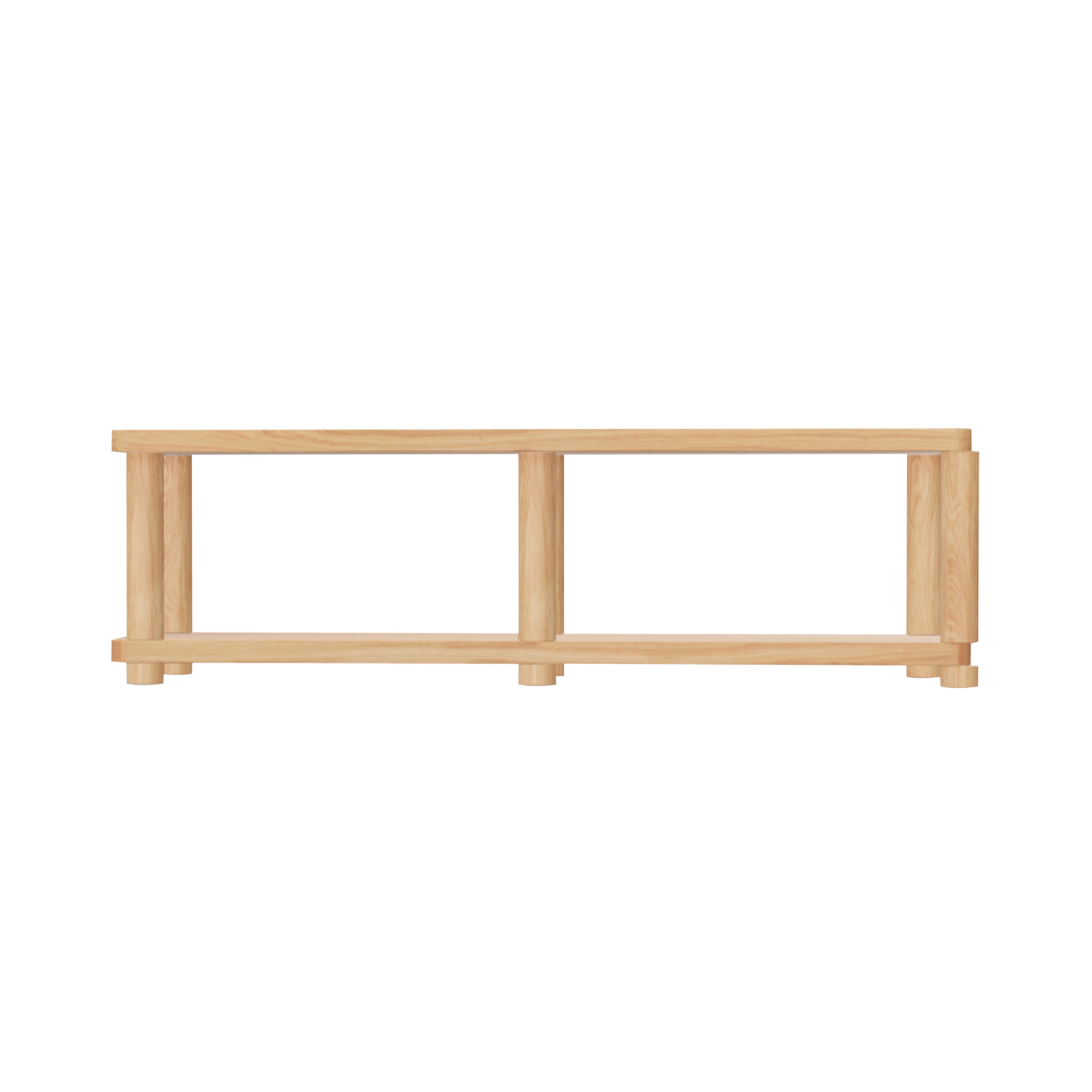 With a burly aesthetic balanced by a playful signature design element, Philippe Malouin adds a shelf version to his Offset range. Embracing the thickset beauty of solid oak, the unit lives up to its name with each leg appearing slightly off-center, via an adjustable threaded connector that enables it to sit in an individualized position. Available in natural and umber stained finishes, this Offset offers both storage and display possibilities in a choice of 2 lengths and single or double-tier models.