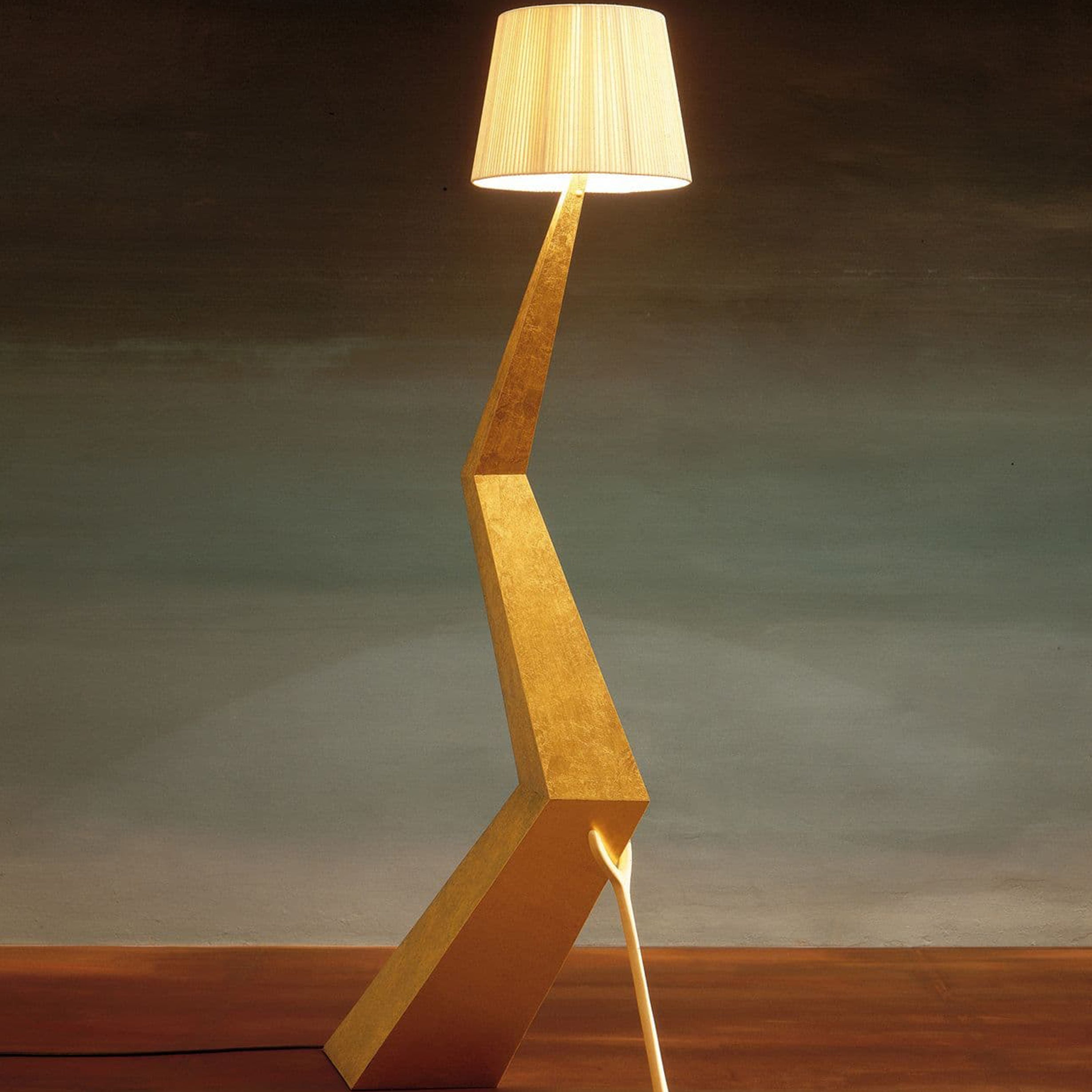 The Bracelli Sculpture Floor Lamp by BD Barcelona blends Salvador Dalí’s surrealist vision with functional design, created for his home in Portlligat with designer Jean-Michel Frank. The lamp features bold, angular lines resembling a lightning bolt, leading into an ivory lampshade, supported by a crutch-shaped wooden base. Its vibrant gold-leaf finish adds to its striking presence.