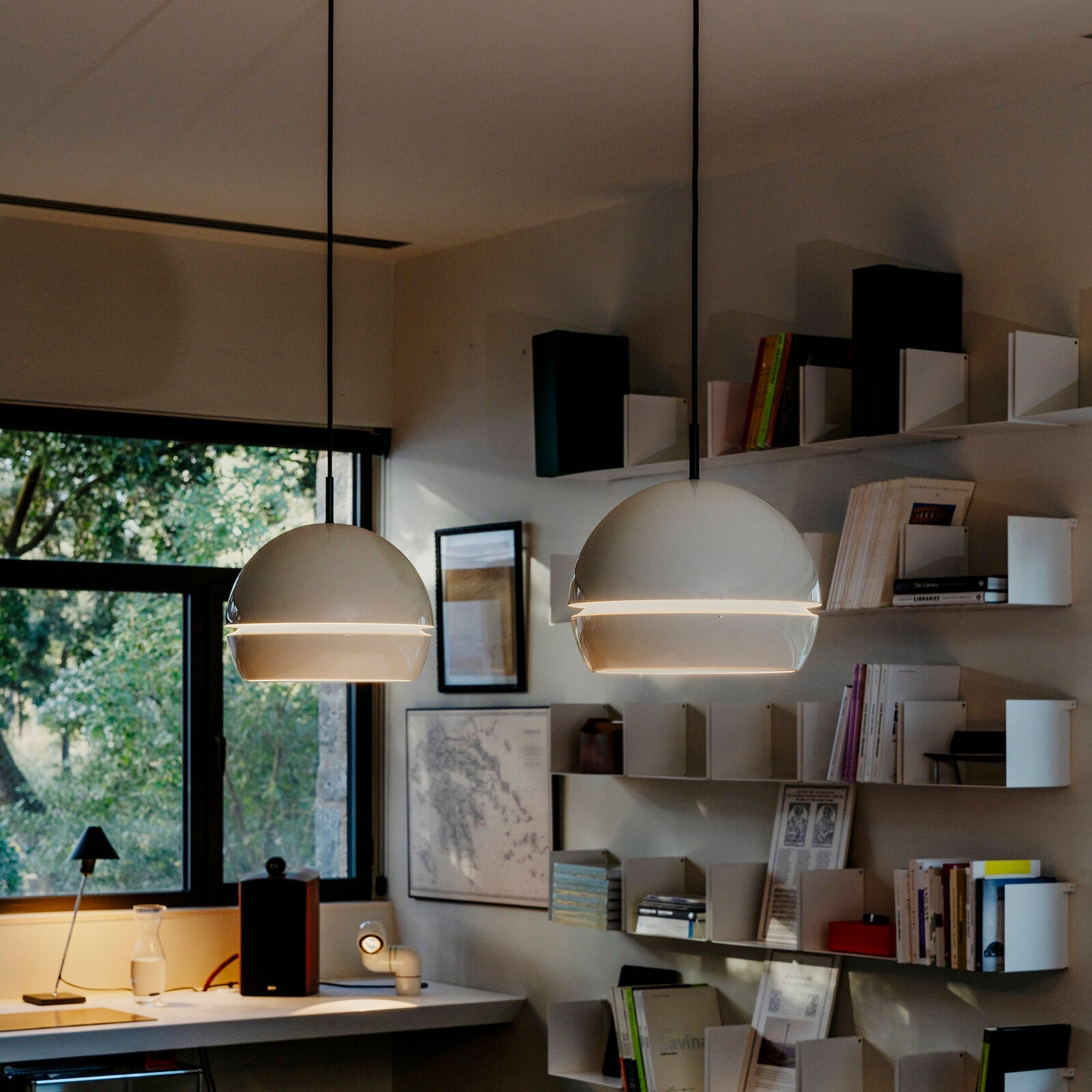 Barcelona's André Ricard took the design cue for his 1970 pendant from famed Argentinian artist Lucio Fontana, who rocked the art world by slashing his neat oil paintings. Similarly, the namesake light takes form as a futuristic half-spare bisected by an unmistakable slit that subtly illuminates the periphery. The glossy white metallic shade has a matte-finish interior that houses an efficient built-in LED light plate and translucent acrylic diffuser to lend a soft and glare-free atmospheric glow.