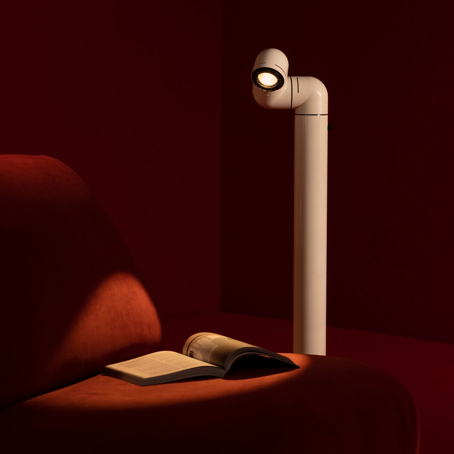 A beacon of '60s style, Santa & Cole finds a new groove with an updated floor lamp version of Tatu. André Ricard's design inspired by the curling shape of its namesake armadillo features 3 sections that rotate independently to direct light wherever it is desired and a moveable converging lens for adjusting the beam's focal length. In high-gloss red or white ABS plastic, the lamp has a built-in, dimmable LED for tweaking the illumination's intensity, making it a perfect partner to a reading chair.