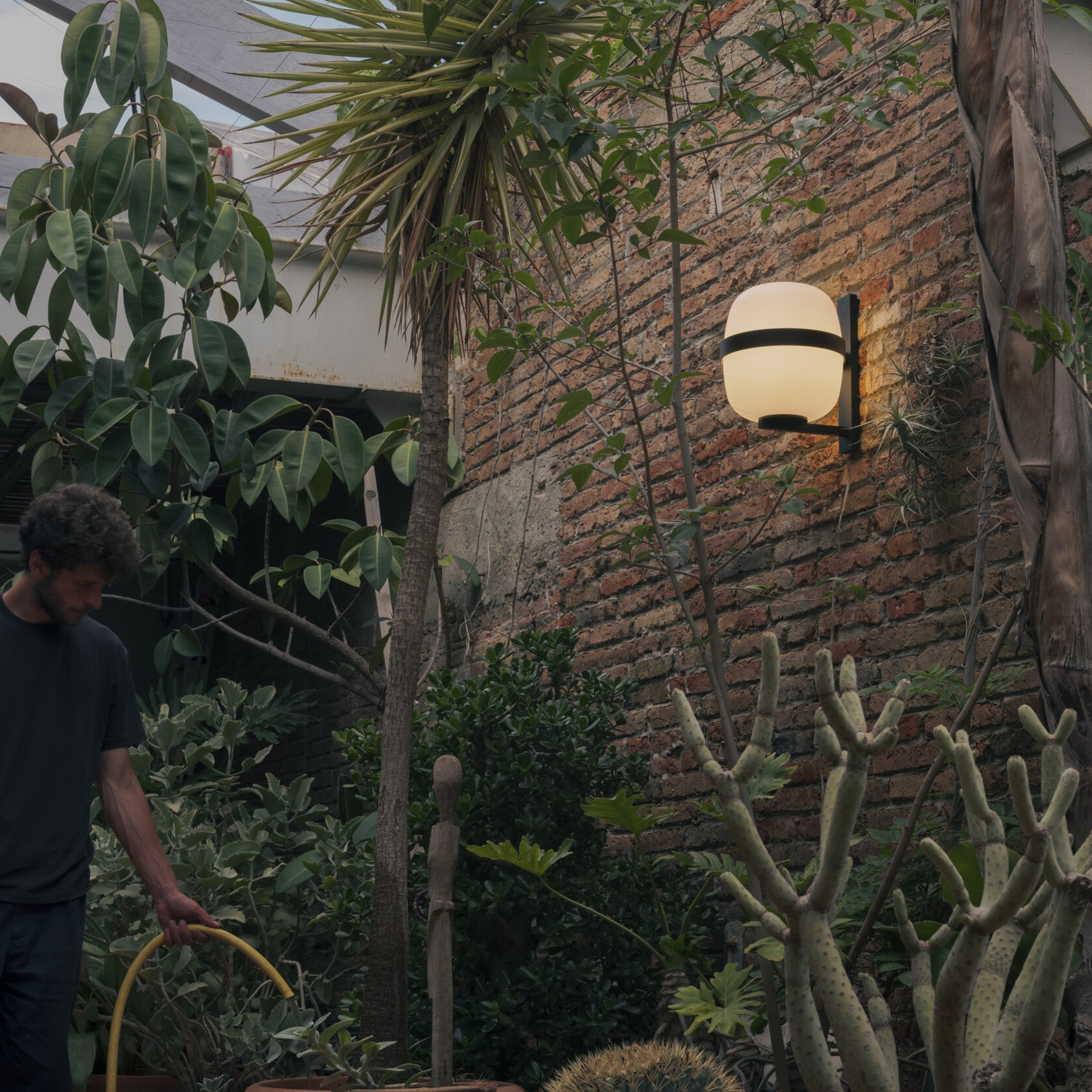 Cesta—Spanish for “basket”—with its similarly ring-shaped structure wrapping around an opal glass globe, adapts in a wall lamp that shares the same sense of offhand elegance. Miguel Milá’s iconic 1962 design, inspired by an impromptu find in the streets of Barcelona, is supported by a metal ring in matte white or black and can be used indoors or out. From its industrial origins, Cesta has become a modernist classic that provides a wonderfully diffuse and atmospheric illumination.