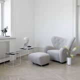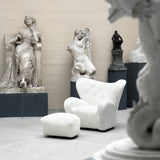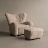 Eyeing utter relaxation, designer Flemming Lassen designed a companion footstool to accompany his overstuffed easy chair for The Copenhagen Cabinetmakers' Guild competition in 1935. The Tired Man created a sensation with its organic curves and voluminous armrests in genuine sheepskin that the designer said was "as warm and safe as a polar bear cub in the arms of its mother." Now available in a range of stock fabrics as well, the matching footstool makes for the last word in cozy comfort.