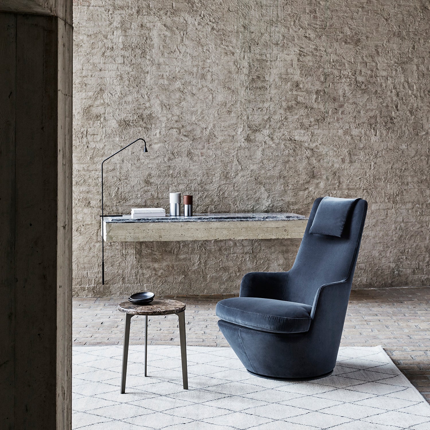 This proudly high-back version of Bensen’s series of swivel lounge chairs starts with the signature circular metal base that rotates smoothly a complete 360 degrees. Hi Turn offers comfort aplenty with the combination of an internal steel frame, injection molded cold foam and a cushiony soft down seat. The chair has an impressively tailored look but the fabric covers are handily attached by velcro and are easily removed for cleaning or replacement.