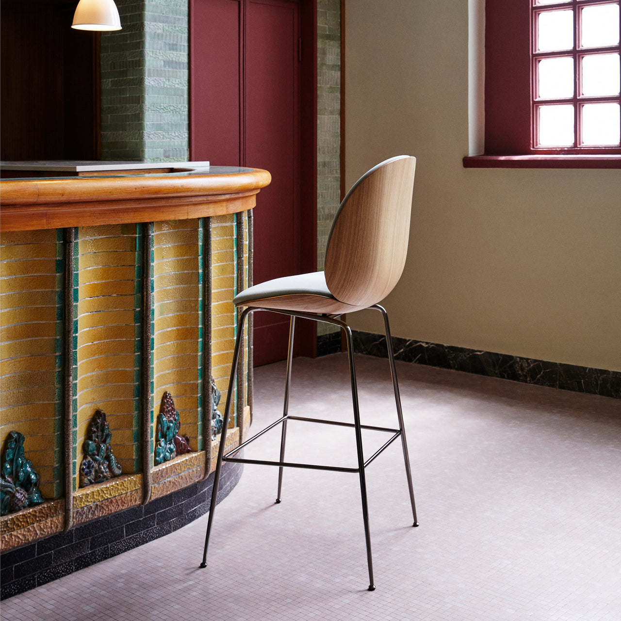 Gubi readily extends its veneer Beetle seating in a bar stool with a choice of leather or fabric for the front-upholstered seat and a conic base in a range of metal finishes. Lending an organic elegance, the molded walnut or oak shell duplicates the original chair’s distinctive curved look as well as its defining comfort and flexibility. With the natural emphasis on the vertical grain and color of the wood, it also offers custom appeal in the choice of premium upholstery.