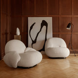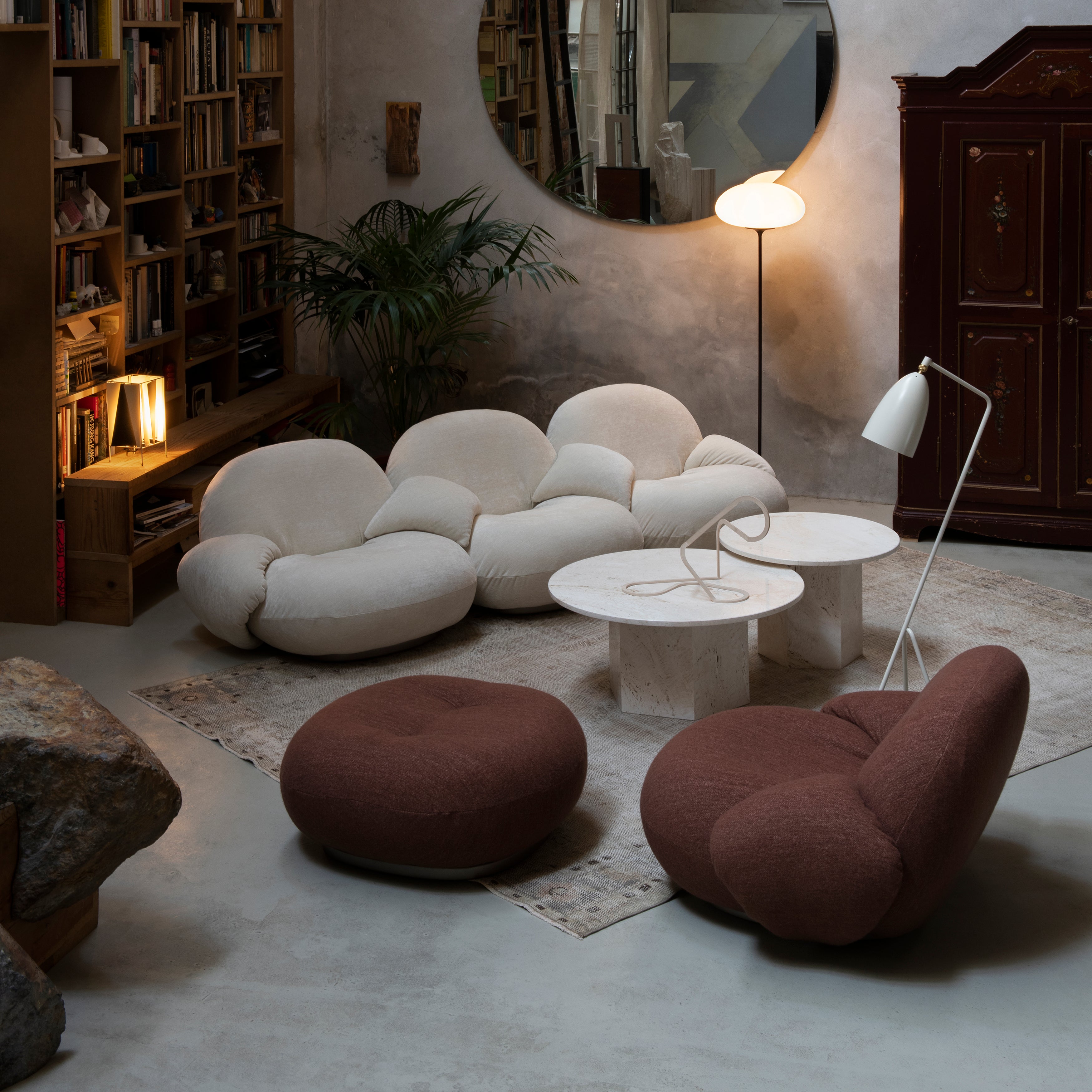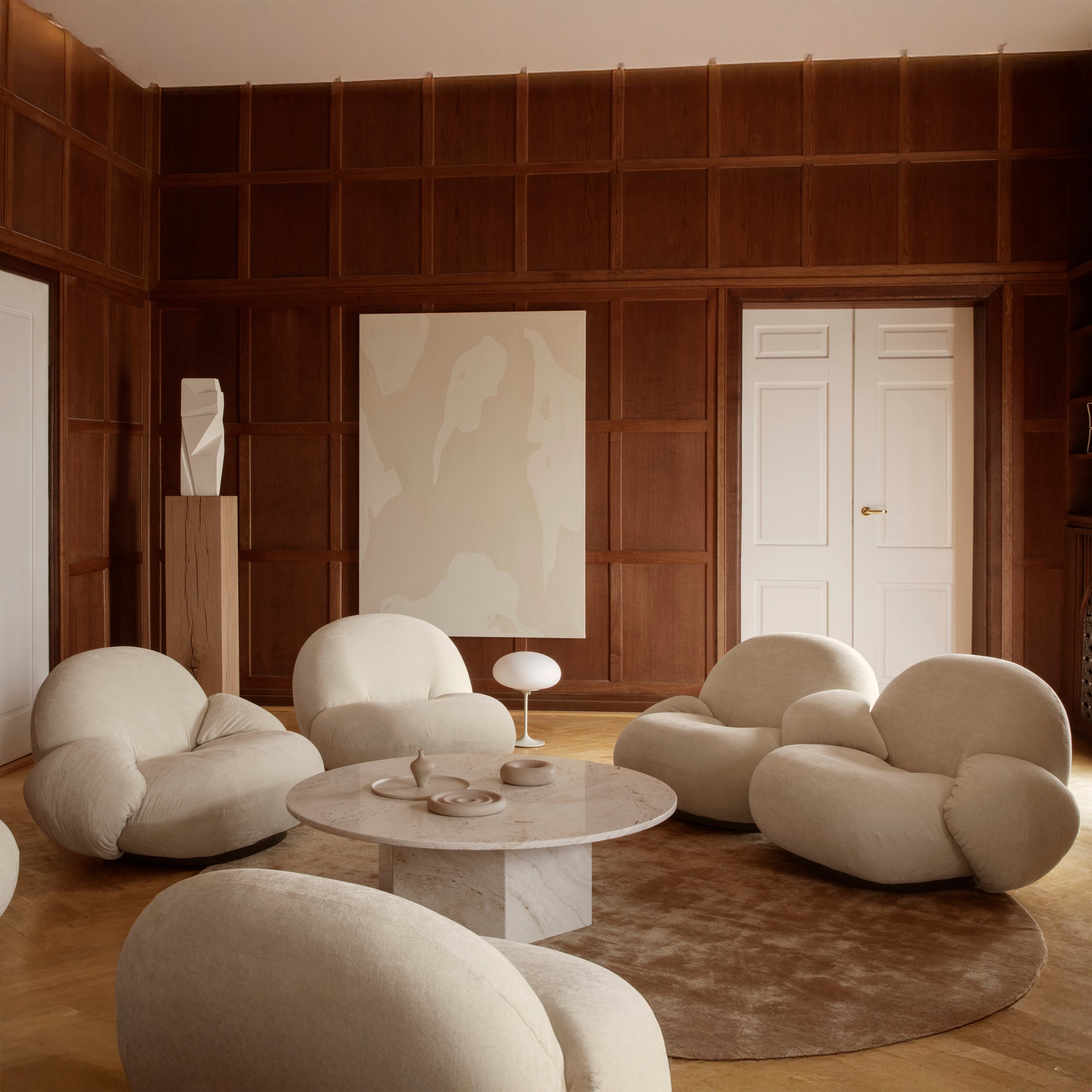 Designer Pierre Paulin’s 1975 vision of “sitting on clouds” gets an armrest to provide added support and allow one to lean with ease to either side. Curvaceous, soft and low to the floor, Pacha delivers endless comfort in a lounge chair, with the choice of a fixed base or swivel with return in black or pearl gold. Once ahead of its time, Paulin’s joyfully modernist creation comes into its own as reissued by Gubi, true to its original ergonomic precision and customizable upholstered contours traced with stitching.