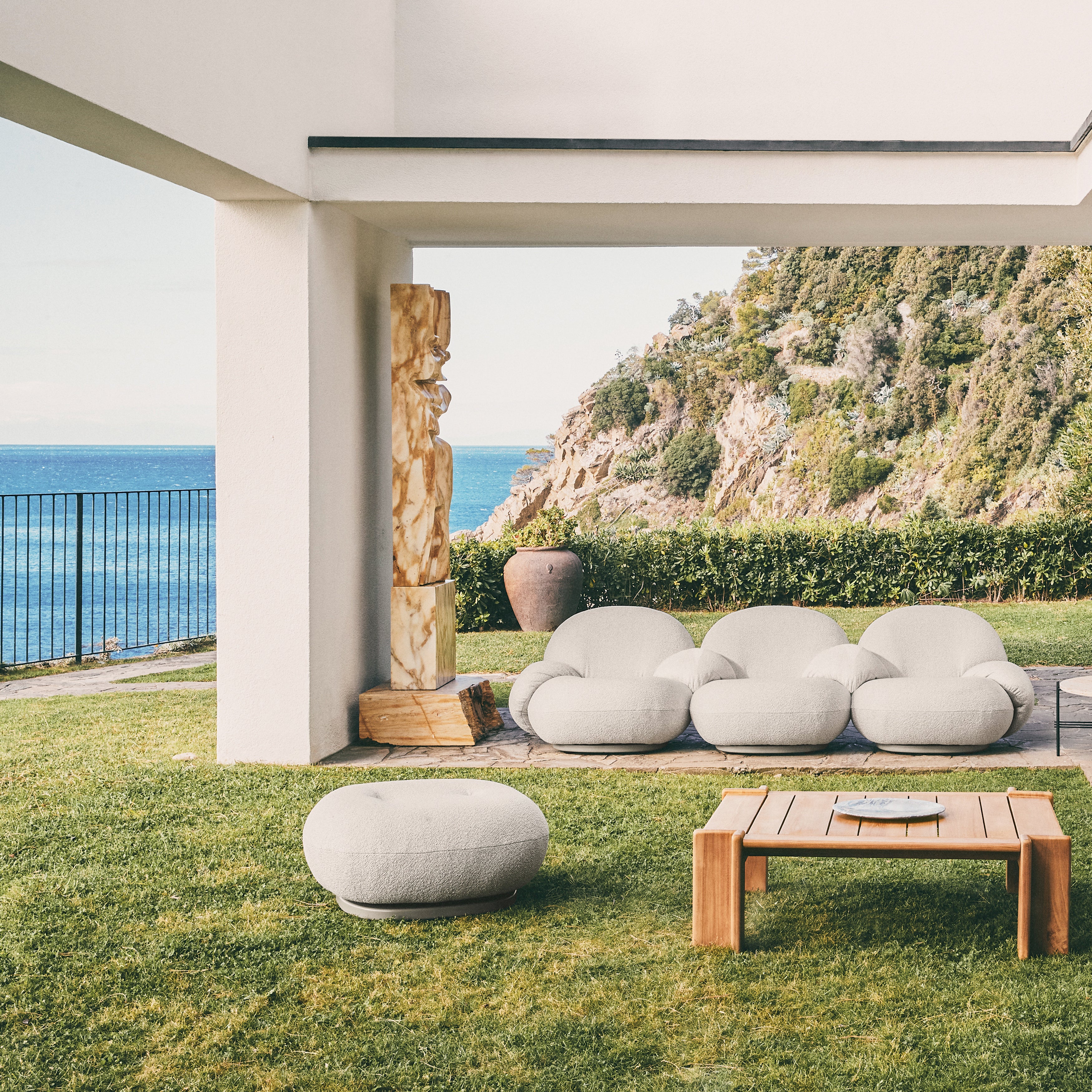 Raised lightly in a swivel base, Pierre Paulin’s rounded ottoman gets an outdoor version to accompany Gubi’s alfresco take on the designer’s pioneering 1975 Pacha collection. As a footrest or spare seating, the curvaceous upholstered form features a specially developed membrane interlayer that is both water-resistant and breathable to ensure quick drying after exposure to rain. The base is made from moisture-resistant plywood and includes a full turning mechanism in stainless steel, bringing both creature comfort and utility to this enduring classic.