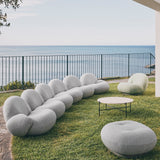 The Gubi Pacha Outdoor Sofa with Armrest and Ottoman blends sculptural elegance with modern durability. With its low-slung, cloud-like form, this outdoor version retains the original’s soft curves while incorporating weather-resistant materials. The sofa’s organic shape offers a relaxed seating experience, enhanced by integrated armrests for added support. The ottoman mirrors the contours of the sofa, functioning as a footrest or additional seat. Designed for the outdoors, it features a breathable, water-resistant membrane for quick drying, a moisture-resistant plywood base, and a removable rain cover for extra protection.