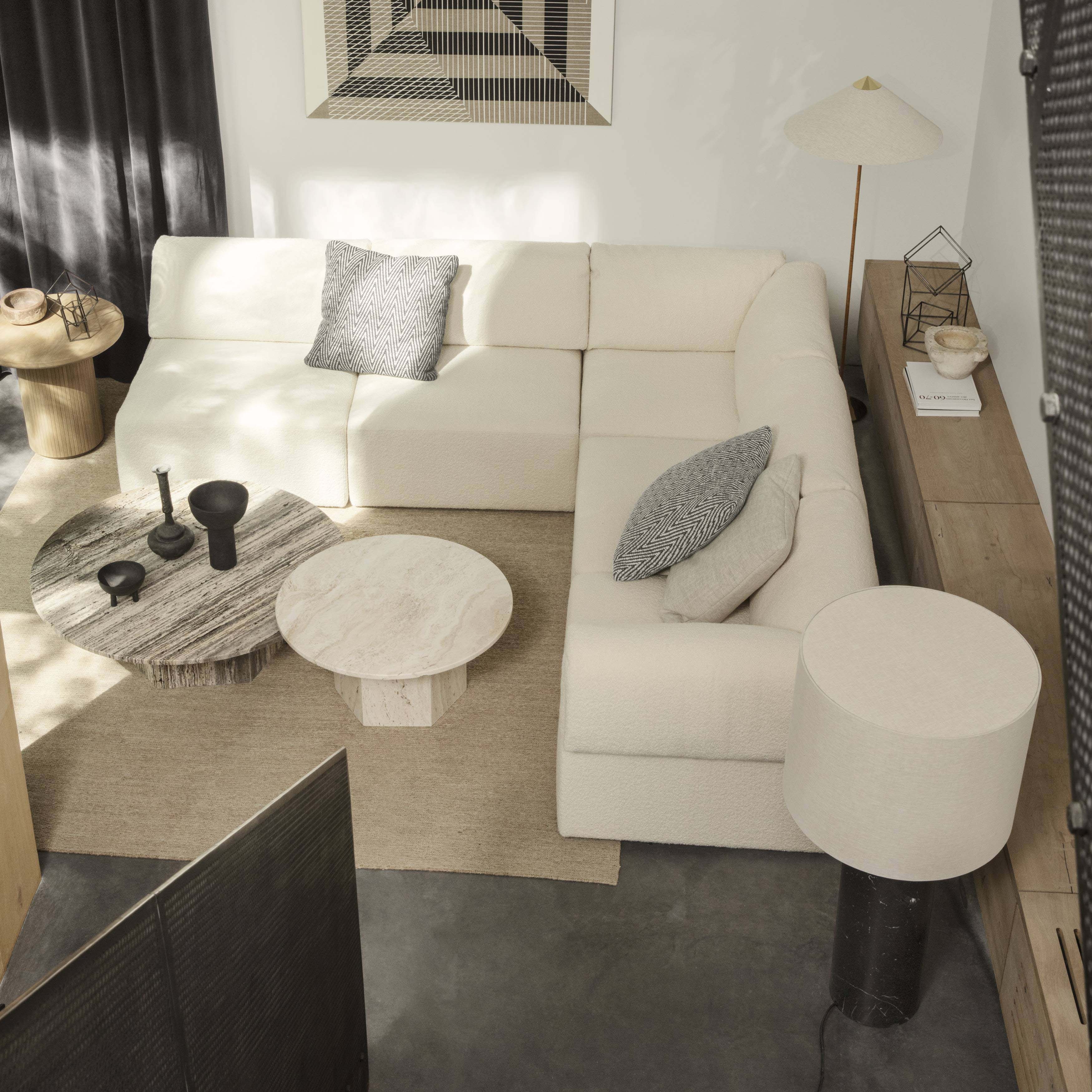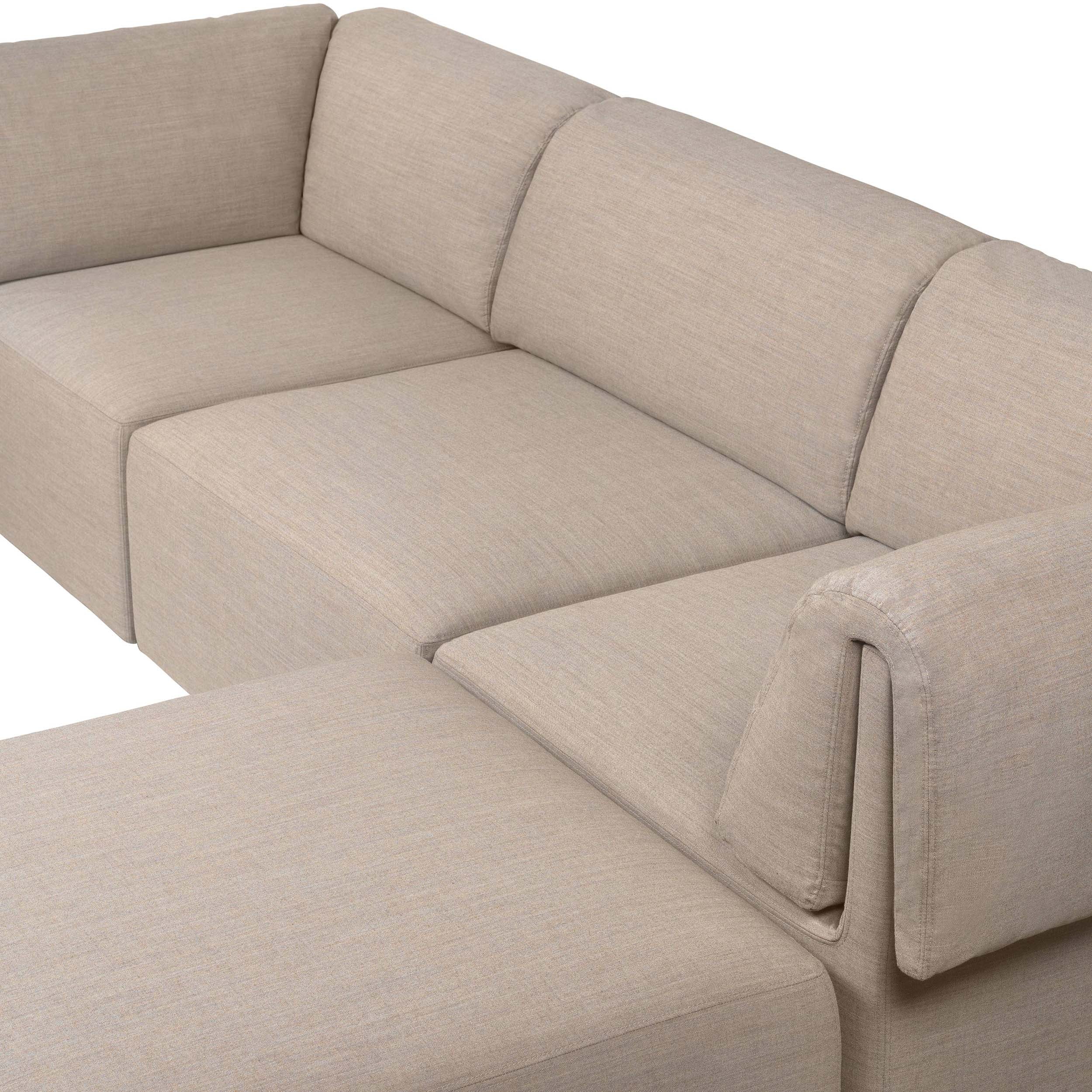 Anchored against a wall or as a freestanding piece, this corner composition of modular sofa elements provides a marvelously comfortable group hangout. A timely reinterpretation of 1970s lounge furniture by Space Copenhagen for Gubi, the seating features distinctive folded cushioning with a rounded padding of duck feathers and foam particle that is ingeniously secured with magnets over the ergonomic structure of the backrest. The expanded proportions offer plenty of room to sit and sprawl for hours of contentment. And the range of select upholstery options as well as a choice of seam detailing offer a sense of relaxed sophistication to suit a range of interiors.