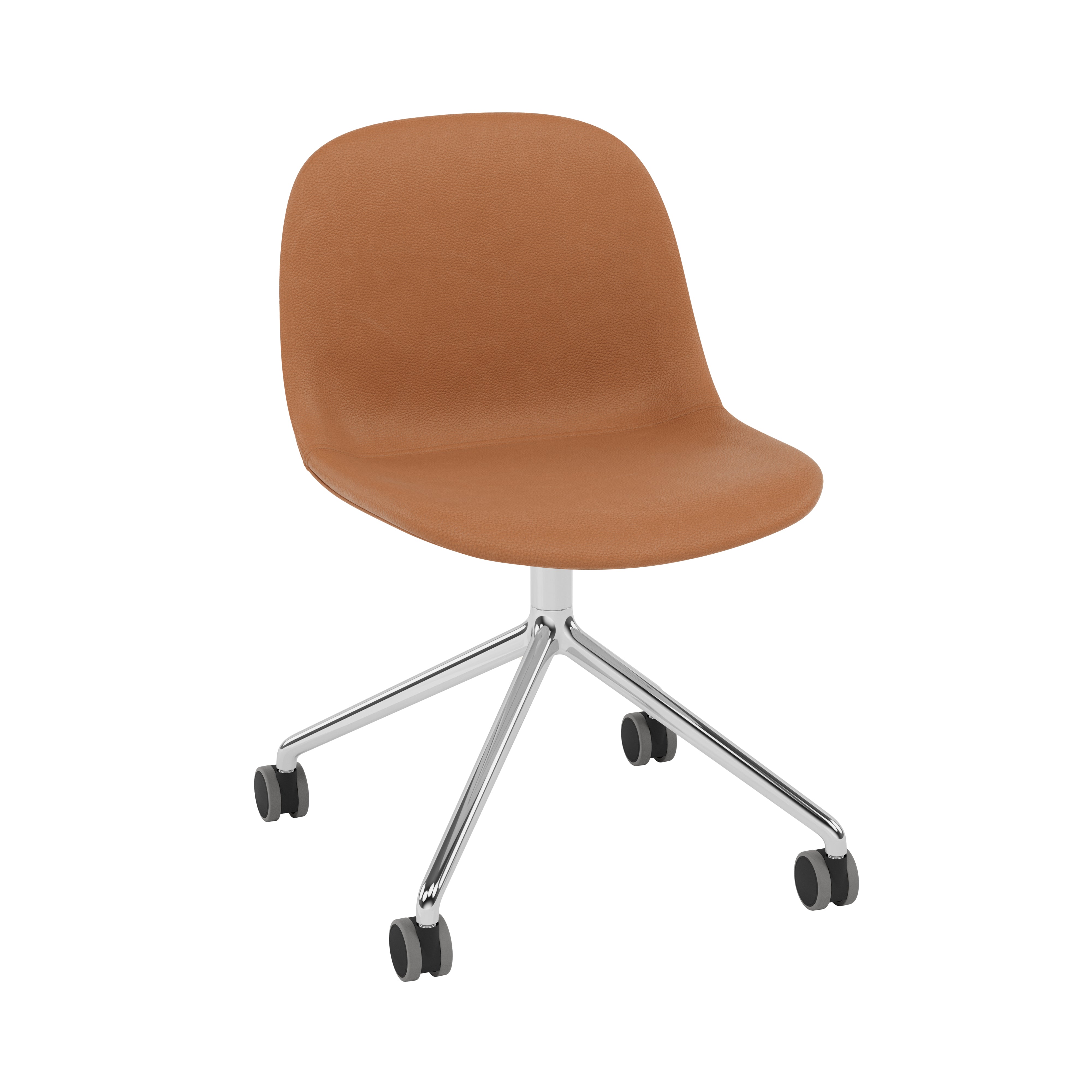 With its office-friendly rolling swivel base, this comfortably cushioned side chair clad in either leather or fabric extends Muuto's Fiber collection. Copenhagen-based design duo Iskos-Berlin offer defining versatility in their reworking of the classic molded chair without sacrificing comfort. Their updated shell seating features an innovative composite of plastic and wood fibers for the underlying form, with a soft matte texture to complement the upholstery.
