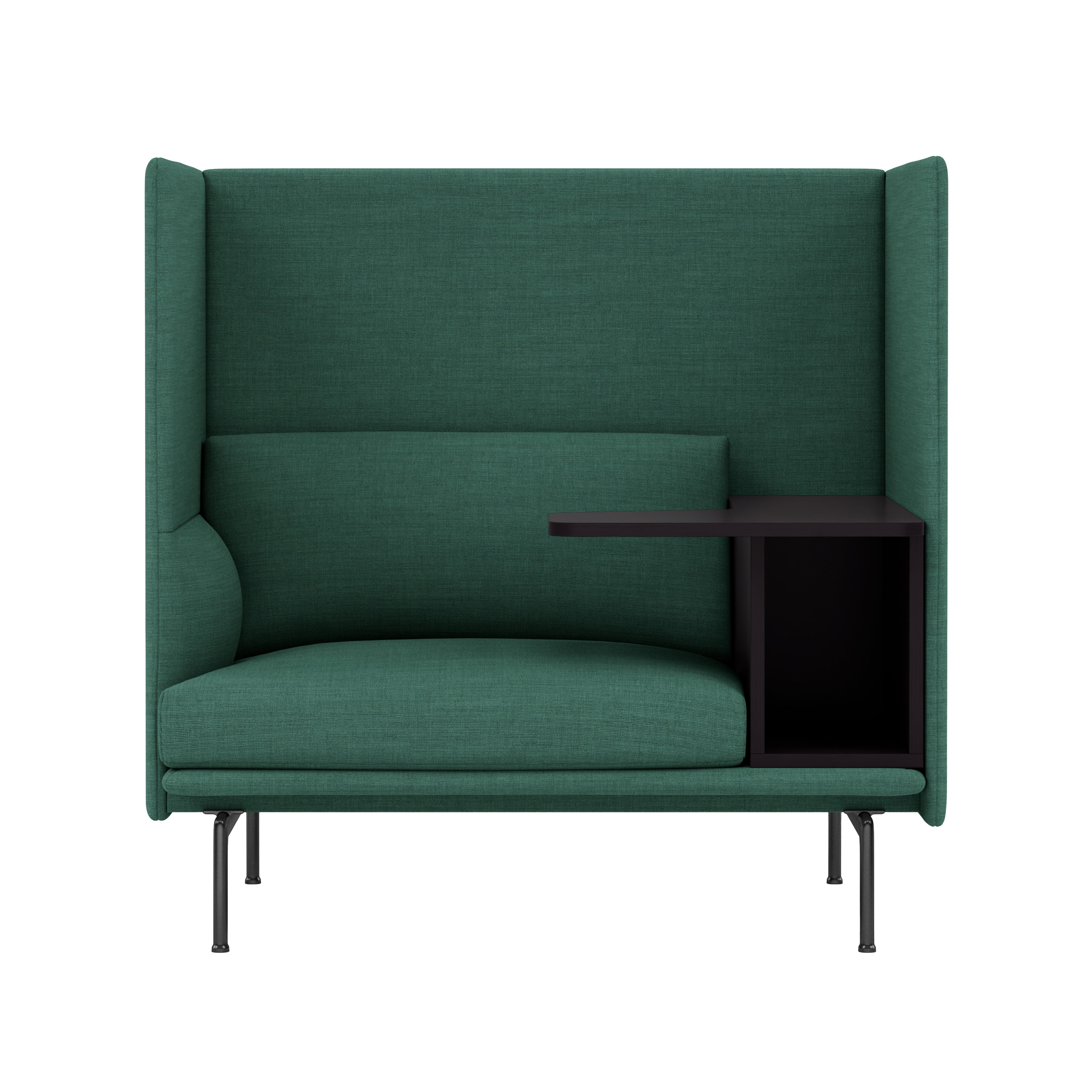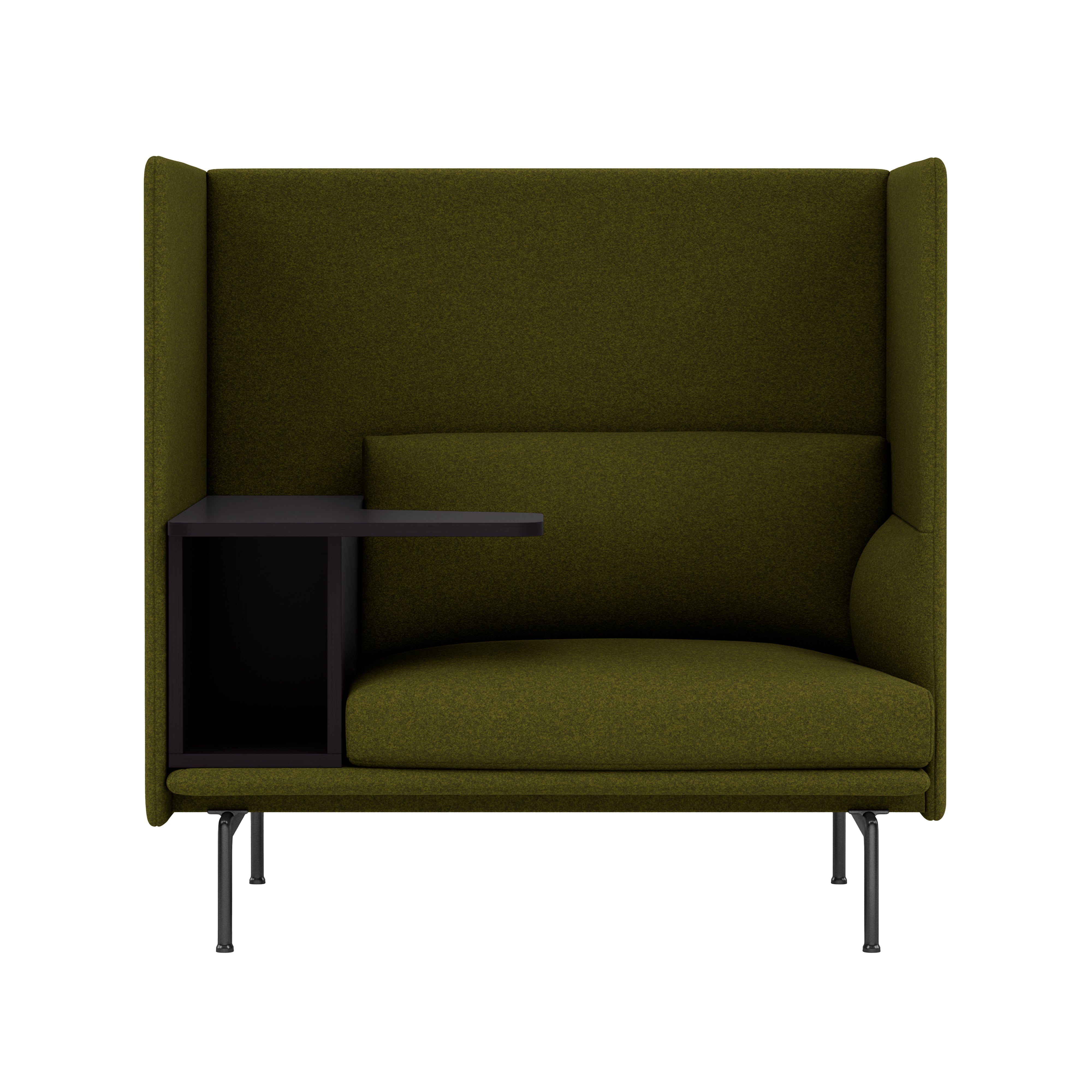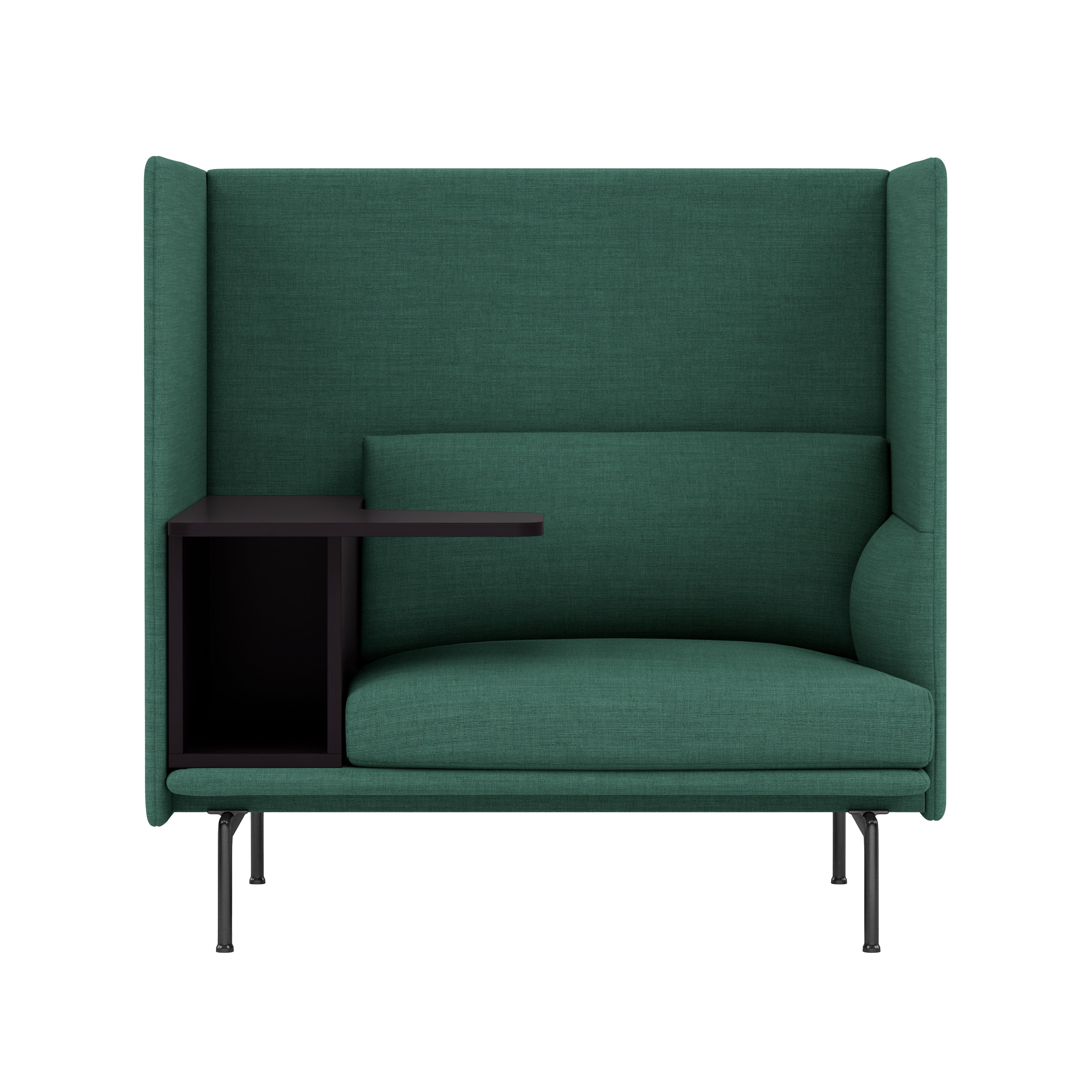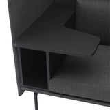 Highback Work extends the clean lines of the Outline seating series, creating an acoustic and spatial enclosure with an integrated desk-storage cubby and handy cable outlet. With a choice of premium stock upholstery selections, the seating is available with left or right orientation and features durable wood and steel construction, cold-foam fill and black powder-coated or polished aluminum legs. The work table in black MDF with a matte lacquer finish makes it an ideal fit in any open-plan space, hospitality setting or workplace.