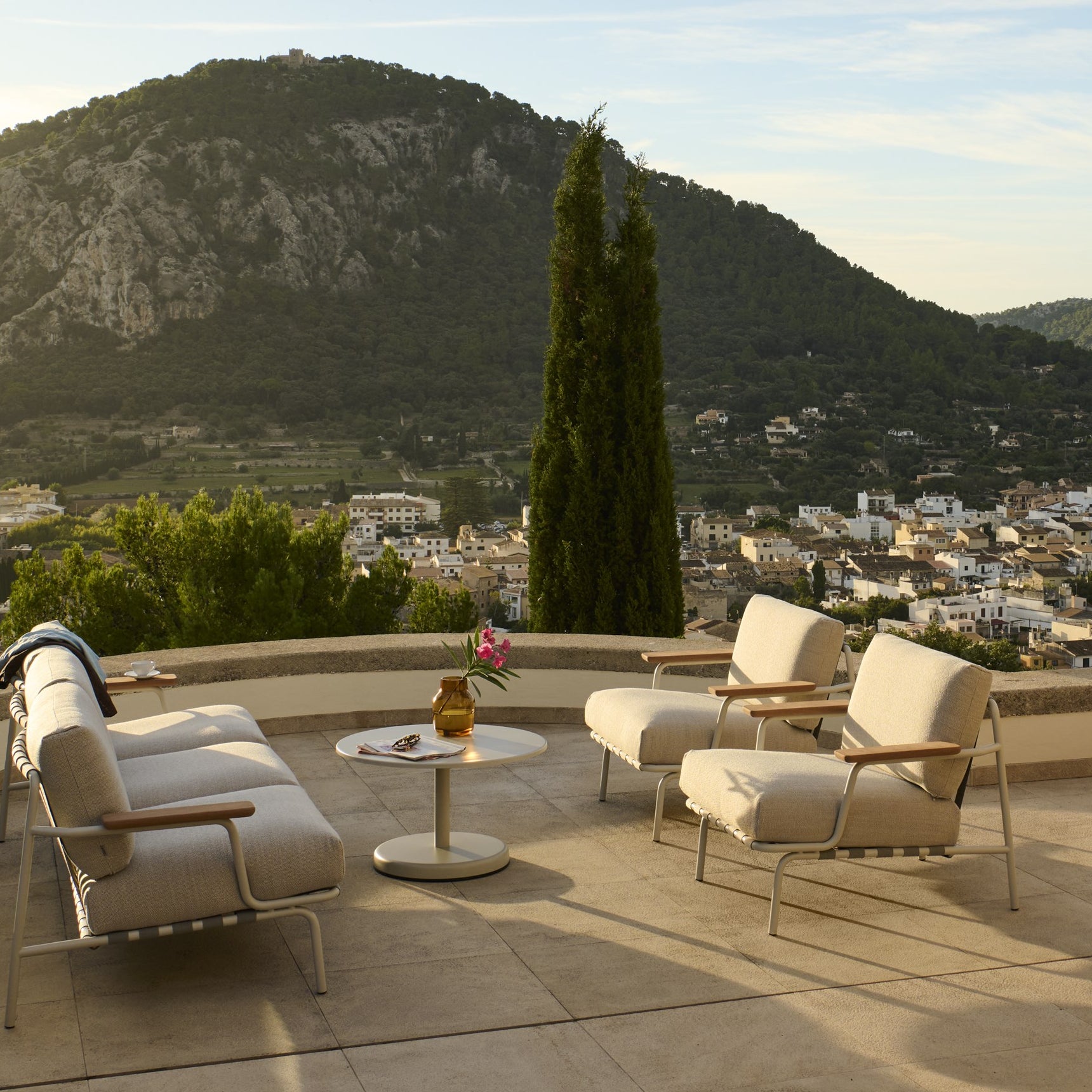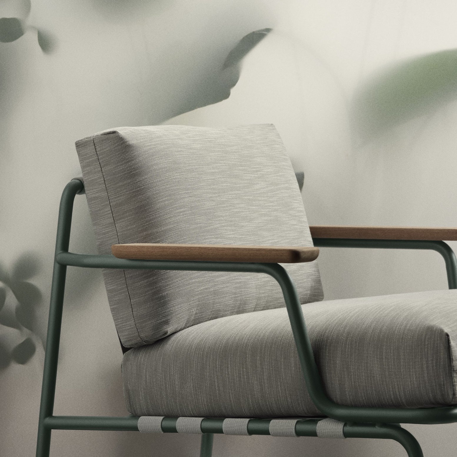 The Settle Lounge Chair features a minimalist steel frame paired with natural materials for a refined and airy design. FSC™-certified sapele mahogany armrests provide a warm, tactile contrast to the sleek metal structure. The seat and back cushions, made with quick-dry foam and durable outdoor fabrics, resist weather and are easy to maintain. Visible strap details add character, while the ergonomic design offers lasting comfort.
