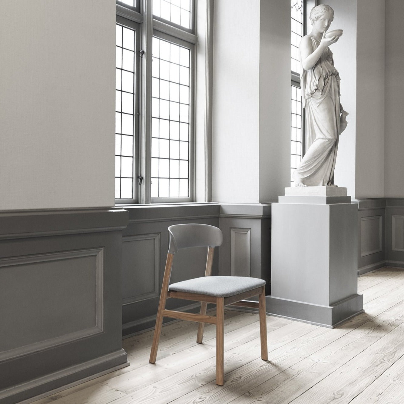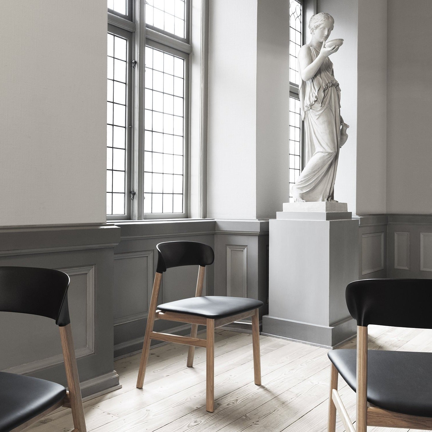 The option of a leather upholstered seat adds a luxe dimension to Simon Legald’s hi-tech refresh of a classic Danish chair. This Herit (short for “heritage”) version combines a solid oak frame with a ergonomically designed seat and backrest in plastic molded over a core of foam, an innovative technique that brings substance to the comfortable and expressive contours. Then sheathing the seat in fine leather lends this future-classic seating an additional air of subtle refinement.