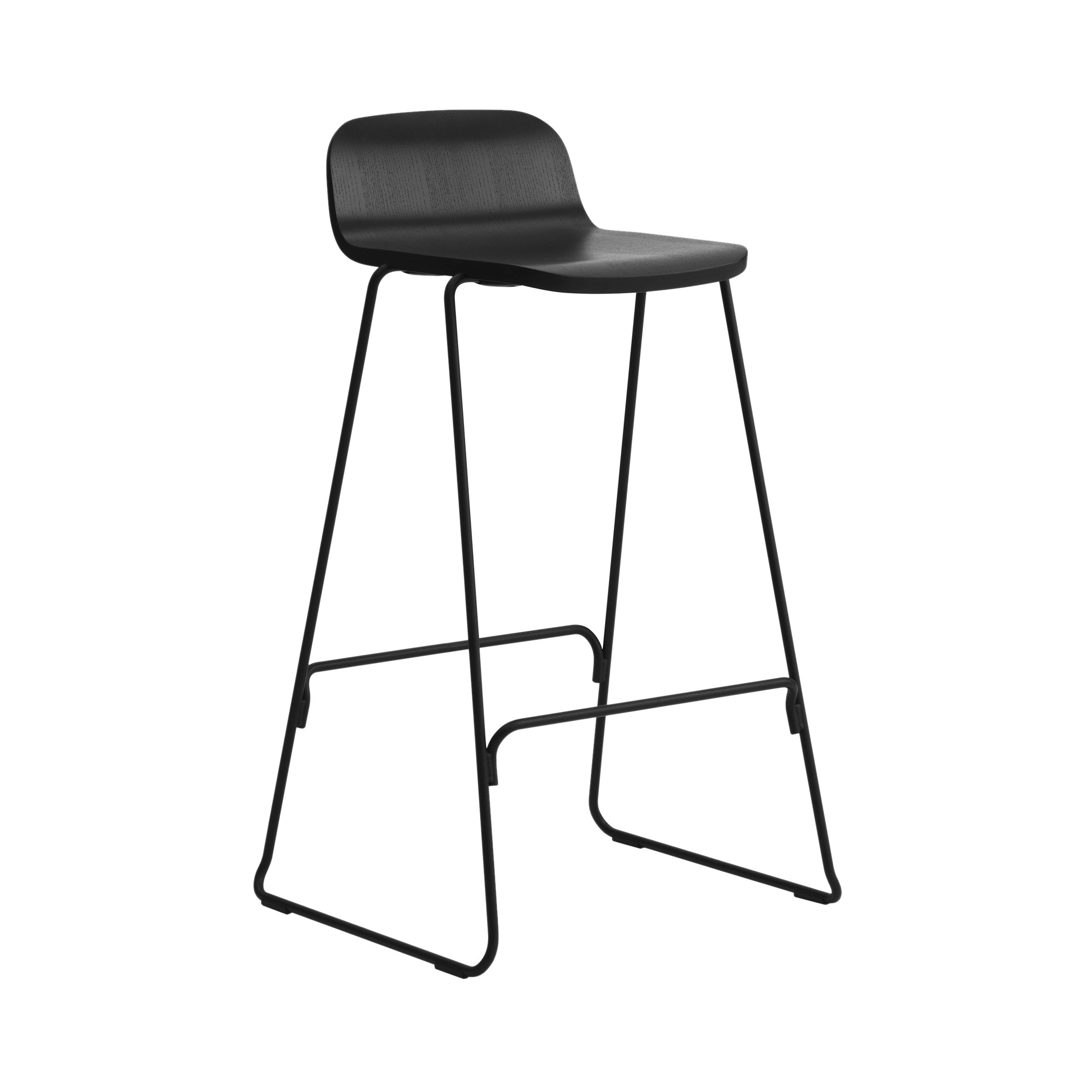Riffing on their signature molded seating, design duo Iskos-Berlin readily extend the concept to a bar or counter stool. Just adapts the veneer shell with a lower back and seamlessly joins it to the metal base with its comfortable footrest. Available in natural oak with a chrome base or in black-stained ash with black metal, the stool reflects the same unfussy ethos as the rest of the seating series.
