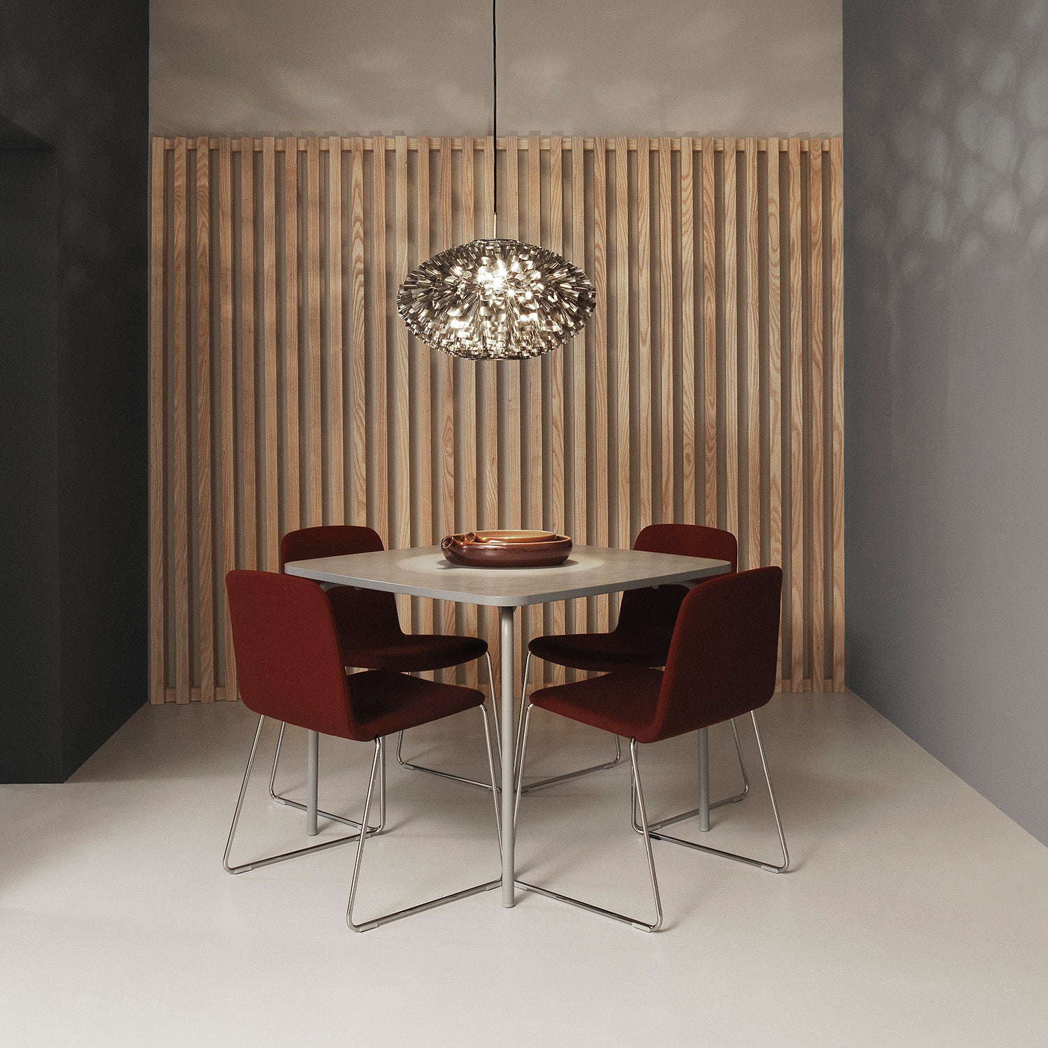 Upholstery adds a luxurious dimension to Just, the molded seating designed by Iskos-Berlin. Starting with a shell made of molded ash veneer and covered with PU foam, the chair is then sheathed in fine textile or leather. The gleaming chrome frame is seamlessly mounted to the seat underneath and the chair is stackable, though care must be taken not to harm the fabric. Just makes for “just” a versatile addition at home or in the workplace.