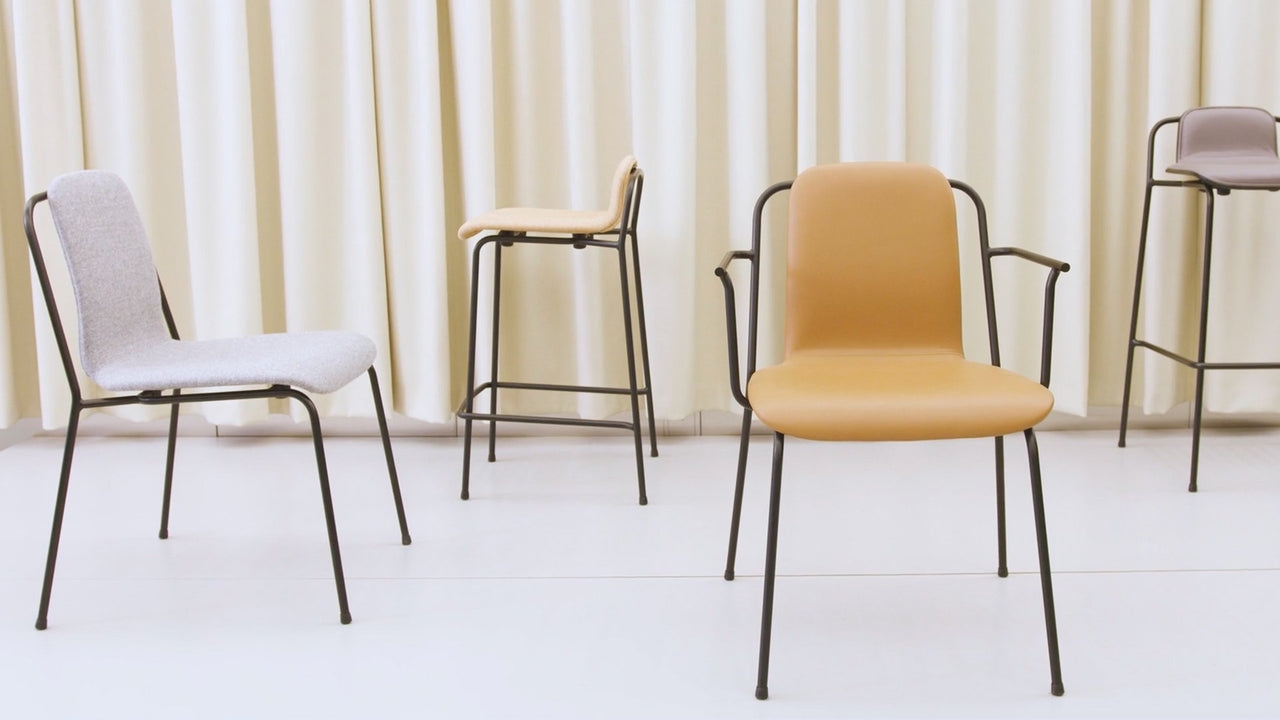 Front upholstery allows for a personalized version of designer Simon Legald's bar- and counter-height stool for Norman Copenhagen. With its oak plywood shell and black steel frame, Studio's padded front is sheathed in a choice of premium fabrics or naturally treated leather. The crisp profile of the frame lends an elegant counterpoint to the softer seat contours making it a standout for both private and public spaces.