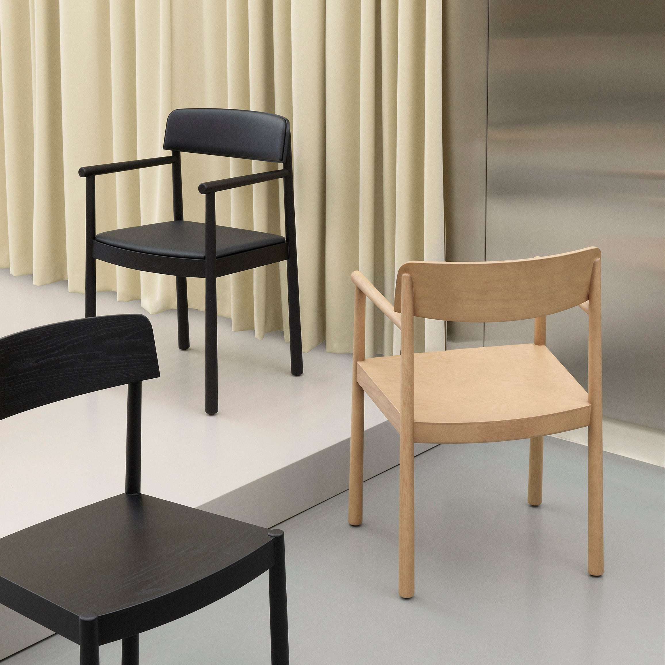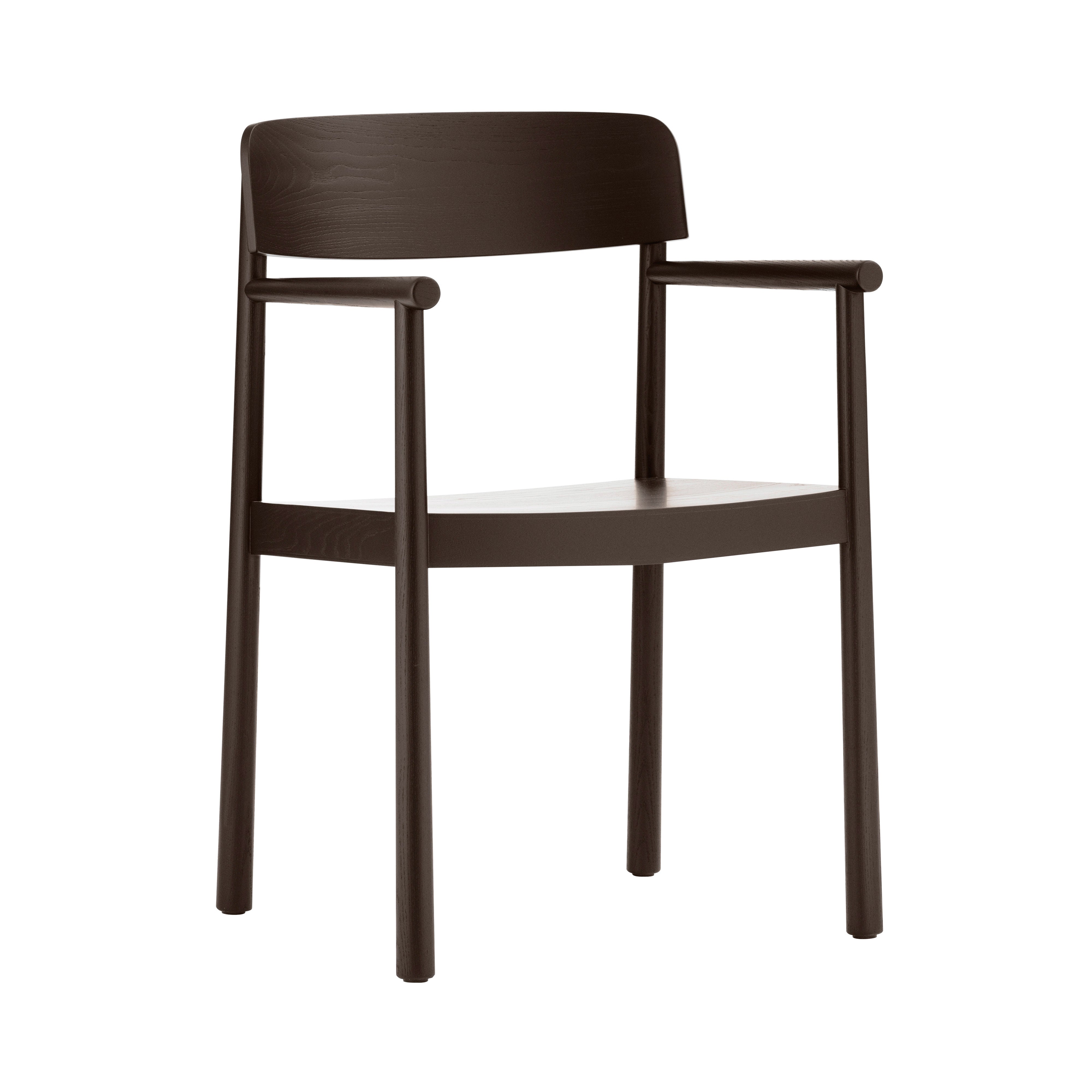 Timb adds supportive armrests to the wide, comfortable seat and backrest of Normann Copenhagen's sublimely simple wood chair. Designer Simon Legald essays the quiet contrast between its gentle curves and sharp lines with an artisan finesse, employing traditional dowel joinery that eliminates the need to use metal screws in its production. Fashioned from sustainably sourced solid ash with the seat and back in ash veneer, the chair comes in assuredly neutral shades of tan or black lacquer that are compatible with a range of interior styles.