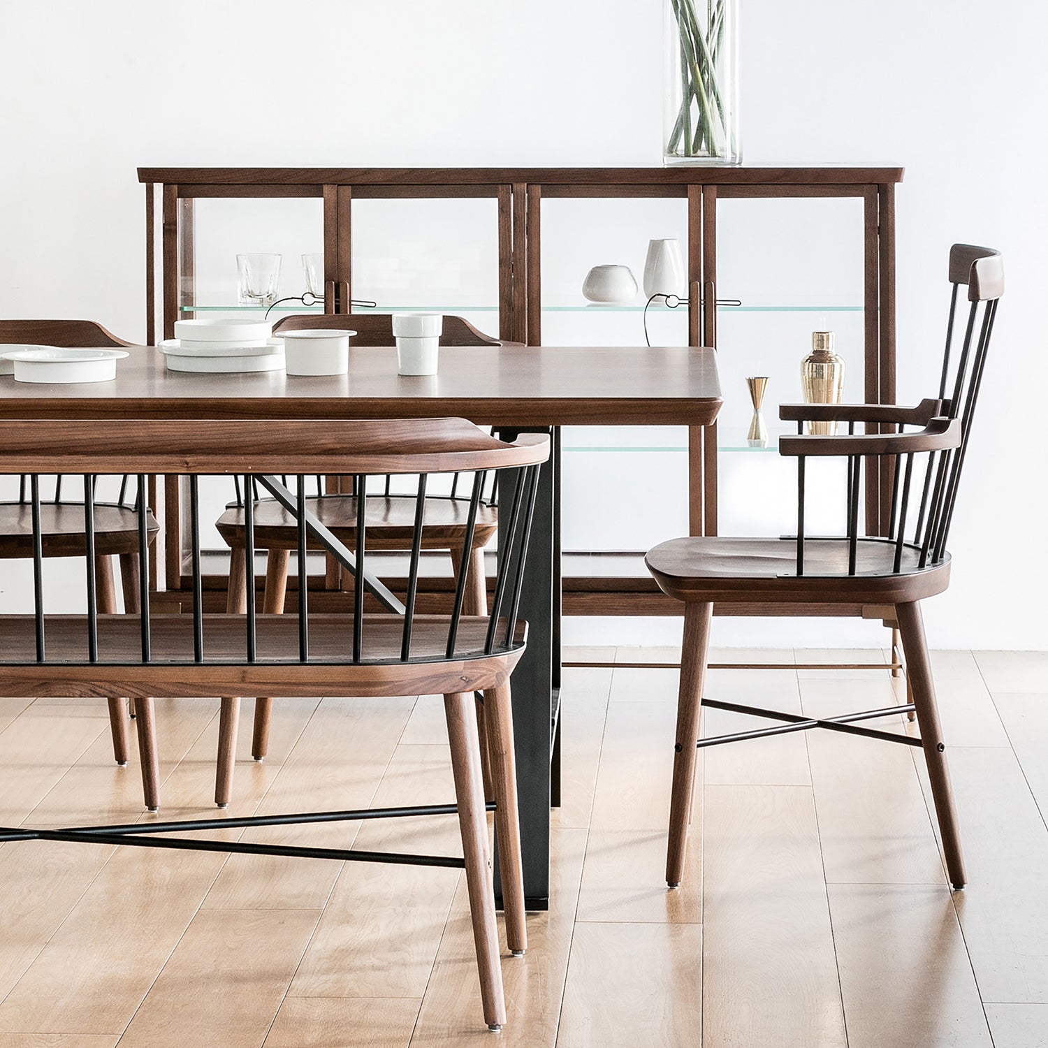 This highback version of designer Jun Aizaki's Exchange dining series further heightens the effect of replacing the traditional wood spindles of a Windsor chair with cutting-edge blackened steel. The Williamsburg-based founder of Brooklyn studio Crème takes a timeless furnishing and positions it firmly in a contemporary design idiom with this model in solid walnut and the steel. And the higher backrest also extends the seating's comfort level for leisurely mealtime conversations.