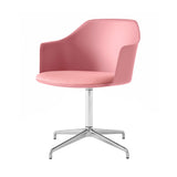A swivel base in polished aluminum adds extra shine as well as practical utility to Hee Welling’s sustainable shell armchair with a custom-upholstered seat. Rely's molded shell is made from 100% recycled plastic, with contours that curve around the body comfortably and extend out along the side to provide optimal back support. Choose from fine textile and leather selections for the foam-fill cushion, to pair with &Tradition's range of chair options in neutral tones or select accent hues.