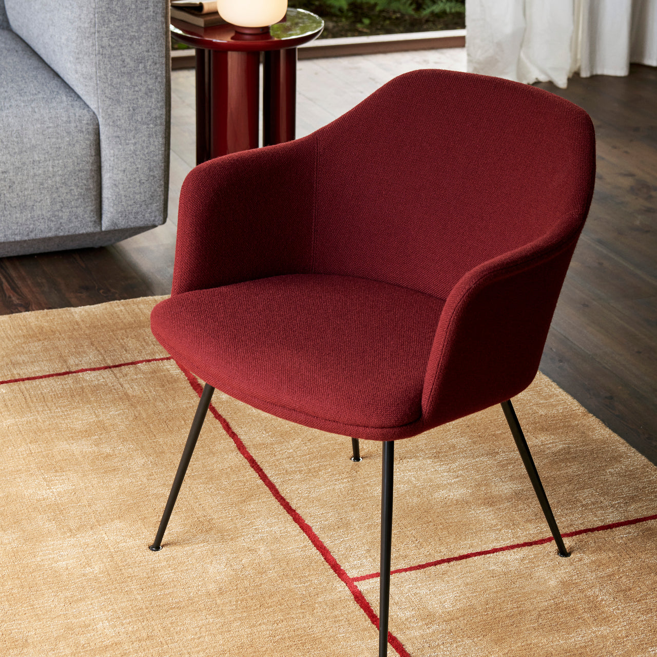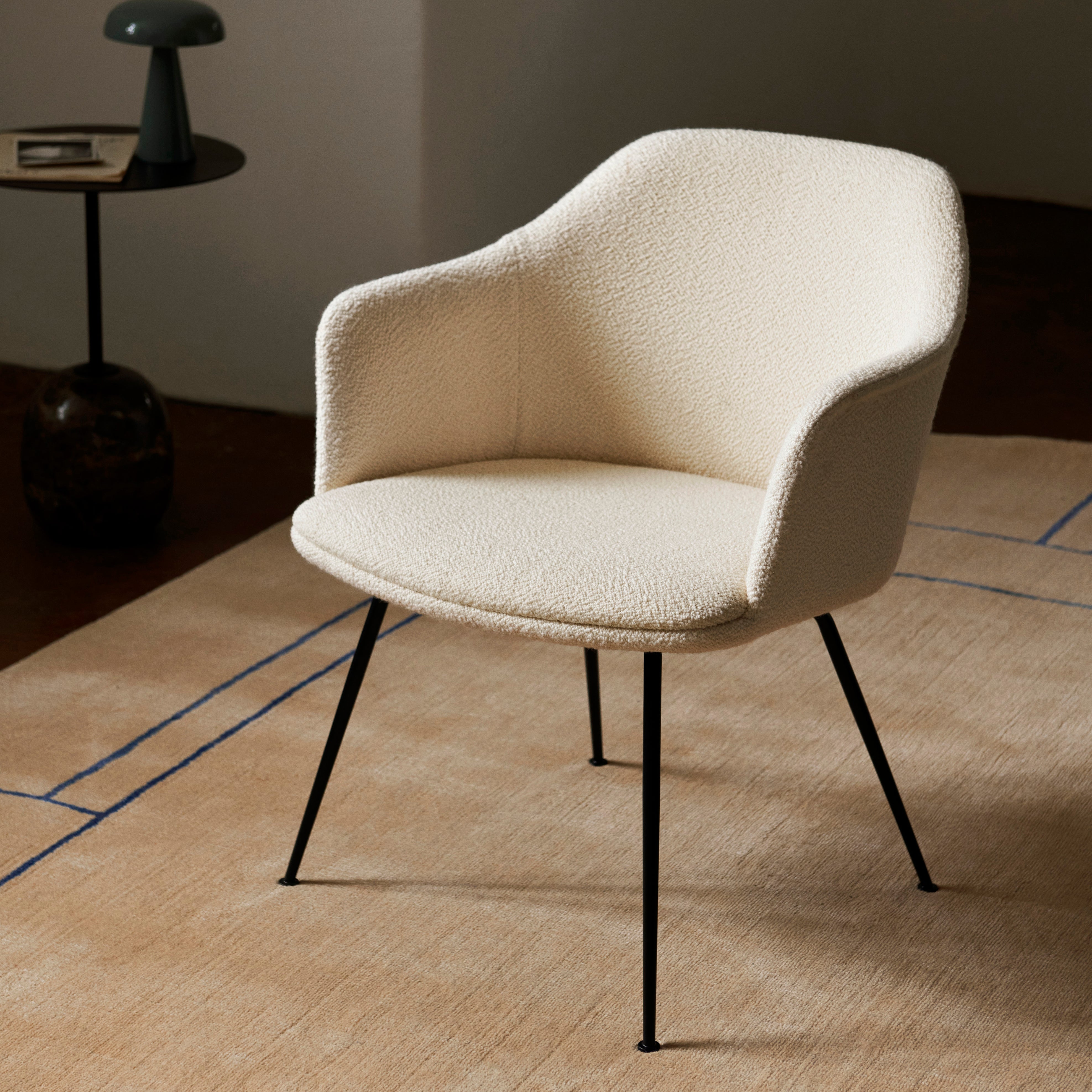 The Rely Lounge Chair HW105 by &Tradition features a fully upholstered shell made from 100% recycled polypropylene, emphasizing sustainability. Its splayed steel tube legs ensure stability and a clean, minimalist look. Designed for ergonomic comfort, it is well-suited for both private and public spaces. The chair is offered in various colors and upholstery options and adapts to different interior settings.