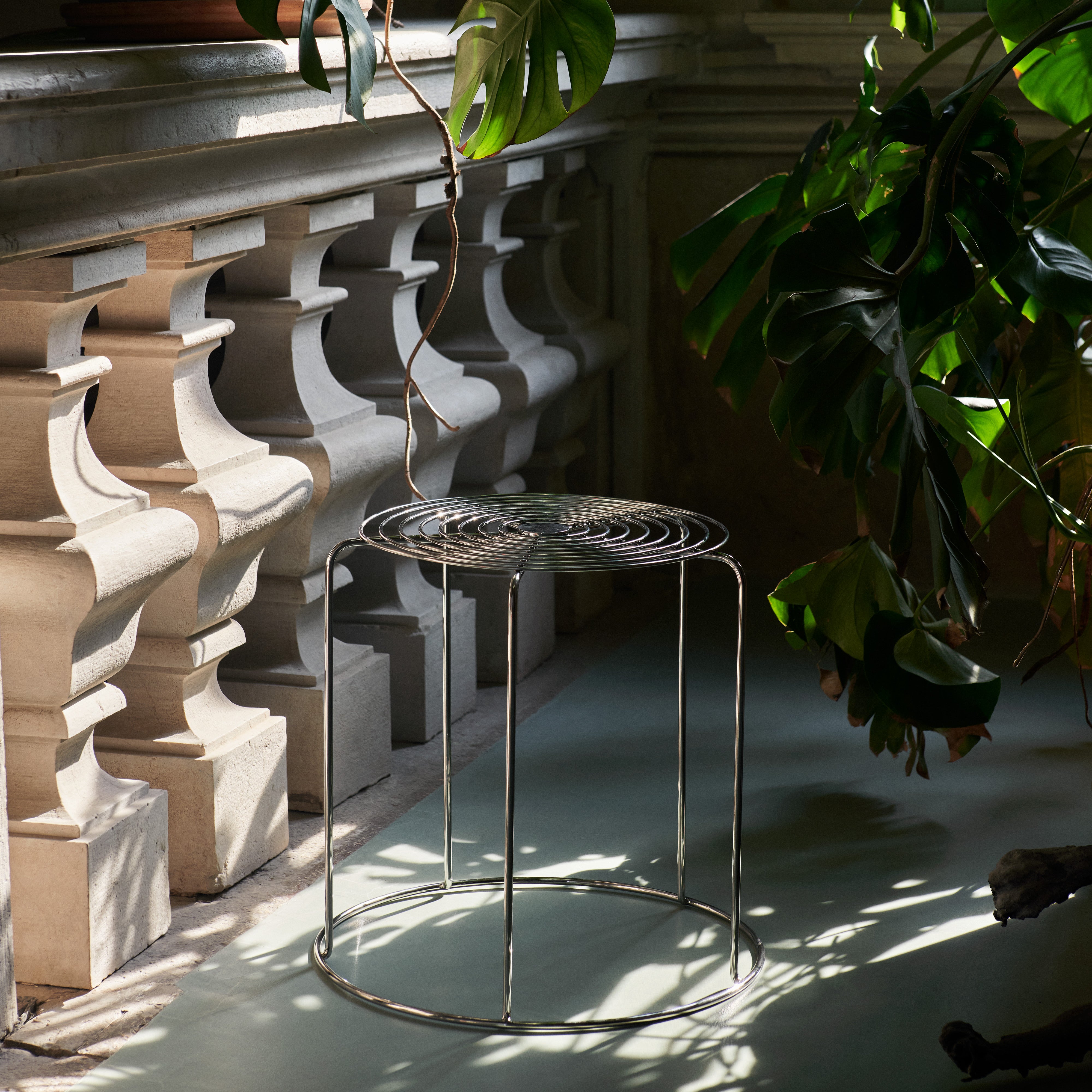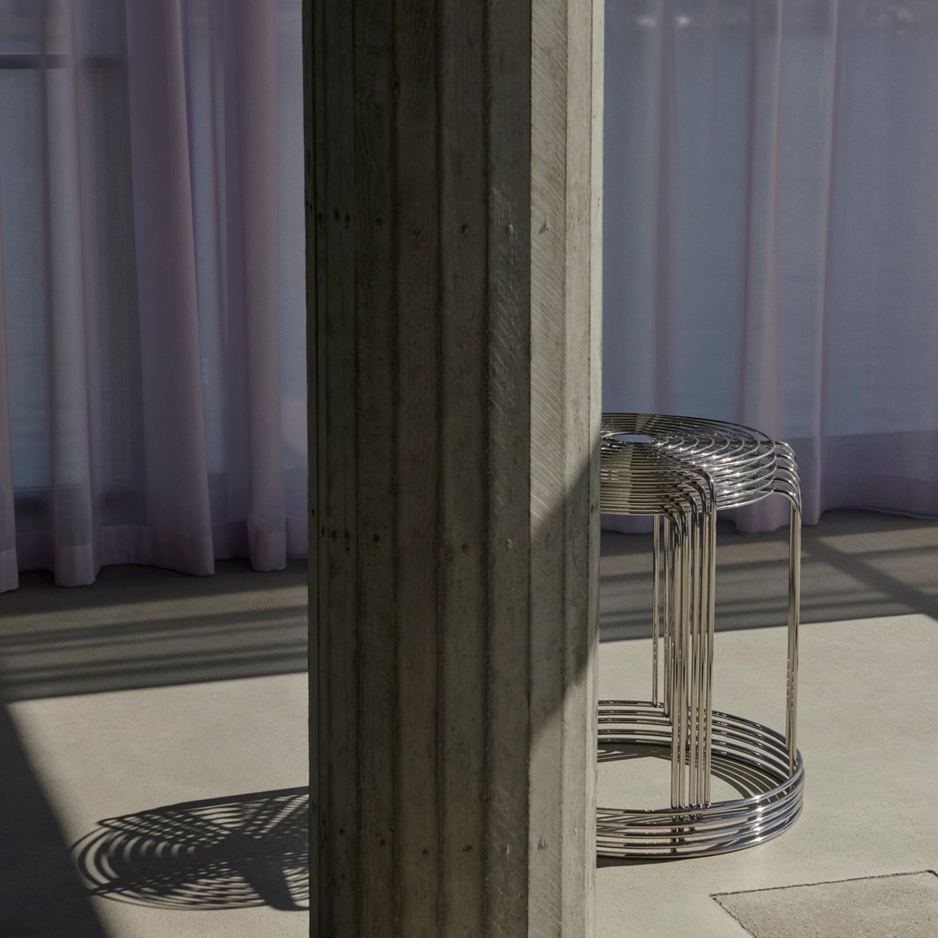 The Wire Stool is an iconic piece designed by Verner Panton, renowned for his innovative use of materials and geometric designs. This stool is crafted from stainless steel wire, forming a simple yet striking geometric pattern. Its stackable nature not only saves space but also creates a visually appealing graphic when multiple stools are stacked together. The airy, transparent design makes it a versatile addition to various settings, functioning equally well as a stool or a side table.